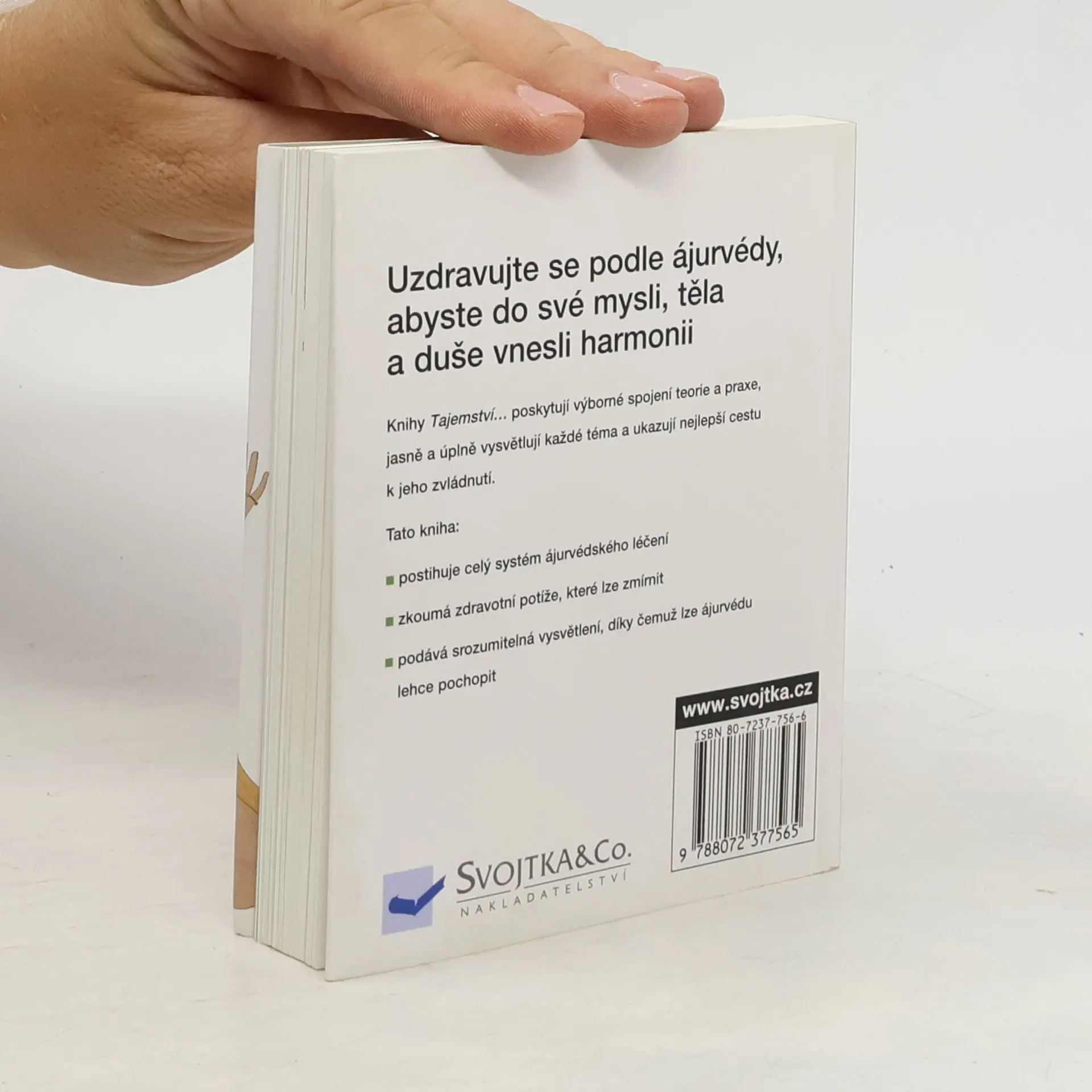 Popis indické léčebné metody nazývané ájurvéda, jejích filozofických principů, historických kořenů i jejího využití v alternativní medicíně. Publikace je dalším svazkem edice Tajemství a je věnována tradičnímu systému léčebné praxe v Indii a na Srí Lance. Autor seznamuje s dlouholetou historií árujvédy, vysvětluje princip jednoty těla a ducha, které jsou pro zdraví nezbytné a popisuje metodu vedoucí k určení vlastní ájurvédské konstituce i léčebné postupy vhodné pro daný konstituční typ. Poslední kapitola je věnovaná stravě a základním cvikům jógy, jako nedílným součástem této léčebné metody. Kniha je bohatě doplněna instruktážními nákresy a barevnými fotografiemi. Připojen výkladový slovníček odborných termínů, rejstřík pojmů a soupis adres webových stránek, na kterých čtenář nalezne informace o ájurvédě.