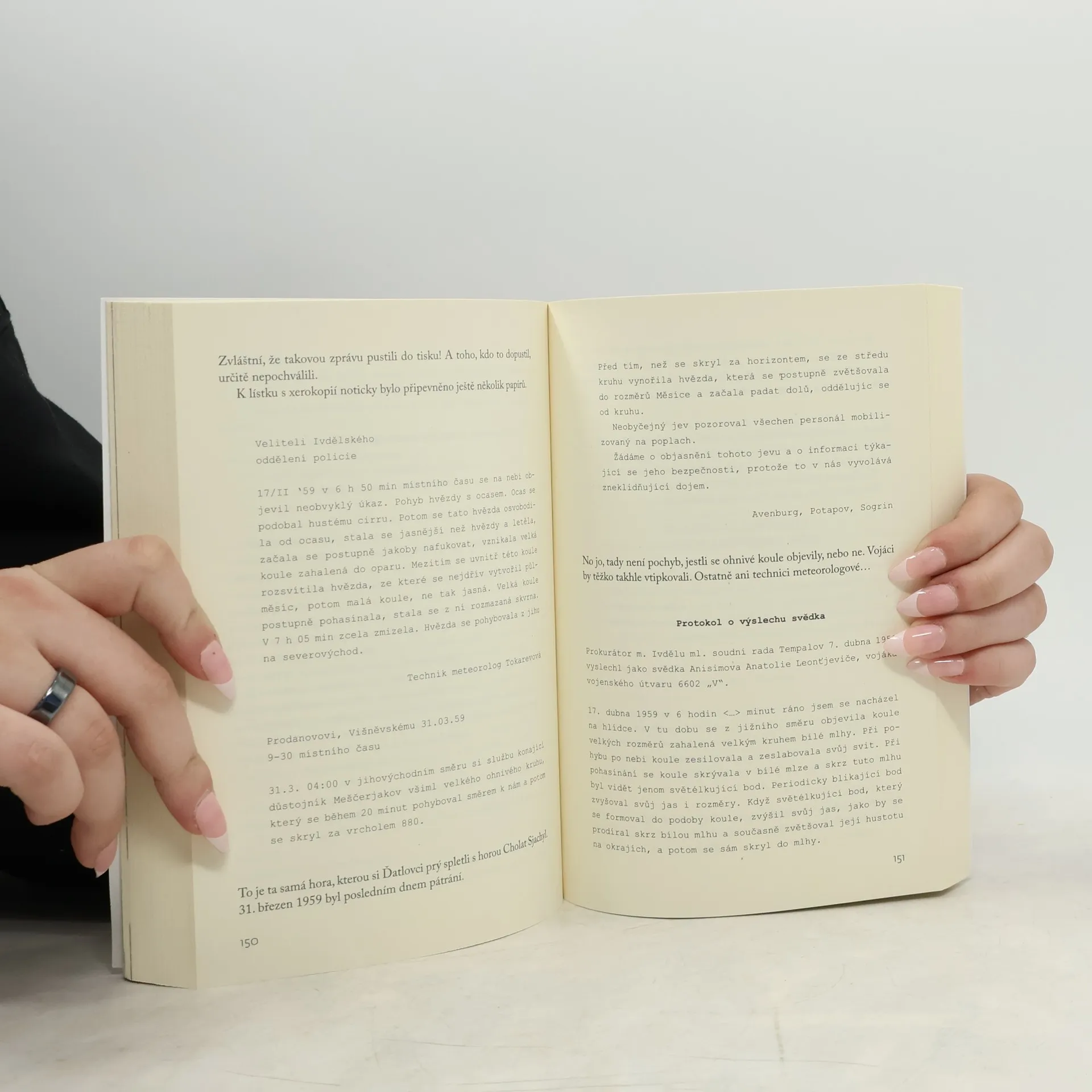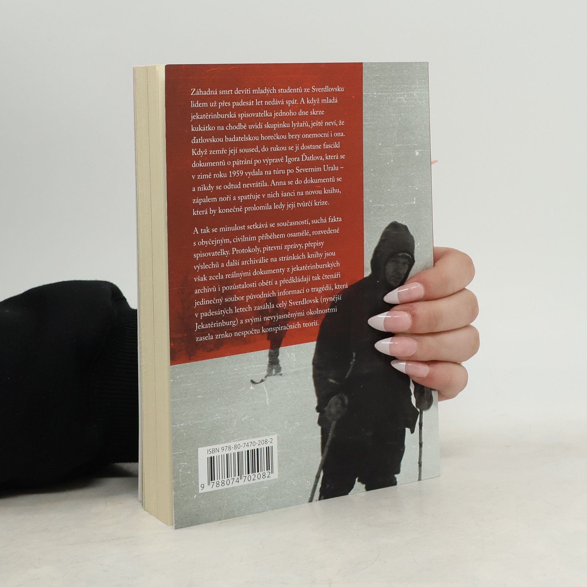 Záhadná smrt devíti mladých studentů ze Sverdlovsku lidem už přes padesát let nedává spát. A když mladá jekatěrinburská spisovatelka jednoho dne skrze kukátko na chodbě uvidí skupinku lyžařů, ještě neví, že ďatlovovskou badatelskou horečkou brzy onemocní i ona. Když zemře její soused, do rukou se jí dostane fascikl dokumentů o pátrání po výpravě Igora Ďatlova, která se v zimě roku 1959 vydala na túru po Severním Uralu – a nikdy se odtud nevrátila. Anna se do dokumentů se zápalem noří a spatřuje v nich šanci na novou knihu, která by konečně prolomila ledy její tvůrčí krize. A tak se minulost setkává se současností, suchá fakta s obyčejným, civilním příběhem osamělé, rozvedené spisovatelky. Protokoly, pitevní zprávy, přepisy výslechů a další archiválie na stránkách knihy jsou však zcela reálnými dokumenty z jekatěrinburských archivů i pozůstalosti obětí a předkládají tak čtenáři jedinečný soubor původních informací o tragédii, která v padesátých letech zasáhla celý Sverdlovsk (nynější Jekatěrinburg) a svými nevyjasněnými okolnostmi zasela zrnko nespočtu konspiračních teorií. – Kniha vychází za podpory moskevského Institutu překladu.