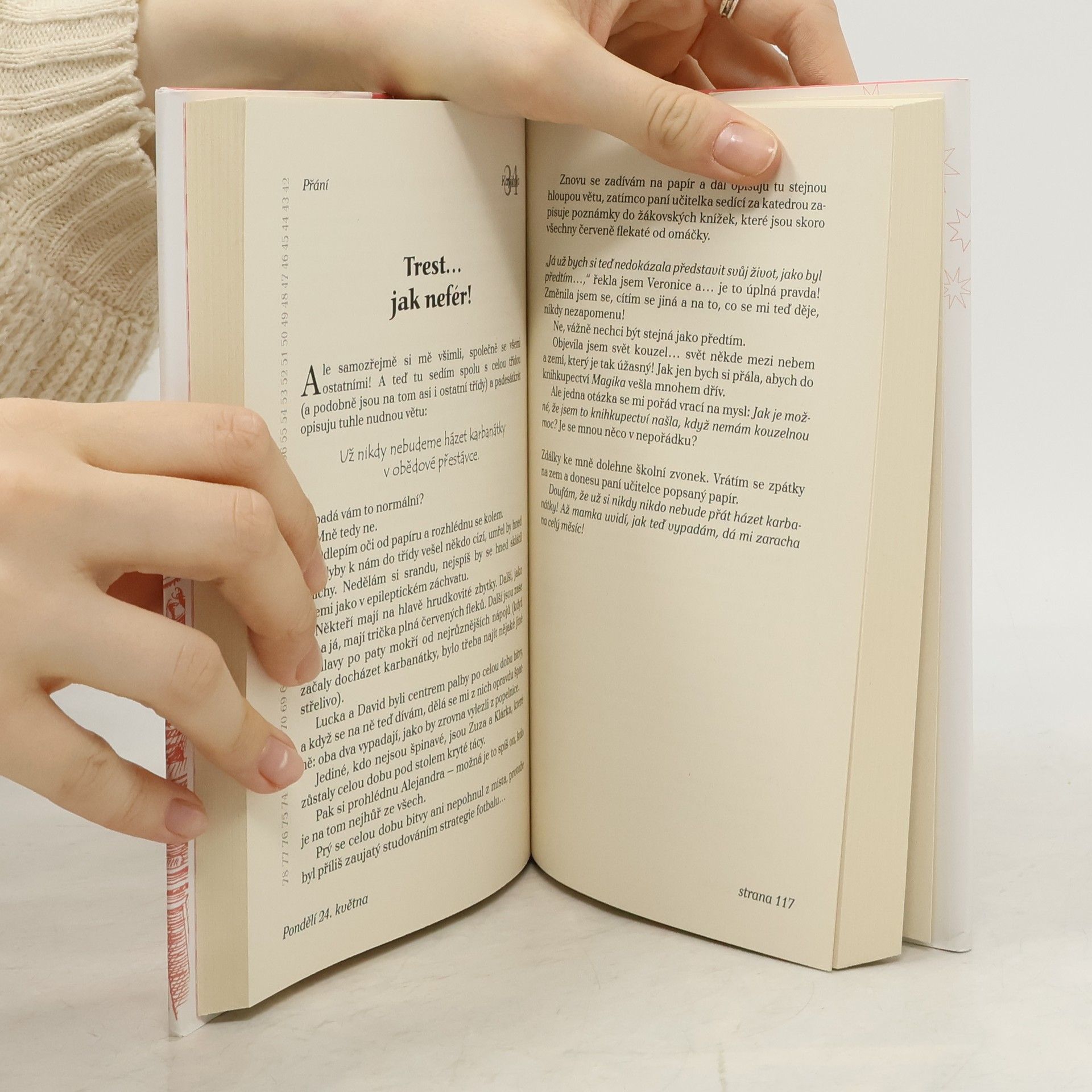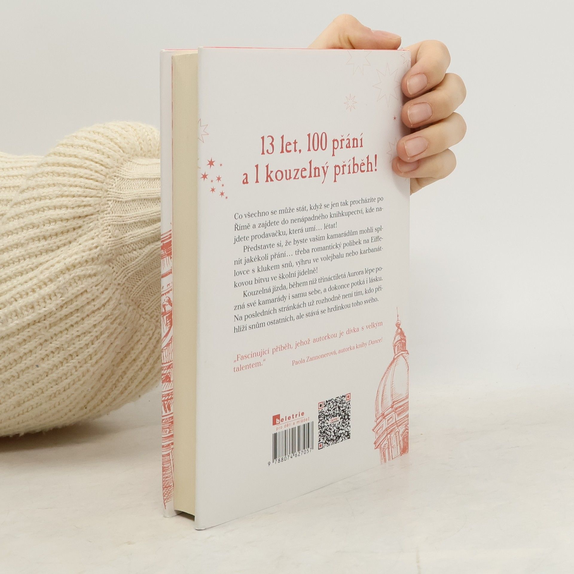 Je nedělení odpoledne a skoro třináctiletá Aurora Bílá právě vešla do knihkupectví, jehož prodavačka umí… létat! A nejen to, taky čarovat! Aurora díky ní zjistí, že pod jejím milovaným městem Římem se nachází vedení světa kouzel, a aby o něm nikomu neřekla, dostane od jeho královny velkolepý dar: 100 přání! Devadesát devět z nich však musí splnit ostatním a jen to poslední může být její. Aurořin život, předtím poklidný a plný knížek, se obrátí vzhůru nohama a nic už není jako dřív. Kvůli bláznivým přáním kamarádů a zákeřným přáním mladšího bratra se dostává z jednoho průšvihu do druhého, čeká ji domácí vězení i karbanátková bitva ve školní jídelně, ale také magický výlet do Paříže, spousta legrace a možná i první láska… Co si asi bude Aurora v závěru tohoto kouzelného dobrodružství přát? Bude dál jenom přihlížet snům ostatních, nebo se stane hrdinkou toho svého? Co všechno se může stát, když se jen tak procházíte po Římě a zajdete do nenápadného knihkupectví, kde najdete prodavačku, která umí… létat!