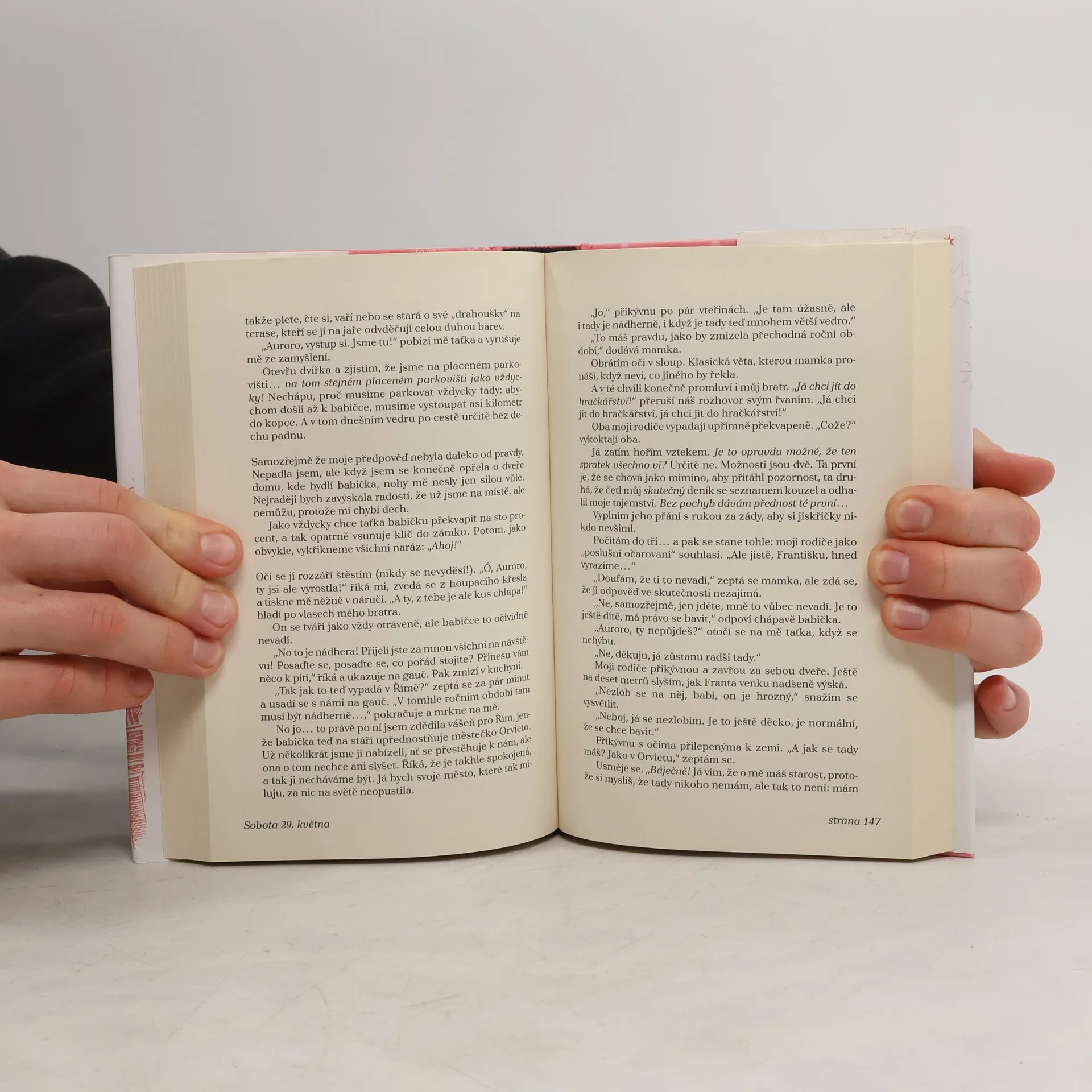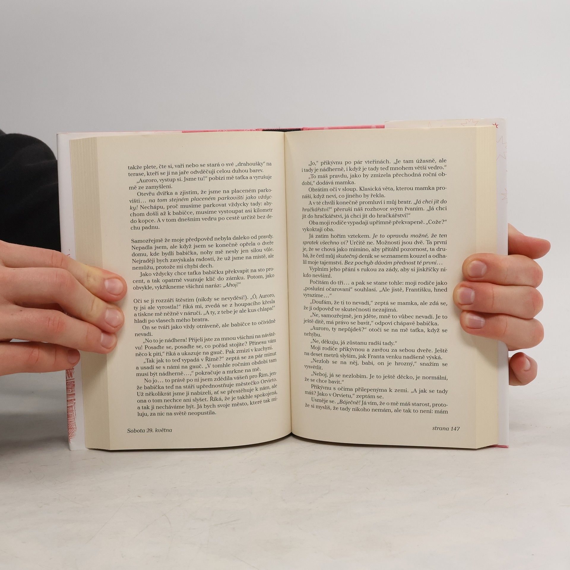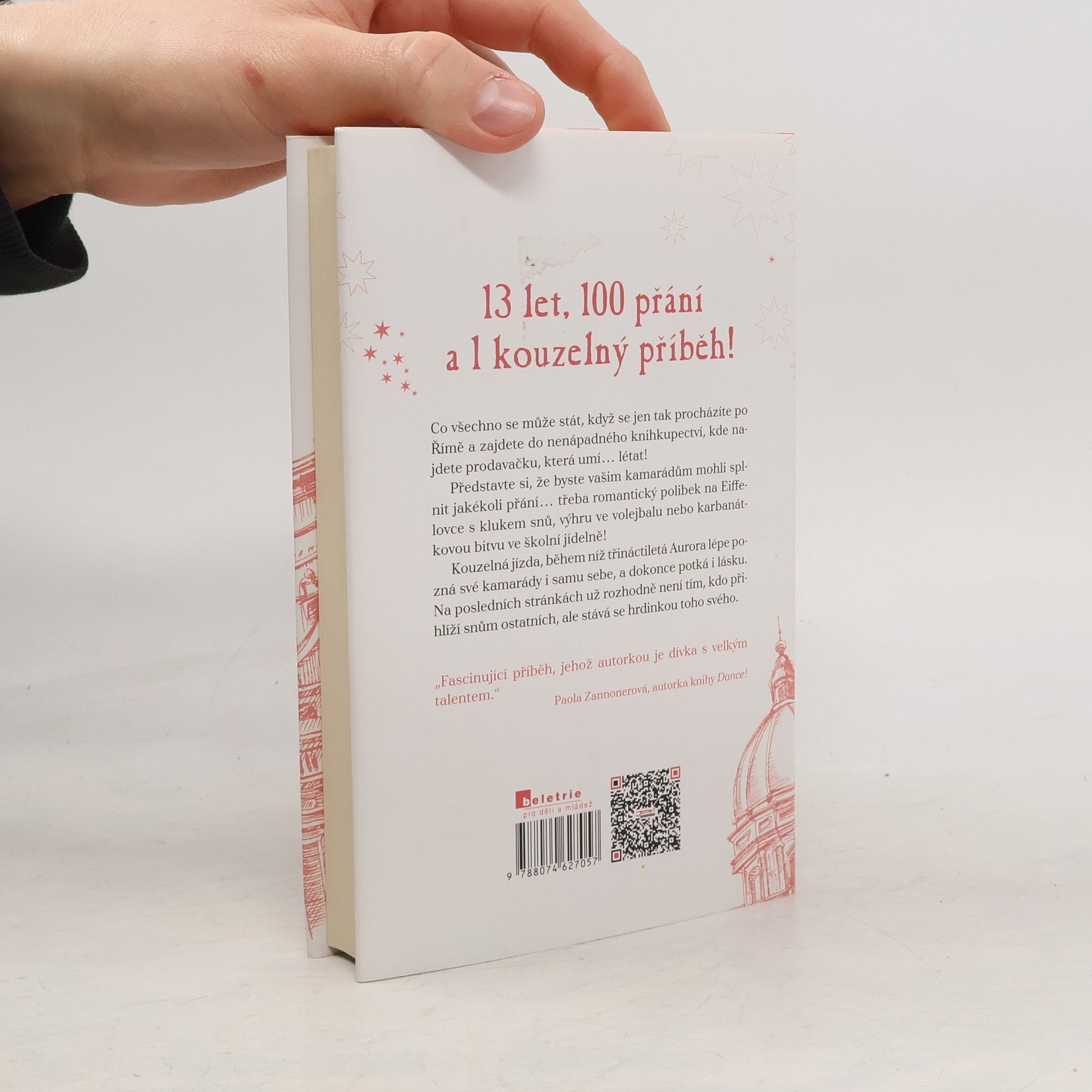 Je nedělení odpoledne a skoro třináctiletá Aurora Bílá právě vešla do knihkupectví, jehož prodavačka umí… létat! A nejen to, taky čarovat! Aurora díky ní zjistí, že pod jejím milovaným městem Římem se nachází vedení světa kouzel, a aby o něm nikomu neřekla, dostane od jeho královny velkolepý dar: 100 přání! Devadesát devět z nich však musí splnit ostatním a jen to poslední může být její. Aurořin život, předtím poklidný a plný knížek, se obrátí vzhůru nohama a nic už není jako dřív. Kvůli bláznivým přáním kamarádů a zákeřným přáním mladšího bratra se dostává z jednoho průšvihu do druhého, čeká ji domácí vězení i karbanátková bitva ve školní jídelně, ale také magický výlet do Paříže, spousta legrace a možná i první láska… Co si asi bude Aurora v závěru tohoto kouzelného dobrodružství přát? Bude dál jenom přihlížet snům ostatních, nebo se stane hrdinkou toho svého? Co všechno se může stát, když se jen tak procházíte po Římě a zajdete do nenápadného knihkupectví, kde najdete prodavačku, která umí… létat!
