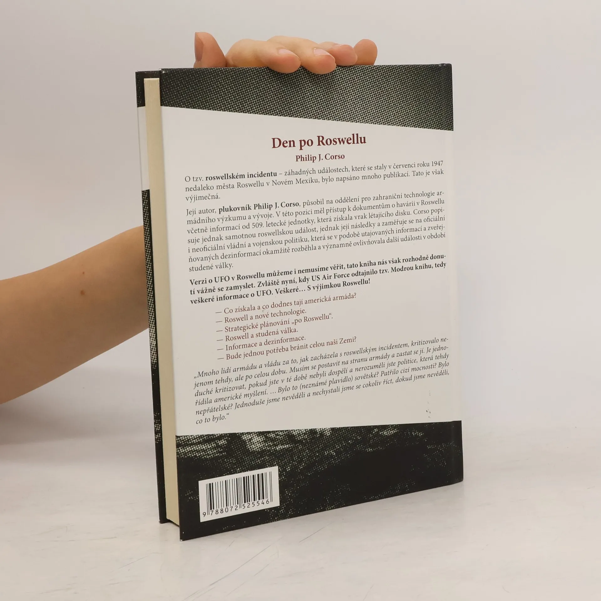 Svědectví plukovníka US Army o tzv. roswellském incidentu – záhadných událostech, které se staly v červenci roku 1947 nedaleko města Roswellu v Novém Mexiku, bylo napsáno mnoho publikací. Tato je však výjimečná. Její autor, plukovník Philip J. Corso, působil v Oddělení pro zahraniční technologie a armádního výzkumu a vývoje. V této pozici měl přístup k dokumentům o havárii v Roswellu včetně informací od 509. letecké jednotky, která získala vrak létajícího disku. Corso popisuje jednak samotnou roswellskou událost, jednak její následky a zaměřuje se na oficiální i neoficiální vládní a vojenskou politiku, která se v podobě utajovaných informací a zveřejňovaných dezinformací okamžitě rozběhla a významně ovlivňovala další události v období studené války. Verzi o UFO v Roswellu můžeme i nemusíme věřit, tato kniha nás však rozhodně donutí se vážně zamyslet. Zvláště nyní, kdy US Air Force odtajnilo tzv. Modrou knihu, tedy veškeré informace o UFO. Veškeré... S výjimkou Roswellu! – Co získala a co dodnes tají americká armáda? – Roswell a nové technologie. – Strategické plánování „po Roswellu“. – Roswell a studená válka. – Informace a desinformace. – Bude jednou potřeba bránit celou naši Zemi?
