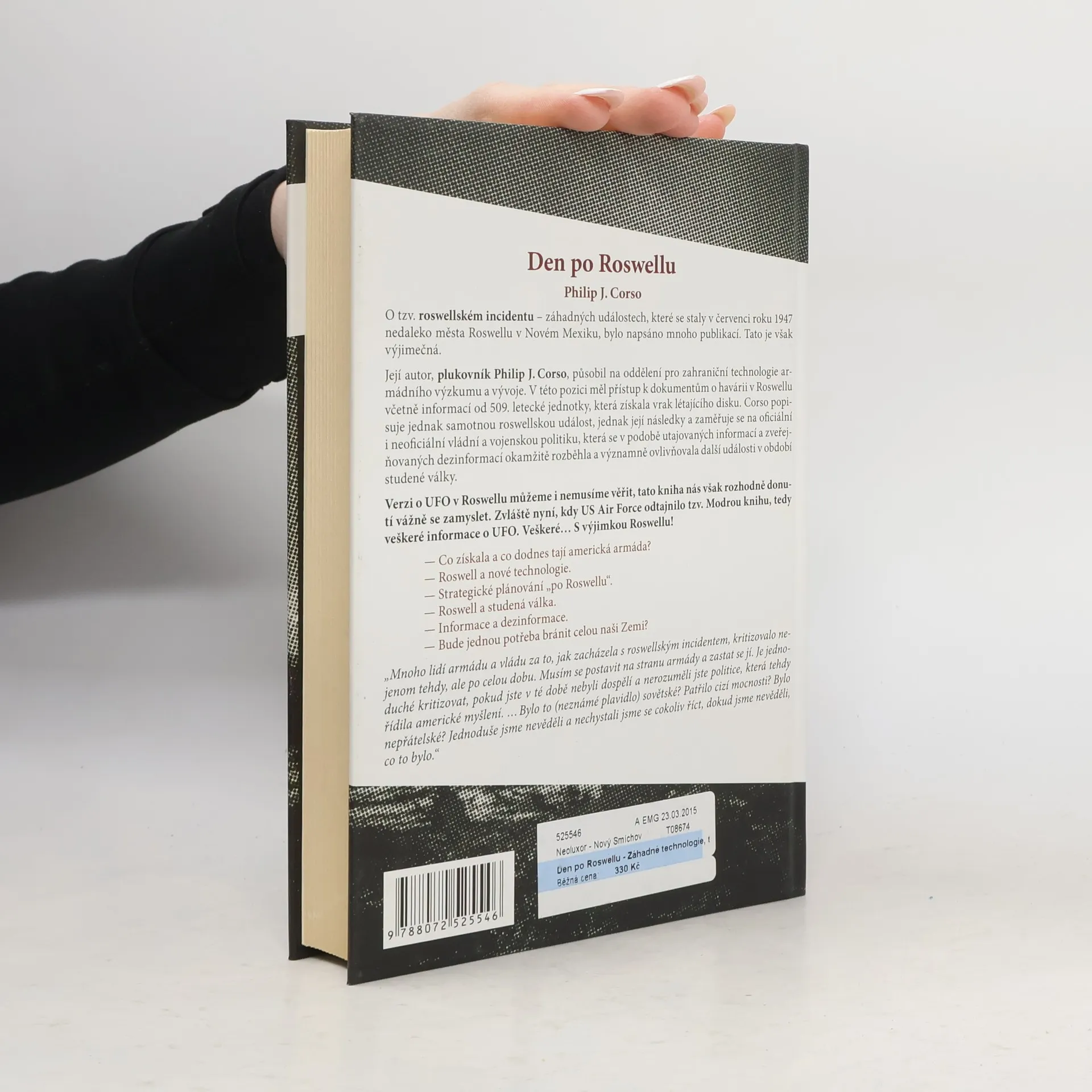 Svědectví plukovníka US Army o tzv. roswellském incidentu – záhadných událostech, které se staly v červenci roku 1947 nedaleko města Roswellu v Novém Mexiku, bylo napsáno mnoho publikací. Tato je však výjimečná. Její autor, plukovník Philip J. Corso, působil v Oddělení pro zahraniční technologie a armádního výzkumu a vývoje. V této pozici měl přístup k dokumentům o havárii v Roswellu včetně informací od 509. letecké jednotky, která získala vrak létajícího disku. Corso popisuje jednak samotnou roswellskou událost, jednak její následky a zaměřuje se na oficiální i neoficiální vládní a vojenskou politiku, která se v podobě utajovaných informací a zveřejňovaných dezinformací okamžitě rozběhla a významně ovlivňovala další události v období studené války. Verzi o UFO v Roswellu můžeme i nemusíme věřit, tato kniha nás však rozhodně donutí se vážně zamyslet. Zvláště nyní, kdy US Air Force odtajnilo tzv. Modrou knihu, tedy veškeré informace o UFO. Veškeré... S výjimkou Roswellu! – Co získala a co dodnes tají americká armáda? – Roswell a nové technologie. – Strategické plánování „po Roswellu“. – Roswell a studená válka. – Informace a desinformace. – Bude jednou potřeba bránit celou naši Zemi?