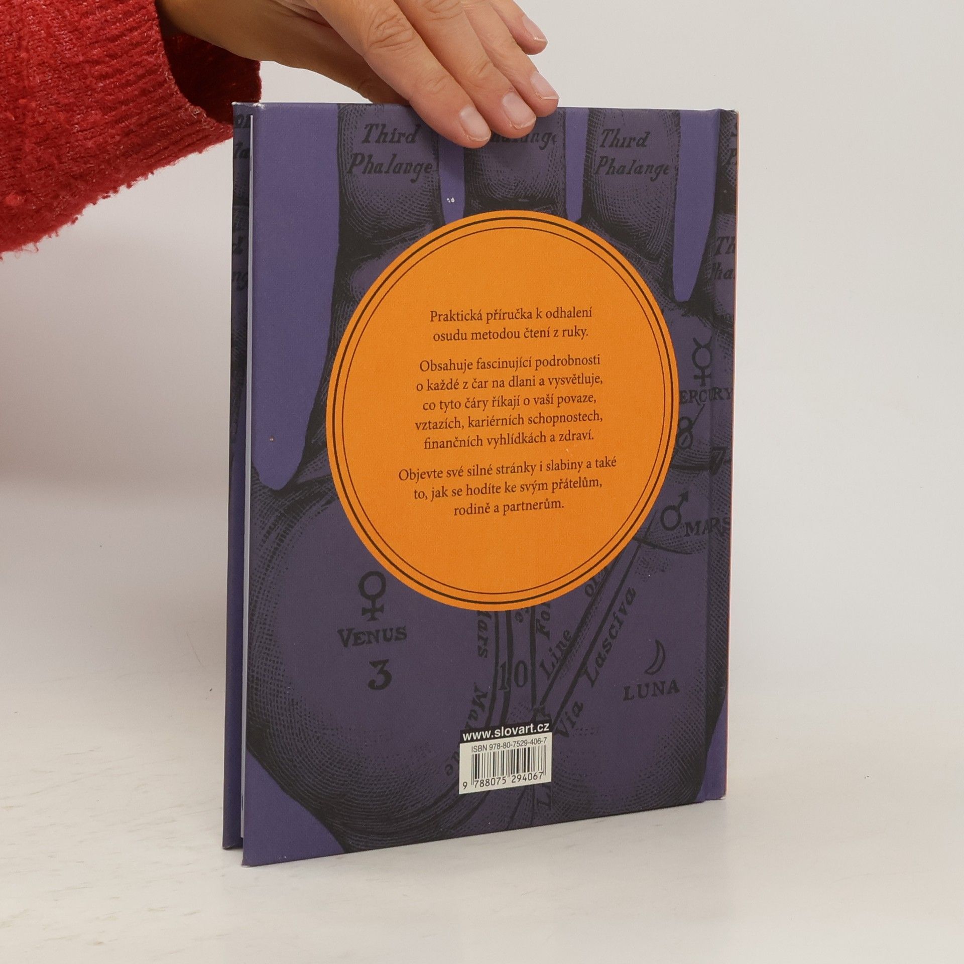Praktická příručka pro výklad osudu metodou čtení z ruky obsahuje fascinujicí podrobnosti o každé z čar na dlani a vysvětluje, co tyto čáry říkají o naší povaze, vztazích, kariérních schopnostech, finančních vyhlídkách a zdraví. Pomáhá odhalit silné stránky i slabiny osobnosti a díky tomu pochopit, jací jsme a co bychom měli dělat, abychom byli šťastní.