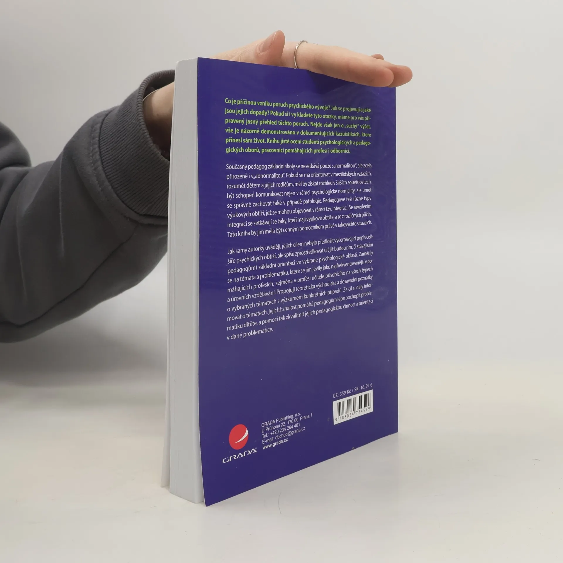Současný pedagog základní školy se nesetkává pouze s „normalitou“, ale zcela přirozeně i s „abnormalitou“. Pokud se má orientovat v mezilidských vztazích, rozumět dětem a jejich rodičům, měl by získat rozhled v širších souvislostech, být schopen komunikovat nejen v rámci psychologické normality, ale umět se správně zachovat také v případě patologie. Pedagogové řeší různé typy výukových obtíží, jež se mohou objevovat v rámci tzv. integrací. Se zavedením se setkávají se žáky, kteří mají výukové obtíže, a to z rozličných příčin. Tato kniha by jim měla být cenným pomocníkem právě v takovýchto situacích. Jak samy autorky uvádějí, jejich cílem nebylo předložit vyčerpávající popis celé šíře psychických obtíží, ale spíše zprostředkovat (ať již budoucím, či stávajícím pedagogům) základní orientaci ve vybrané psychologické oblasti. Zaměřily se na témata a problematiku, které se jim jevily jako nejfrekventovanější v pomáhajících profesích, zejména v profesi učitele působícího na všech typech a úrovních vzdělávání. Propojují teoretická východiska a dosavadní poznatky o vybraných tématech s výzkumem konkrétních případů. Za cíl si daly informovat o tématech, jejichž znalost pomáhá pedagogům lépe pochopit problematiku dítěte, a pomoci tak zkvalitnit jejich pedagogickou činnost a orientaci v dané problematice.