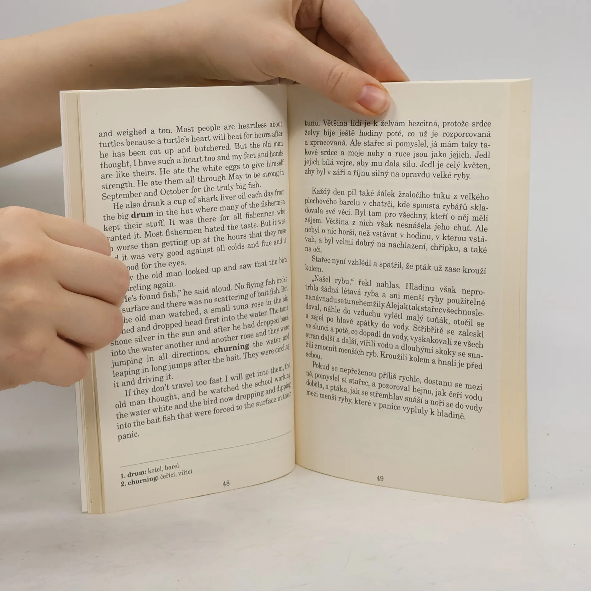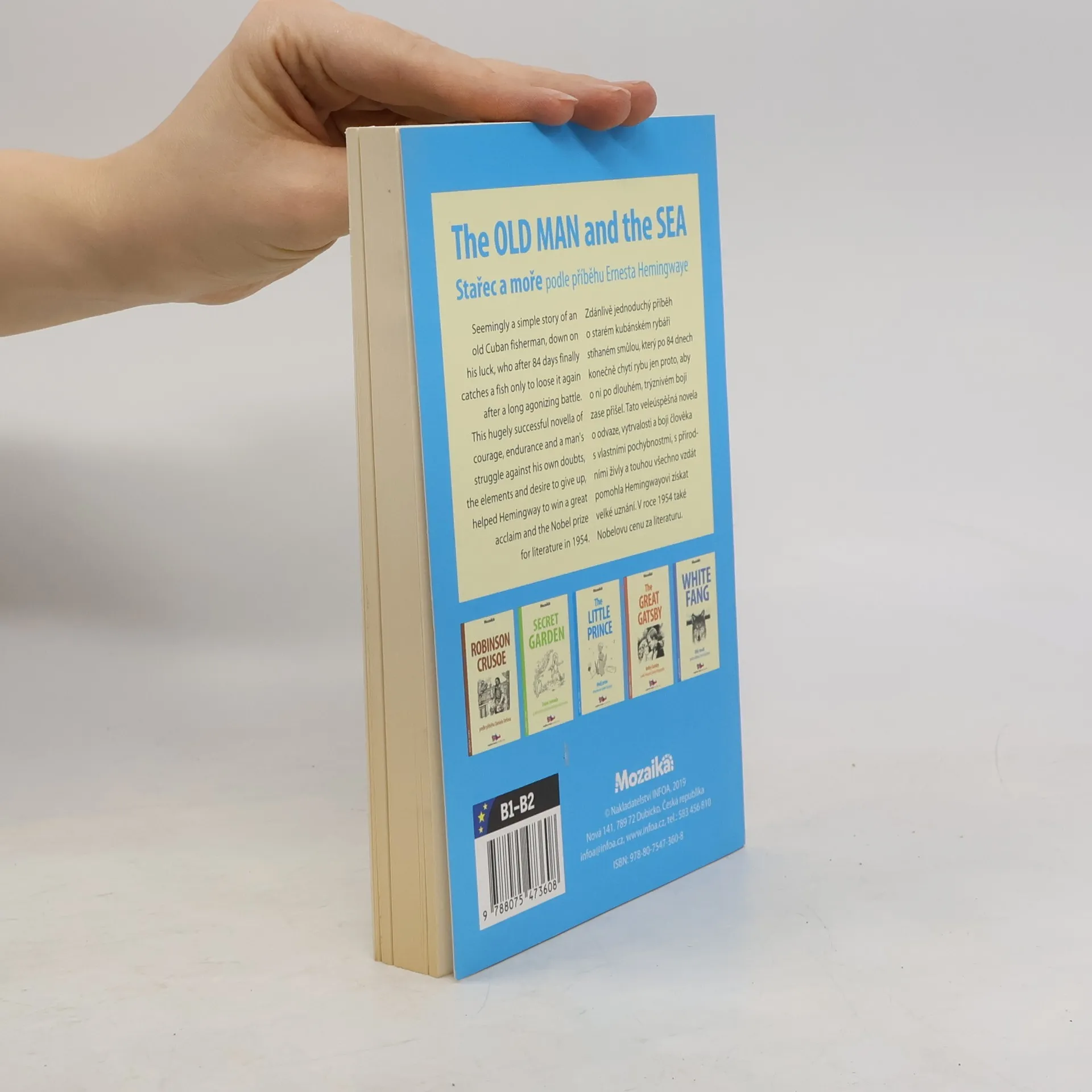 Anglicko-český zrcadlový text (B1-B2). Zdánlivě jednoduchý příběh o starém kubánském rybáři stíhaném smůlou, který po 84 dnech konečně chytí rybu jen proto, aby o ni po dlouhém, trýznivém boji zase přišel. Tato veleúspěšná novela o odvaze, vytrvalosti a boji člověka s vlastními pochybnostmi, s přírodními živly a touhou všechno vzdát pomohla Hemingwayovi získat velké uznání. V roce 1954 také Nobelovu cenu za literaturu.