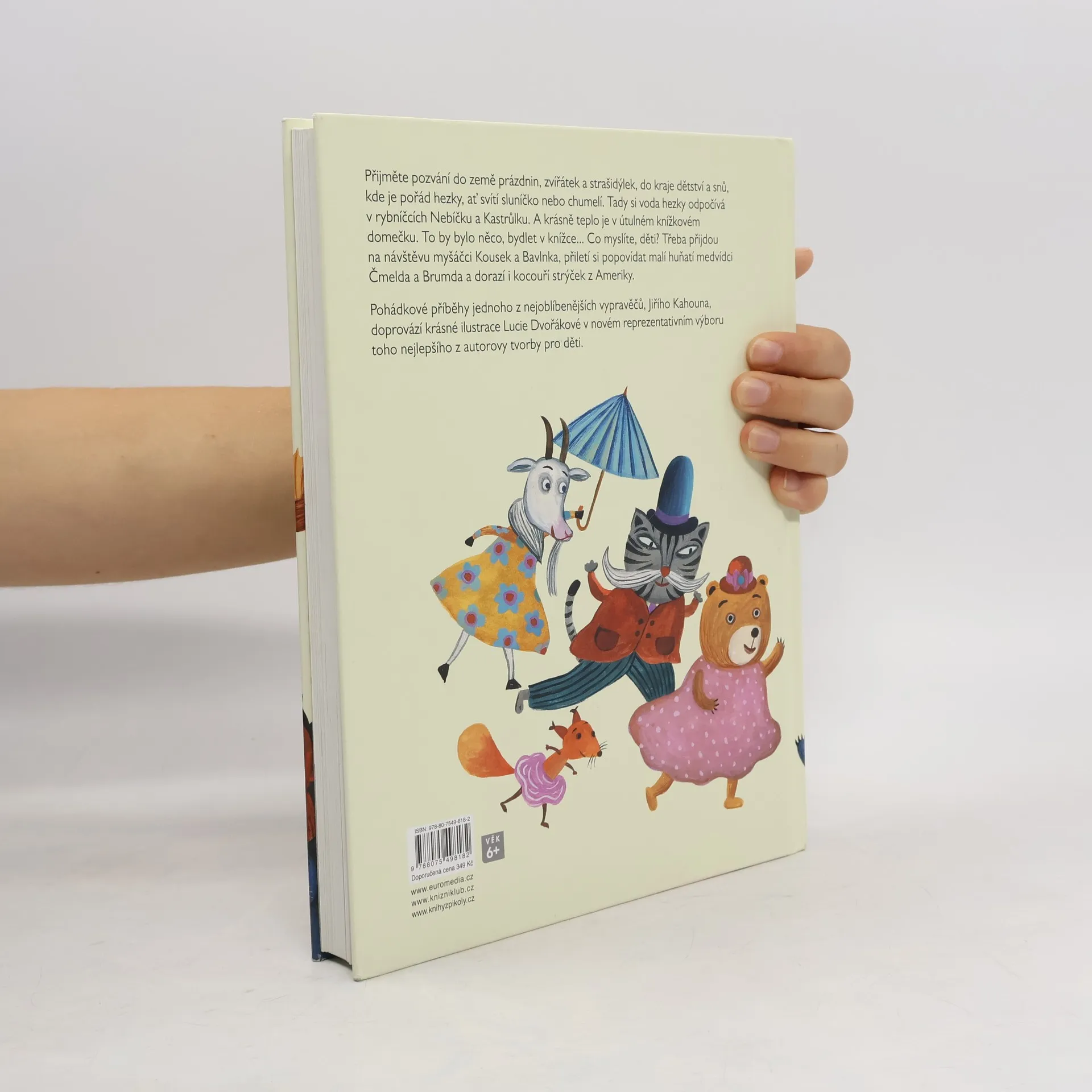 Nejkrásnější příběhy Jiřího Kahouna. Za devatero horami a devatero lesy, daleko, předaleko, ale vlastně jen co by kamenem dohodil, se rozkládá překrásný kraj. Dá se do něj dojít pěšky, s ruksakem na zádech, nebo dojet kodrcajícím vláčkem. Je to země prázdnin, zvířátek a strašidýlek, kraj dětství a snů, kde je pořád hezky, ať svítí sluníčko nebo chumelí. V jednom ze zdejších lesů stojí mohutný vykotlaný strom a vedle stromu židle sroubené ze smrkových kmínků. Kdybyste se sem náhodou přece jen dostali a měli štěstí, uvidíte tam vysedávat dědečka. Chvilku vedle něj poseďte a počkejte, až dobafá z fajfky. Pak se ozve zaskřípání a vy s překvapením zjistíte, že v mohutném kmeni jsou malá dvířka. A věřte nevěřte, jsou to dvířka do pohádky. Nejkrásnější pohádkové příběhy jednoho z nejoblíbenějších vypravěčů Jiřího Kahouha doprovází krásné a výpravné ilustrace Lucie Dvořákové v novém reprezentativním výboru toho nejlepšího z autorovy tvorby pro děti. Kniha je určena pro čtenáře od 6 let.