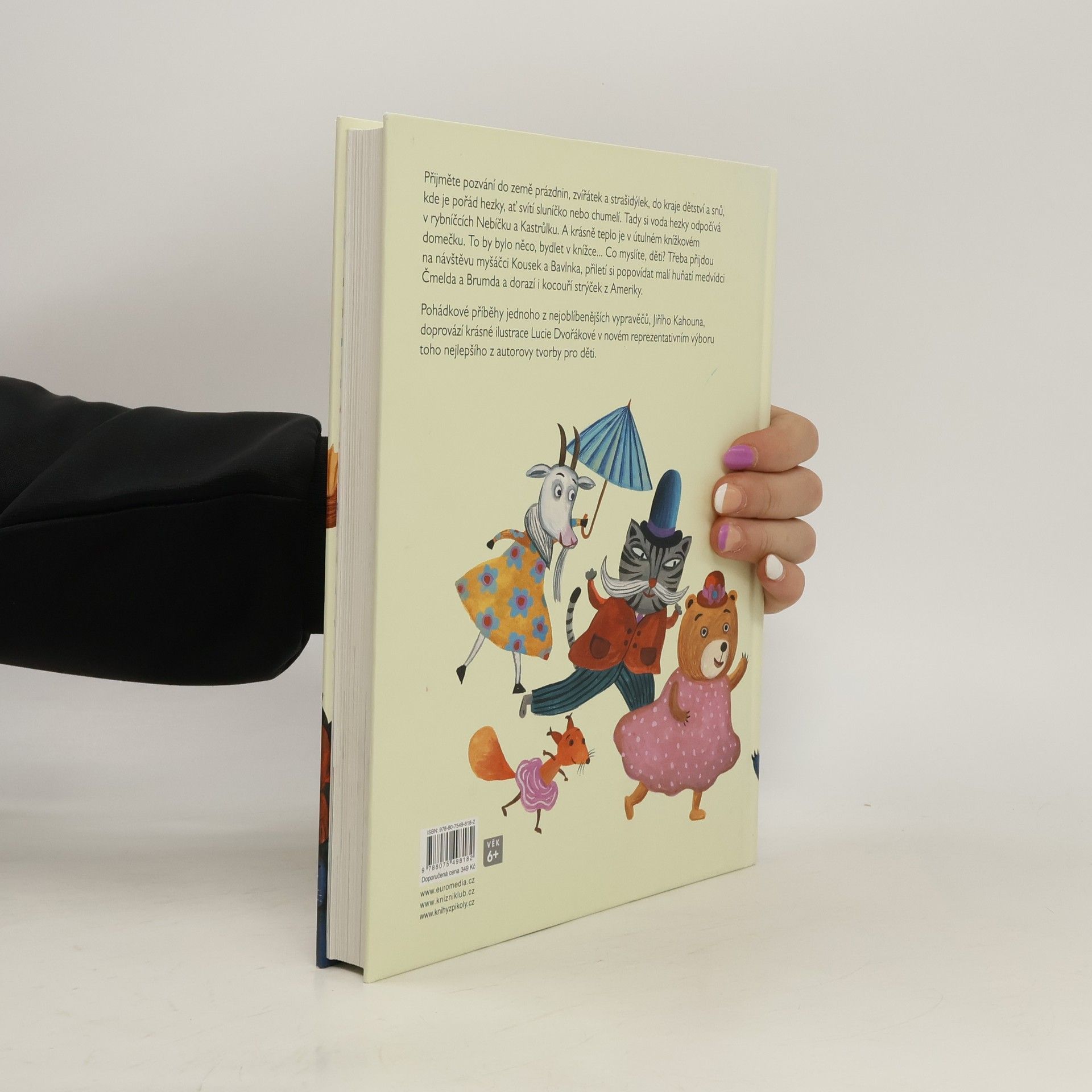 Nejkrásnější příběhy Jiřího Kahouna. Za devatero horami a devatero lesy, daleko, předaleko, ale vlastně jen co by kamenem dohodil, se rozkládá překrásný kraj. Dá se do něj dojít pěšky, s ruksakem na zádech, nebo dojet kodrcajícím vláčkem. Je to země prázdnin, zvířátek a strašidýlek, kraj dětství a snů, kde je pořád hezky, ať svítí sluníčko nebo chumelí. V jednom ze zdejších lesů stojí mohutný vykotlaný strom a vedle stromu židle sroubené ze smrkových kmínků. Kdybyste se sem náhodou přece jen dostali a měli štěstí, uvidíte tam vysedávat dědečka. Chvilku vedle něj poseďte a počkejte, až dobafá z fajfky. Pak se ozve zaskřípání a vy s překvapením zjistíte, že v mohutném kmeni jsou malá dvířka. A věřte nevěřte, jsou to dvířka do pohádky. Nejkrásnější pohádkové příběhy jednoho z nejoblíbenějších vypravěčů Jiřího Kahouha doprovází krásné a výpravné ilustrace Lucie Dvořákové v novém reprezentativním výboru toho nejlepšího z autorovy tvorby pro děti. Kniha je určena pro čtenáře od 6 let.