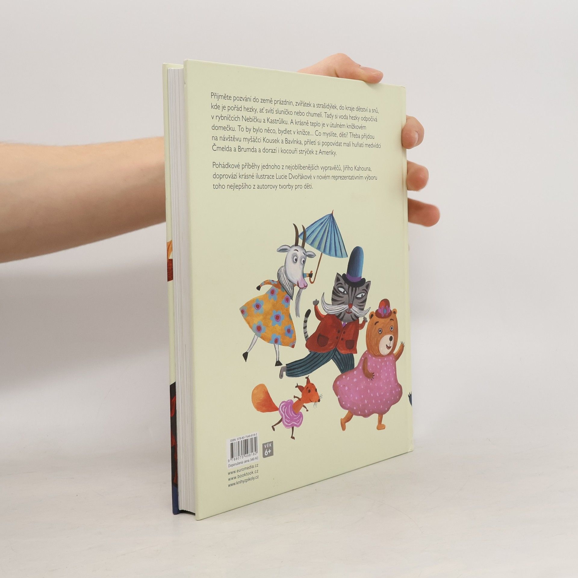 Nejkrásnější příběhy Jiřího Kahouna. Za devatero horami a devatero lesy, daleko, předaleko, ale vlastně jen co by kamenem dohodil, se rozkládá překrásný kraj. Dá se do něj dojít pěšky, s ruksakem na zádech, nebo dojet kodrcajícím vláčkem. Je to země prázdnin, zvířátek a strašidýlek, kraj dětství a snů, kde je pořád hezky, ať svítí sluníčko nebo chumelí. V jednom ze zdejších lesů stojí mohutný vykotlaný strom a vedle stromu židle sroubené ze smrkových kmínků. Kdybyste se sem náhodou přece jen dostali a měli štěstí, uvidíte tam vysedávat dědečka. Chvilku vedle něj poseďte a počkejte, až dobafá z fajfky. Pak se ozve zaskřípání a vy s překvapením zjistíte, že v mohutném kmeni jsou malá dvířka. A věřte nevěřte, jsou to dvířka do pohádky. Nejkrásnější pohádkové příběhy jednoho z nejoblíbenějších vypravěčů Jiřího Kahouha doprovází krásné a výpravné ilustrace Lucie Dvořákové v novém reprezentativním výboru toho nejlepšího z autorovy tvorby pro děti. Kniha je určena pro čtenáře od 6 let.