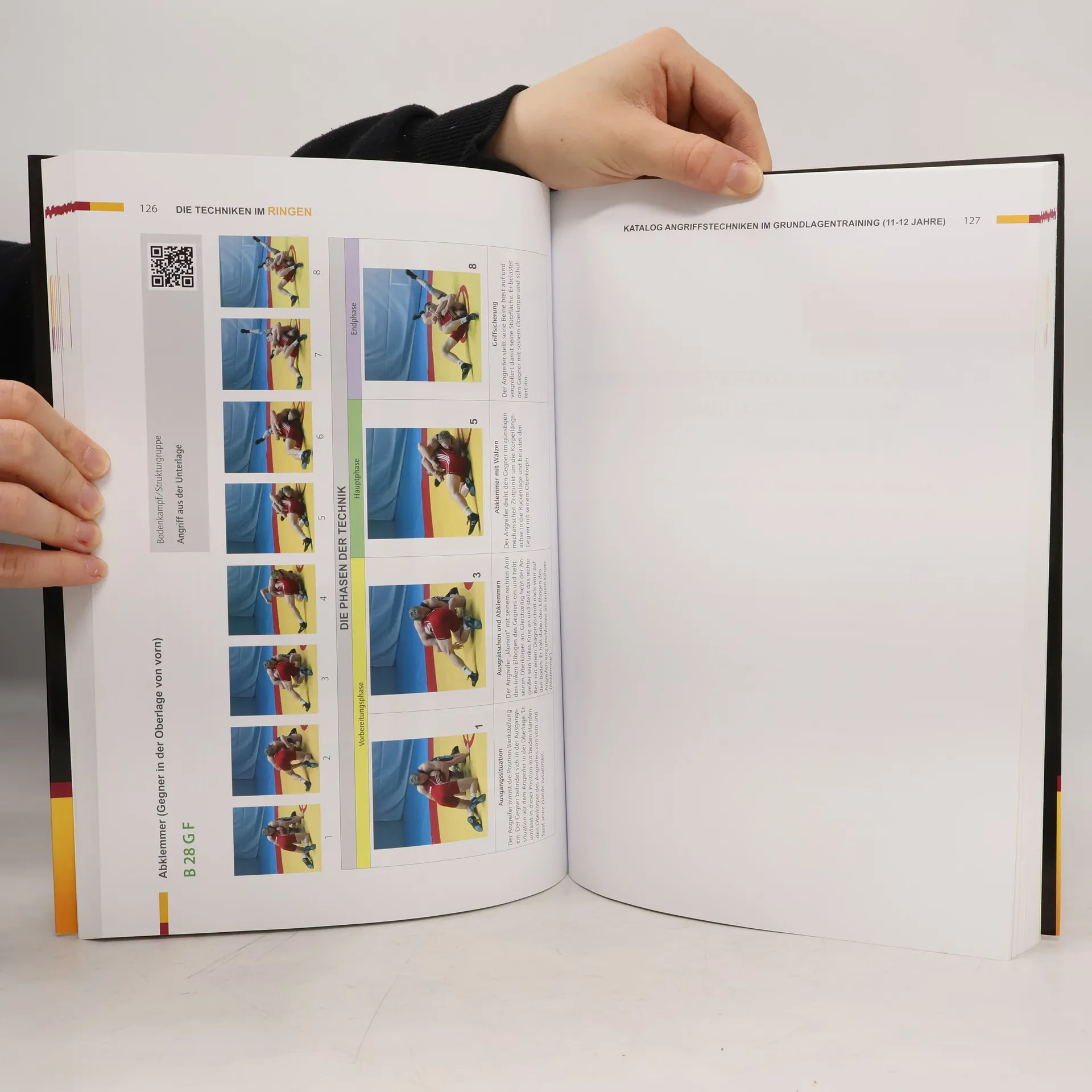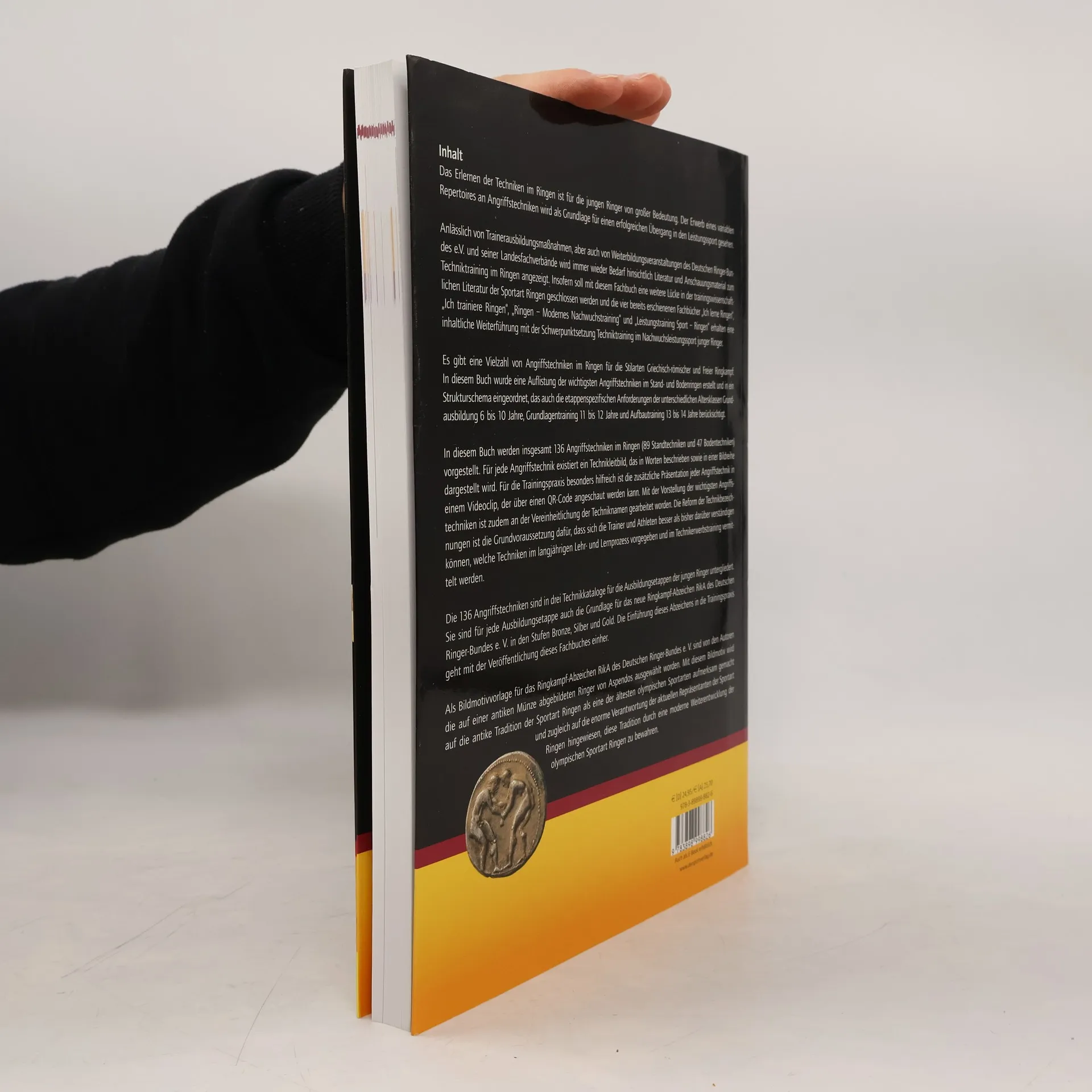 Das Erlernen der Techniken im Ringen ist für junge Ringer von großer Bedeutung, da ein variabel einsetzbares Repertoire an Angriffstechniken als Grundlage für den Übergang in den Leistungssport gilt. Bei Trainerausbildungsmaßnahmen und Weiterbildungen des Deutschen Ringer-Bundes e. V. wird immer wieder der Bedarf an Literatur und Anschauungsmaterial zum Techniktraining im Ringen deutlich. Dieses Fachbuch schließt eine Lücke in der trainingswissenschaftlichen Literatur und ergänzt die bereits erschienenen Werke mit einem Fokus auf Techniktraining im Nachwuchsleistungssport. Es werden 136 Angriffstechniken (89 Standtechniken und 47 Bodentechniken) vorgestellt, die in ein Strukturschema eingeordnet sind, das die spezifischen Anforderungen der Altersklassen von 6 bis 14 Jahren berücksichtigt. Die Techniken sind in drei Kataloge untergliedert, die für jede Ausbildungsetappe als Grundlage für das neue Ringkampf-Abzeichen RikA des Deutschen Ringer-Bundes e. V. dienen. Eine Reform der Techniknamen ist notwendig, um die Verständigung zwischen Trainern und Athleten zu verbessern. Videos zu den Techniken sind über QR-Codes zugänglich. Die Einführung des Abzeichens erfolgt parallel zur Veröffentlichung dieses Fachbuches, um die Trainingspraxis zu bereichern.
