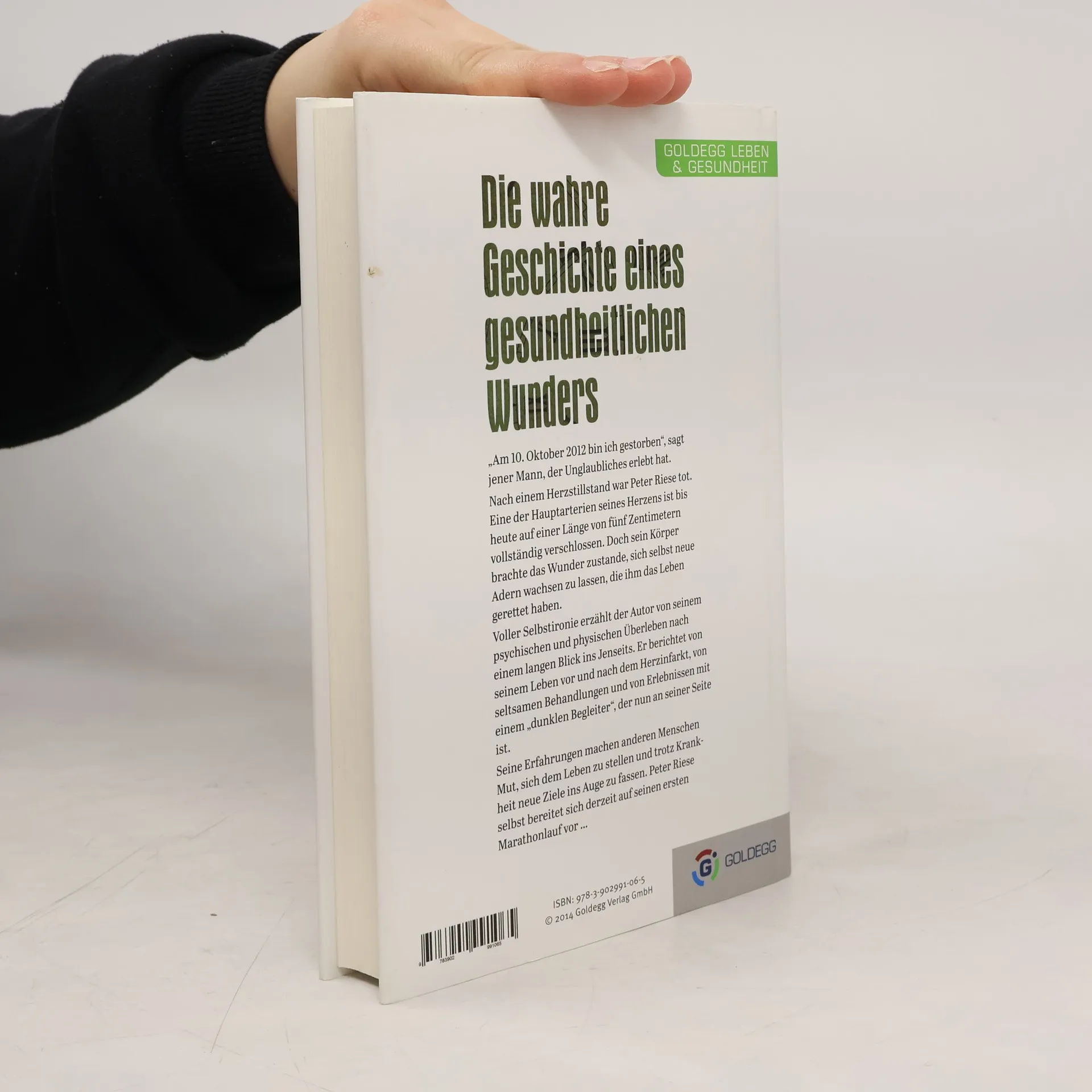 Die wahre Geschichte eines gesundheitlichen Wunders „Am 10. Oktober 2012 bin ich gestorben“ – der dramatische Einstieg in das Buch macht neugierig. Eigentlich dürfte Peter Riese gar nicht mehr leben. Eine der Hauptarterien seines Herzens ist bis heute auf einer Länge von fünf Zentimetern vollständig verschlossen. Zwei Herzinfarkte waren die Folge und nach ei-nem Herzstillstand war Peter Riese tot. In diesem Zustand erlebte er Seltsames, bis die Ärzte ihn reanimierten. Sein Körper brachte das Wunder zustande, sich neue Arterien wachsen zu lassen. Pointenreich und selbstironisch erzählt der Autor von seinem psychischen und physischen Überleben nach einem langen Blick ins Jenseits. Er berichtet von seinem Leben vor und nach dem Herzinfarkt, von seltsamen Behandlungen und Erlebnissen mit einem „dunklen Begleiter“, der ihn seither begleitet. Seine Erfahrungen machen anderen Menschen und Herzinfarktpatienten Mut, sich dem Leben zu stellen und trotz Krankheit neue Ziele ins Auge zu fassen. Peter Riese selbst bereitet sich derzeit, trotz immer noch voll-ständig verschlossener Arterie, auf seinen ersten Marathonlauf vor.