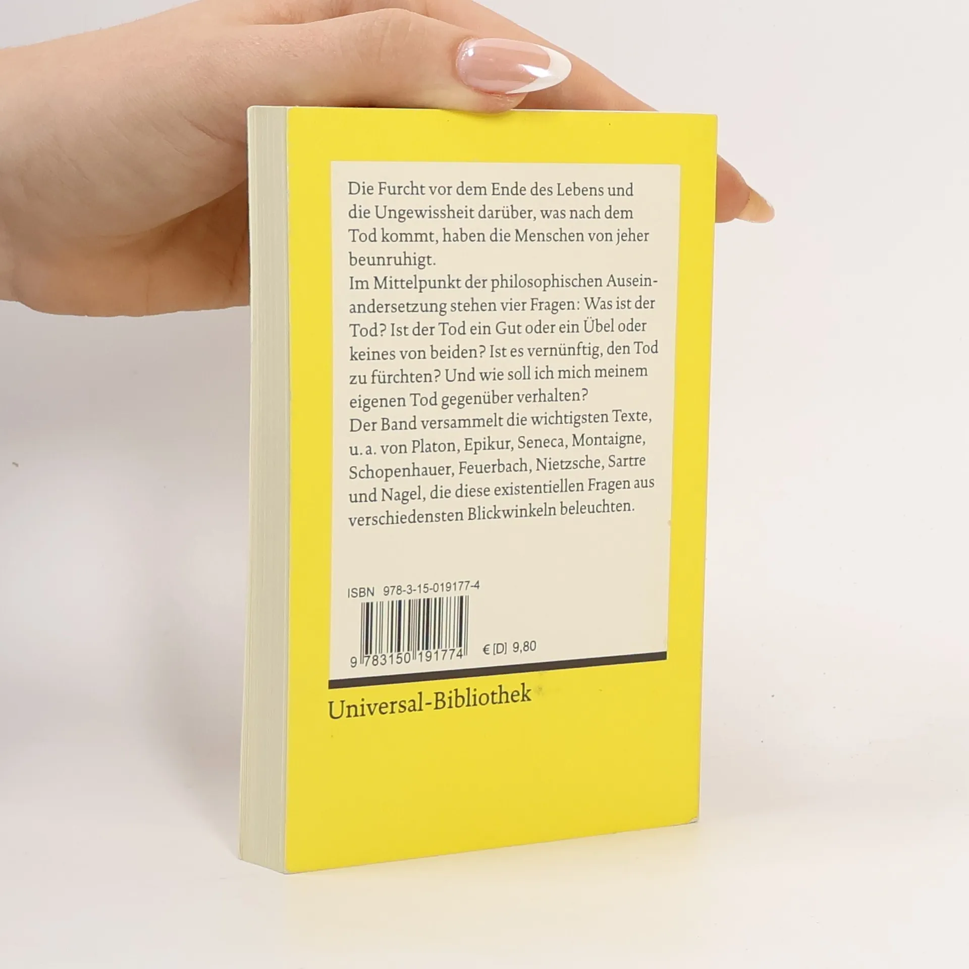 Die Furcht vor dem Ende des Lebens und die Ungewissheit darüber, was nach dem Tod kommt, haben die Menschen von jeher beunruhigt, bedrückt oder sogar gequält. Im Mittelpunkt der philosophischen Auseinandersetzung um den Tod stehen vier Fragen: Was ist der Tod? Ist der Tod ein Gut oder ein Übel oder keines von beiden? Ist es vernünftig, den Tod zu fürchten? Und wie soll ich mich meinem eigenen Tod gegenüber verhalten? Der Band versammelt die wichtigsten Texte, u. a. von Platon, Epikur, Seneca, Montaigne, Schopenhauer, Feuerbach, Nietzsche, Heidegger, Sartre und Nagel, die diese existentiellen Fragen aus verschiedensten Blickwinkeln beleuchten.