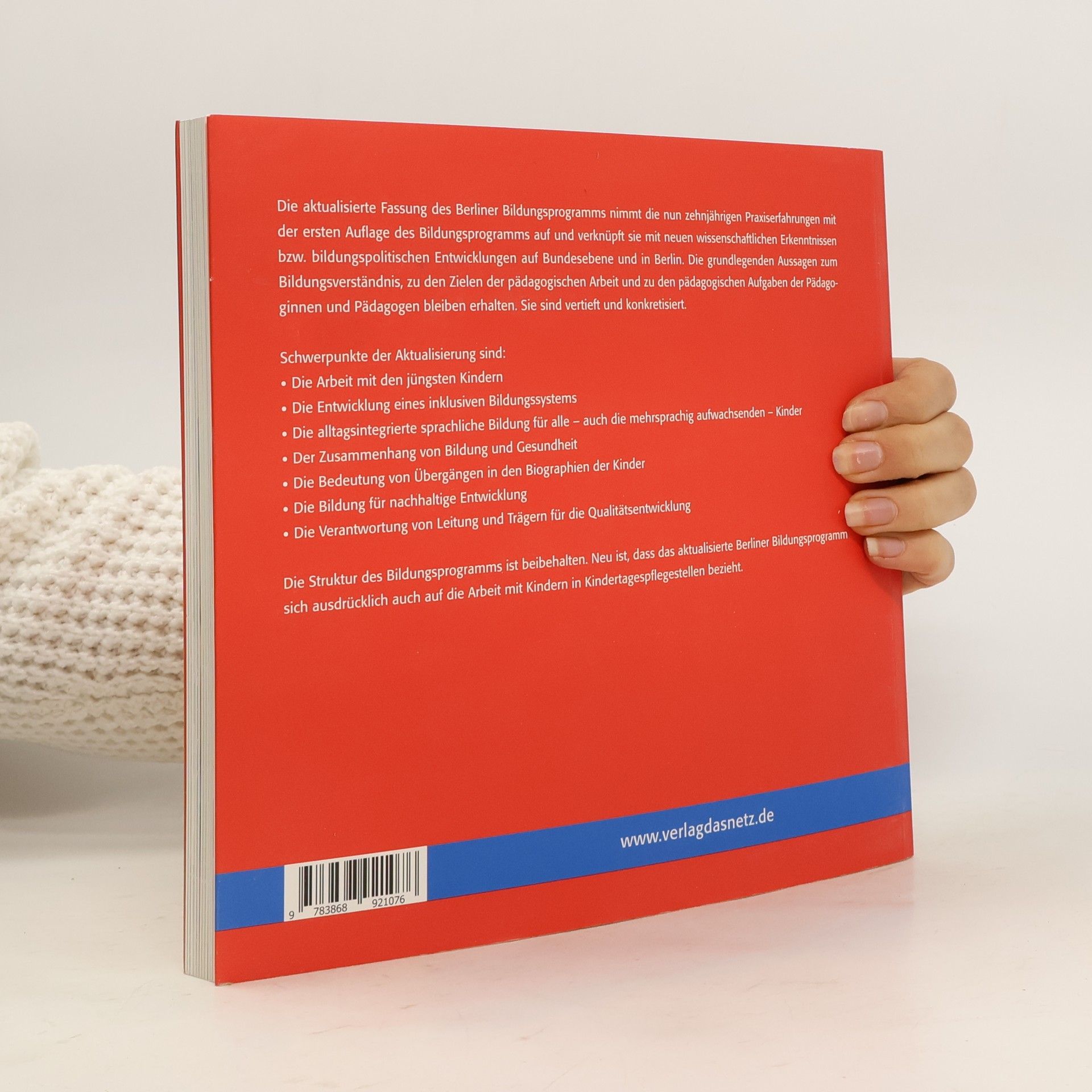 Alle Kinder haben ein Recht auf Bildung – von Anfang an. Das aktualisierte Berliner Bildungsprogramm legt dar, welche grundlegenden Kenntnisse und Fähigkeiten Kinder in ihren ersten sechs Lebensjahren benötigen, um ihren Lebensweg erfolgreich zu gestalten. Es bietet einen wissenschaftlich fundierten Orientierungsrahmen für alle Berliner Kindertageseinrichtungen und hat auch bundesweit sowie international große Zustimmung gefunden. Die neue Fassung integriert zehn Jahre Praxiserfahrungen mit der ersten Auflage und verknüpft diese mit aktuellen wissenschaftlichen Erkenntnissen sowie bildungspolitischen Entwicklungen. Die grundlegenden Aussagen zum Bildungsverständnis, den Zielen der pädagogischen Arbeit und den Aufgaben der Pädagoginnen und Pädagogen bleiben bestehen, werden jedoch vertieft und konkretisiert. Schwerpunkte der Aktualisierung sind die Arbeit mit den jüngsten Kindern, die Entwicklung eines inklusiven Bildungssystems, alltagsintegrierte sprachliche Bildung für mehrsprachige Kinder, der Zusammenhang von Bildung und Gesundheit, die Bedeutung von Übergängen in den Biografien der Kinder, Bildung für nachhaltige Entwicklung sowie die Verantwortung von Leitung und Trägern für Qualitätsentwicklung. Neu ist, dass das Programm sich auch auf die Arbeit mit Kindern in Kindertagespflegestellen bezieht.