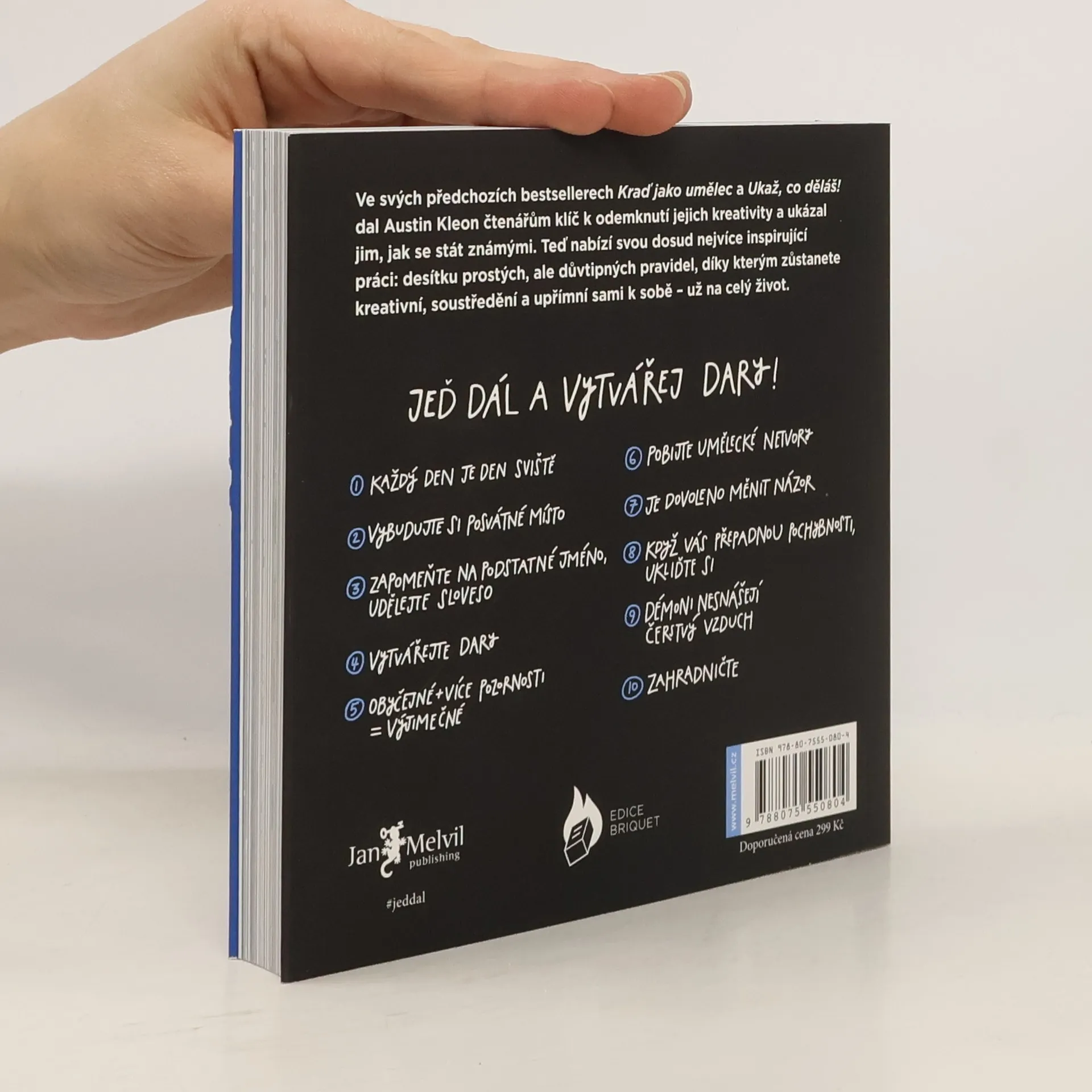 Možná bychom sem už nemuseli nic psát, protože představovat Austina Kleona našim čtenářům je nejspíš zbytečné… Ale my se tak těšíme! Pojďme si to raději shrnout: novinka plná kreativního povzbuzení pro chvíle, kdy si myslíte, že už nikdy nic nevytvoříte, protože nápady došly, vyšla v originále letos v dubnu. Ve svých předchozích knihách – Kraď jako umělec a Ukaž, co děláš! (obě jsou mimochodem bestsellerem jak podle New York Times, tak i dle nás), nám Austin Kleon ukázal, jak objevit svou kreativitu a jak o sobě dát vědět světu. Nyní nabízí to nejdůležitější: deset pravidel, jak o kreativitu nepřijít, zůstat soustředěný a věrný sám sobě – a to celoživotně. Tvořivost není rovná cesta s jasným začátkem i koncem, ale spíše smyčka. Kniha je vtipným návodem na to, jak se v různých odbočkách naší práce a tvorby neztratit, jak nesejít z cesty a mít správně nastavený cíl. Austine, děkujeme, těšíme, jedeme dál!