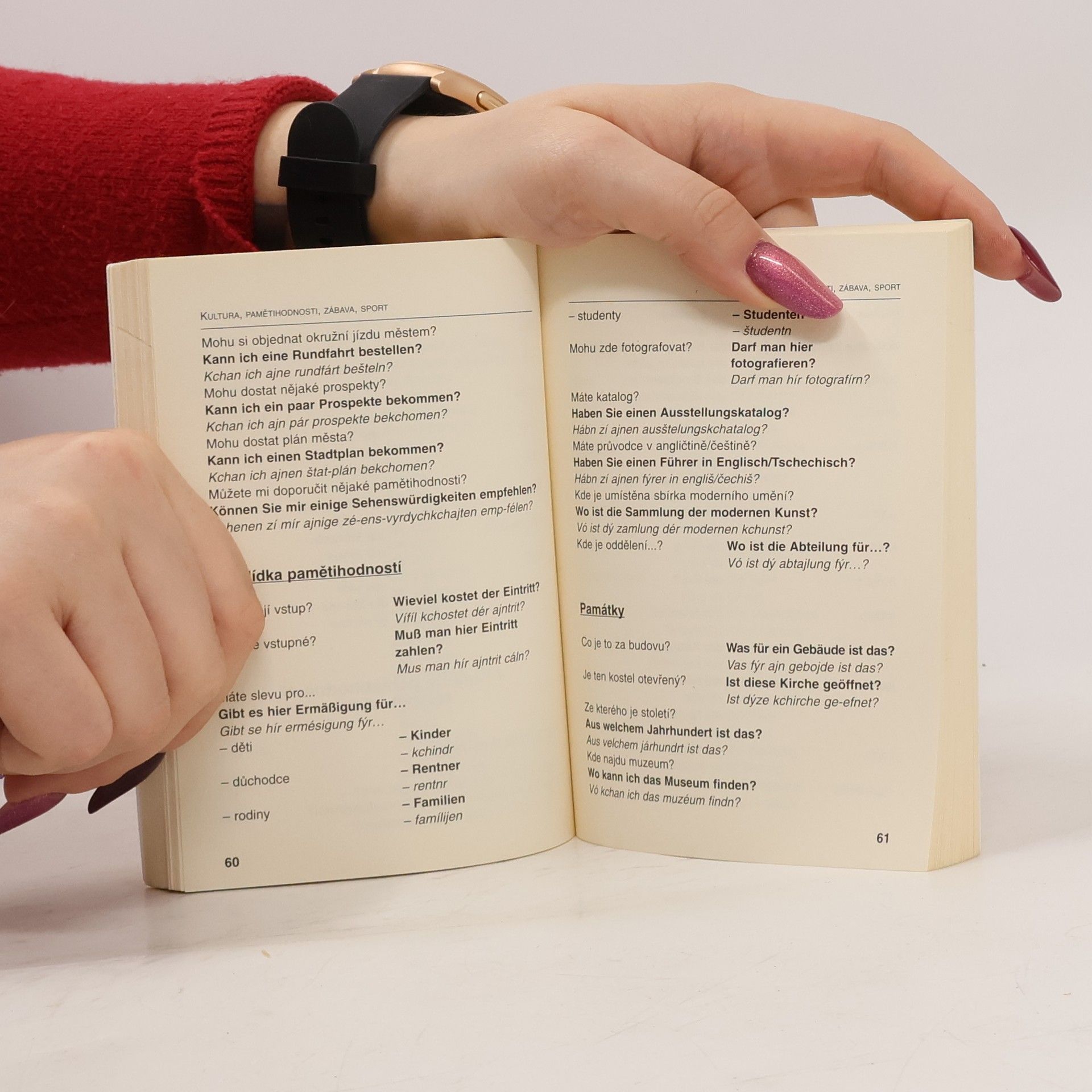 Konverzace zahrnující základní výrazy a fráze, důležité základní informace a fráze z oblasti cestování (vč. ubytování a stravování), kultury, sportu, služeb a užitečné výrazy ohledně úřadů, nákupování a zdraví.