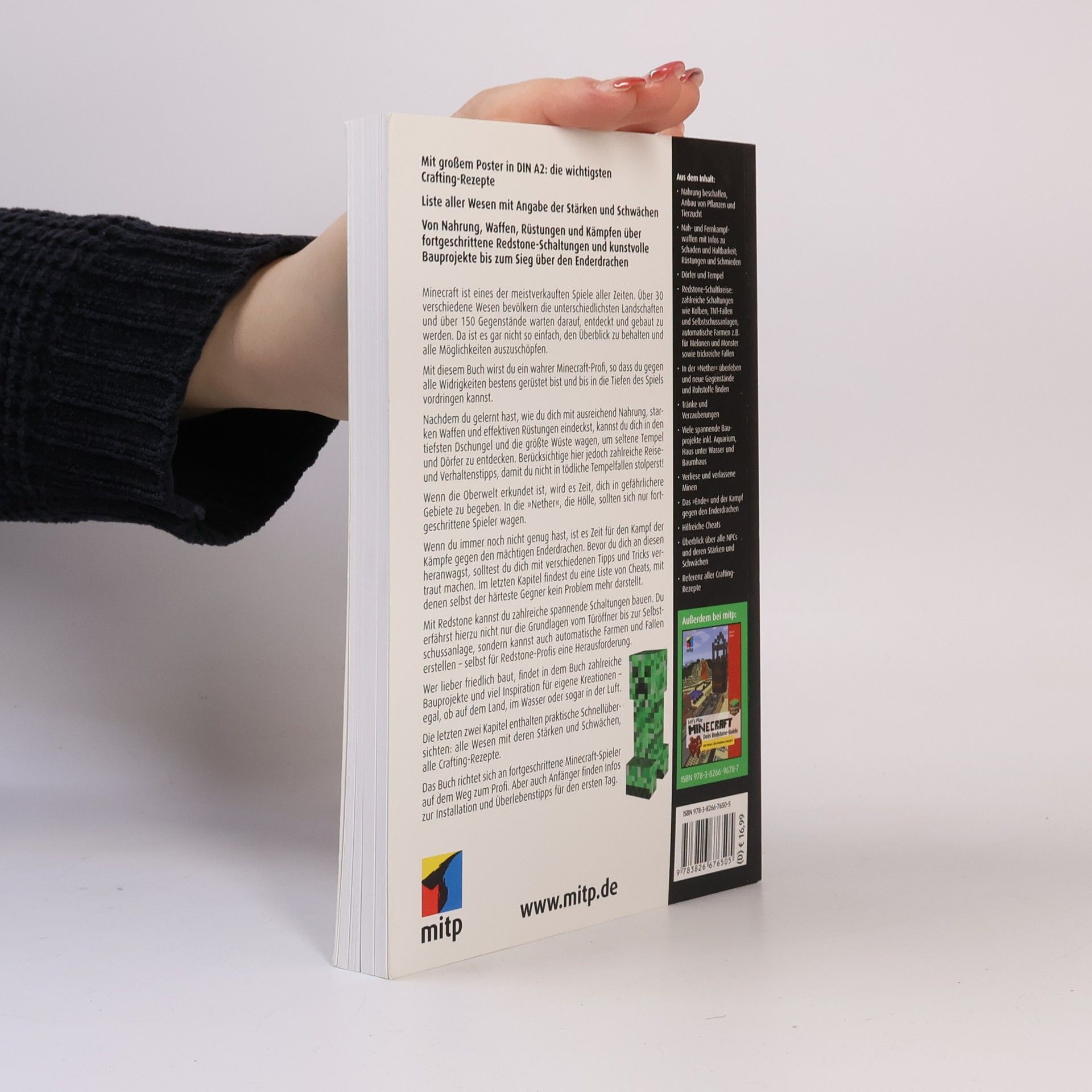Mit einem großen Poster im DIN A2-Format bietet dieses Buch die wichtigsten Crafting-Rezepte sowie eine Liste aller Wesen mit ihren Stärken und Schwächen. Es deckt alles ab, von Nahrung, Waffen und Rüstungen bis hin zu fortgeschrittenen Redstone-Schaltungen und beeindruckenden Bauprojekten, um den Enderdrachen zu besiegen. Minecraft zählt zu den meistverkauften Spielen und bietet über 30 verschiedene Wesen und mehr als 150 Gegenstände. Um in dieser Welt erfolgreich zu sein, ist es wichtig, den Überblick zu behalten. Dieses Buch hilft dir, ein wahrer Profi zu werden, indem es dir zeigt, wie du dich mit Nahrung, starken Waffen und effektiven Rüstungen ausstattest. Wage dich in Dschungel und Wüste, entdecke Tempel und Dörfer, während du wertvolle Reise- und Verhaltenstipps beachtest. Für fortgeschrittene Spieler gibt es Anleitungen zur Erkundung der Nether und zum Kampf gegen den Enderdrachen, einschließlich nützlicher Tipps und Tricks. Zudem werden Redstone-Schaltungen erklärt, von einfachen Türöffnern bis zu automatischen Farmen. Friedliche Bauprojekte und Inspiration für eigene Kreationen finden ebenfalls Platz. Die letzten Kapitel bieten schnelle Übersichten über NPCs, deren Stärken und Schwächen sowie alle Crafting-Rezepte. Anfänger erhalten zudem hilfreiche Informationen zur Installation und Überlebenstipps für den ersten Tag.