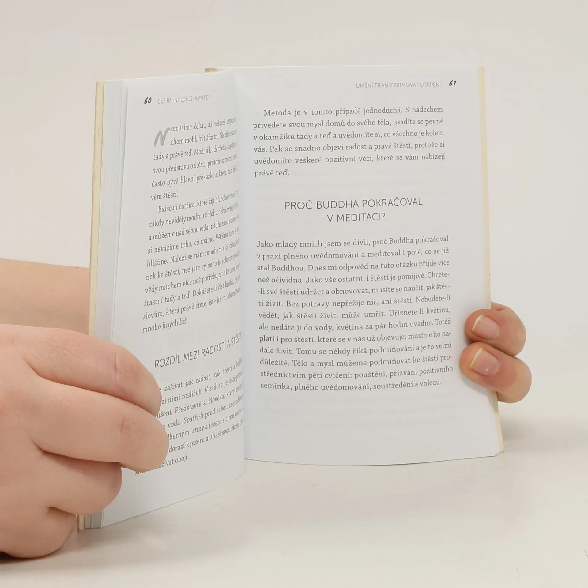 Umění transformovat utrpení. Užívat si štěstí neznamená nezažít utrpení. Když se naučíme svému utrpení rozumět, můžeme trpět daleko méně a být schopni utrpení transformovat v porozumění, soucit a radost. „Většina lidí má z utrpení strach. Utrpení je ale jako bahno, které pomáhá lotosovému květu štěstí vyrůst. Bez bahna lotosy nevykvetou.“ Thich Nhat Hanh je buddhistický mnich, zenový mistr, učitel, spisovatel, básník a mírový aktivista. Jeho učení o umění žít v přítomném okamžiku se šíří celým světem. Narodil se ve Vietnamu v roce 1926 a v šestnácti letech vstoupil do buddhistického kláštera. Ze války ve Vietnamu se věnoval angažovanému buddhismu. V roce 1967 byl Martinem Lutherem Kingem nominován na Nobelovu cenu za mír, od 1973 žije v exilu ve Francii. Je považován za průkopníka buddhistického učení na Západě, založil síť klášterů a meditačních center, prvním z bylo Plum Village v jihozápadní Francii. „V každém našem centru po celém světě máme lotosové jezírko. Všichni vědí, že potřebujeme bahno, aby nám lotosy rostly. Bahno nevoní úplně nejlíp, zato lotosové květy voní moc dobře. Pokud nemáte bahno, lotosy se neukážou. Nemůžete pěstovat lotosy na mramoru. Bez bahna by tu žádné lotosy nebyly.“