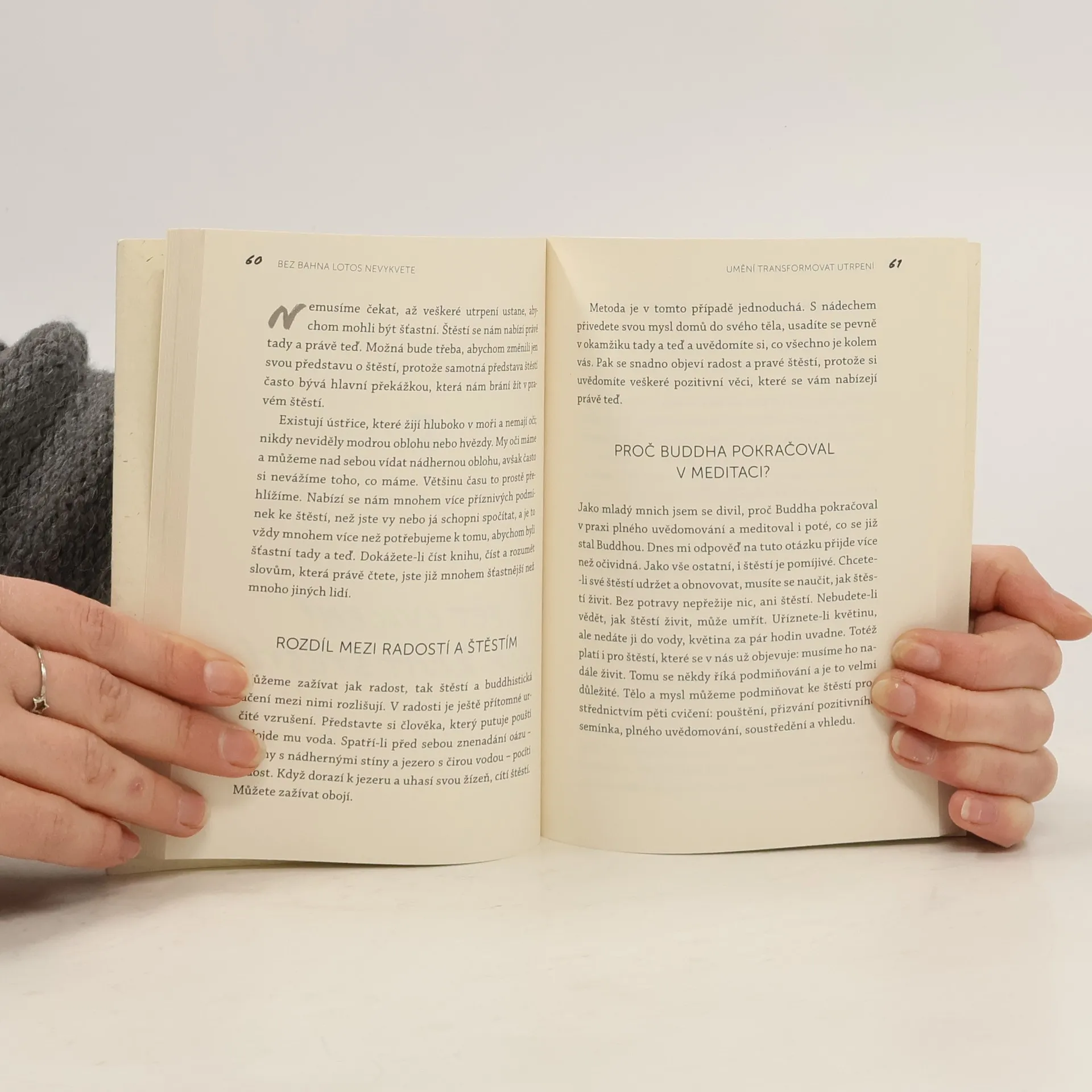 Umění transformovat utrpení. Užívat si štěstí neznamená nezažít utrpení. Když se naučíme svému utrpení rozumět, můžeme trpět daleko méně a být schopni utrpení transformovat v porozumění, soucit a radost. „Většina lidí má z utrpení strach. Utrpení je ale jako bahno, které pomáhá lotosovému květu štěstí vyrůst. Bez bahna lotosy nevykvetou.“ Thich Nhat Hanh je buddhistický mnich, zenový mistr, učitel, spisovatel, básník a mírový aktivista. Jeho učení o umění žít v přítomném okamžiku se šíří celým světem. Narodil se ve Vietnamu v roce 1926 a v šestnácti letech vstoupil do buddhistického kláštera. Ze války ve Vietnamu se věnoval angažovanému buddhismu. V roce 1967 byl Martinem Lutherem Kingem nominován na Nobelovu cenu za mír, od 1973 žije v exilu ve Francii. Je považován za průkopníka buddhistického učení na Západě, založil síť klášterů a meditačních center, prvním z bylo Plum Village v jihozápadní Francii. „V každém našem centru po celém světě máme lotosové jezírko. Všichni vědí, že potřebujeme bahno, aby nám lotosy rostly. Bahno nevoní úplně nejlíp, zato lotosové květy voní moc dobře. Pokud nemáte bahno, lotosy se neukážou. Nemůžete pěstovat lotosy na mramoru. Bez bahna by tu žádné lotosy nebyly.“