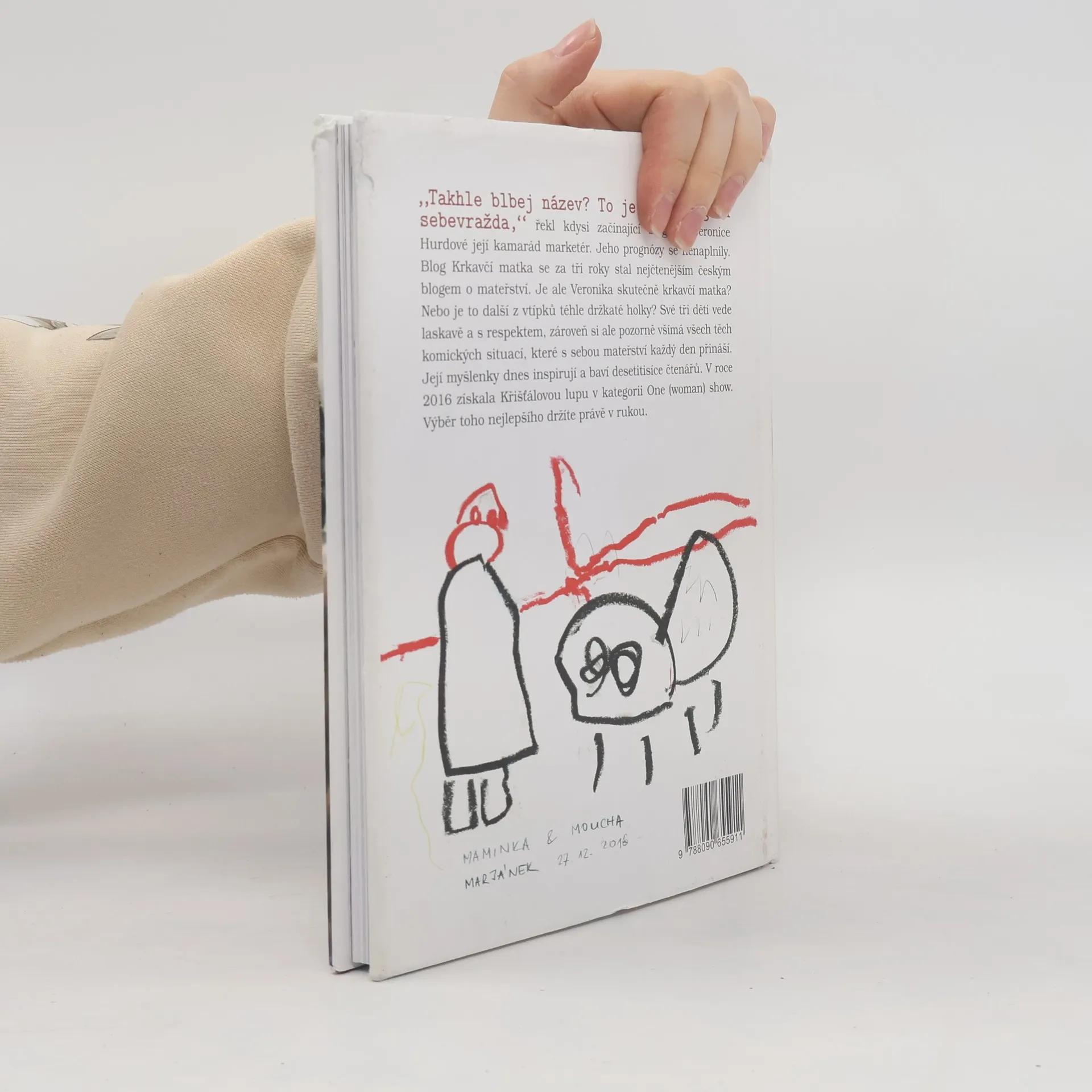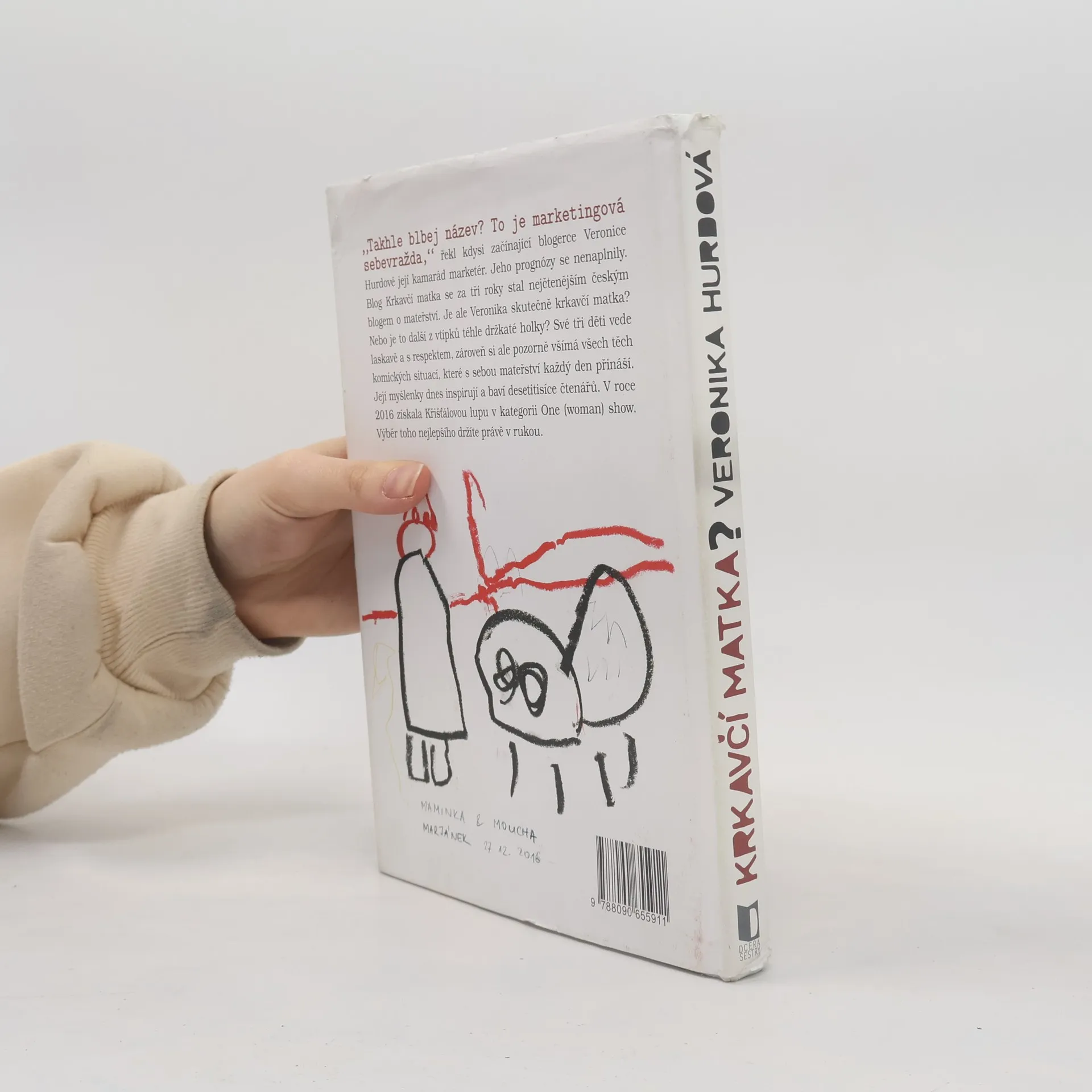 „Takhle blbej název? To je marketingová sebevražda,“ řekl kdysi začínající blogerce Veronice Hurdové její kamarád marketér. Jeho prognózy se nenaplnily. Blog Krkavčí matka se za tři roky stal nejčtenějším českým blogem o mateřství. Je ale Veronika skutečně krkavčí matka? Nebo je to další z vtípků téhle držkaté holky? Své tři děti vede laskavě a s respektem, zároveň si ale pozorně všímá všech těch komických situací, které s sebou mateřství každý den přináší. Její myšlenky dnes inspirují a baví desetitisíce čtenářů. V roce 2016 získala Křišťálovou lupu v kategorii One (woman) show. Výběr toho nejlepšího držíte právě v rukou. Aniž by v tom byl záměr, jdu celý život mimo hlavní proud. Na rozdíl od svého patnáctiletého já se za to dnes už nestydím. Mám víc dětí než rukou. Gréta, Marján a Janek se jmenují. Ty děti, ne ruce. Když děti spí, píšu blog a FB Krkavčí matka. Miluju les, nohy v teple a svého muže Honzu, který na mě čeká v nebi. Děsí mě pobytové zájezdy, snahy o škatulkování a nesmířliví lidé se zavřenými hlavami.