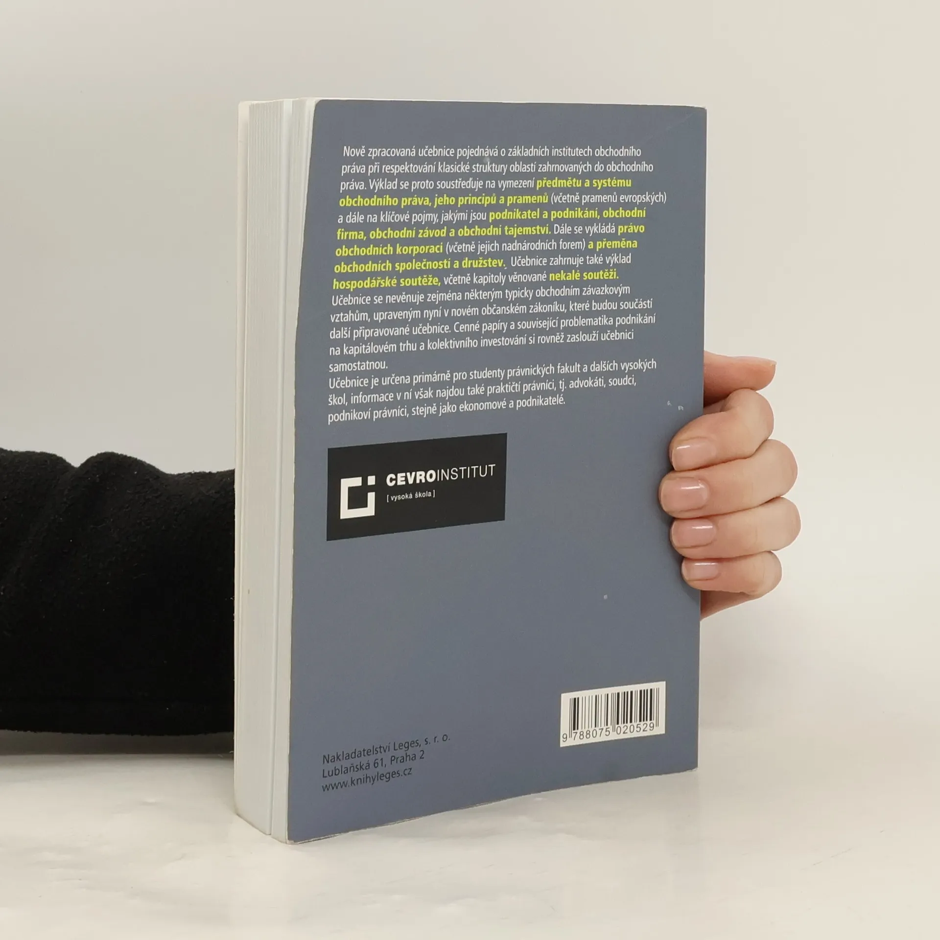 Nově zpracovaná učebnice pojednává o základních institutech obchodního práva při respektování klasické struktury oblastí zahrnovaných do obchodního práva. Výklad se proto soustřeďuje na vymezení předmětu a systému obchodního práva, jeho principů a pramenů (včetně pramenů evropských) a dále na klíčové pojmy, jakými jsou podnikatel a podnikání, obchodní firma, obchodní závod a obchodní tajemství. Dále se vykládá právo obchodních korporací (včetně jejich nadnárodních forem) a přeměna obchodních společností a družstev. Učebnice zahrnuje také výklad hospodářské soutěže, včetně kapitoly věnované nekalé soutěži.