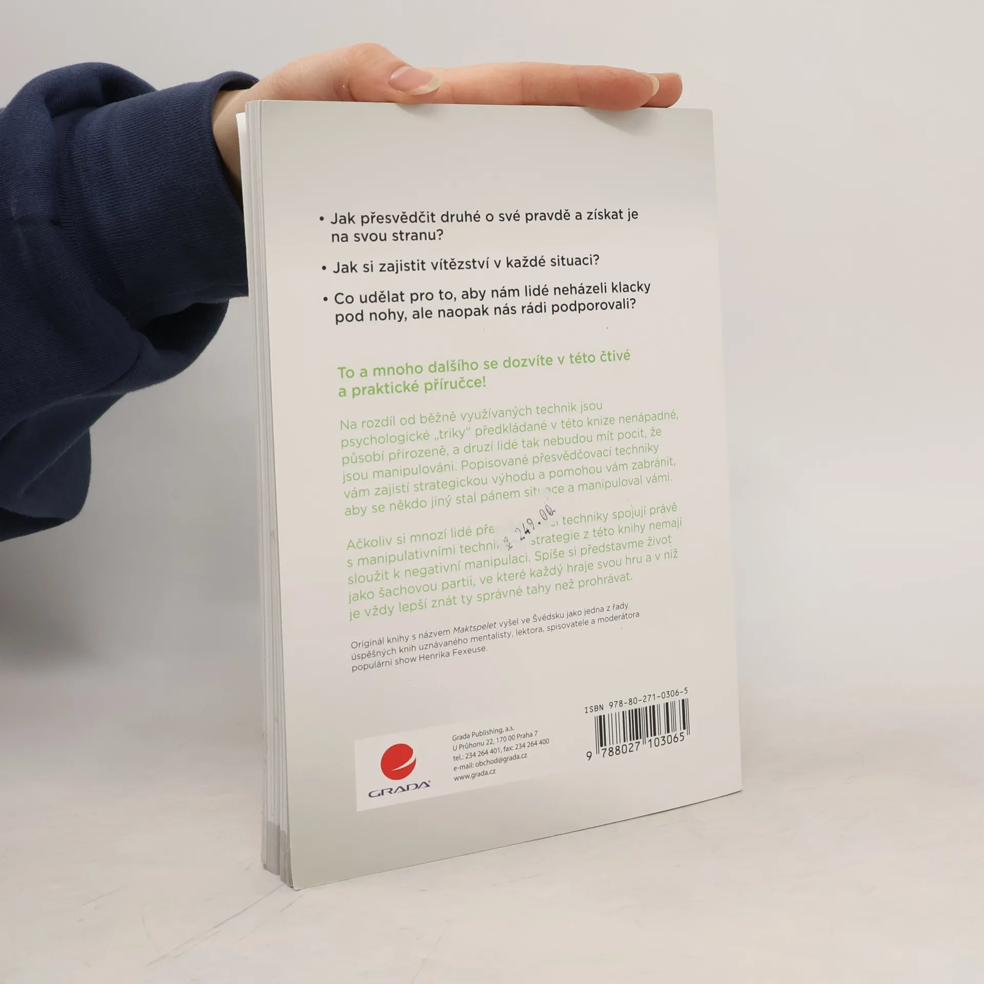 - Jak přesvědčit druhé o své pravdě a získat je na svou stranu? - Jak si zajistit vítězství v každé situaci? - Co udělat pro to, aby nám lidé neházeli klacky pod nohy, ale naopak nás rádi podporovali? To a mnoho dalšího se dozvíte v této čtivé a praktické příručce! Na rozdíl od běžně využívaných technik jsou psychologické „triky“ předkládané v této knize nenápadné, působí přirozeně, a druzí lidé tak nebudou mít pocit, že jsou manipulováni. Popisované přesvědčovací techniky vám zajistí strategickou výhodu a pomohou vám zabránit, aby se někdo jiný stal pánem situace a manipuloval vámi. Ačkoliv si mnozí lidé přesvědčovací techniky spojují právě s manipulativními technikami, strategie z této knihy nemají sloužit k negativní manipulaci. Spíše si představme život jako šachovou partii, ve které každý hraje svou hru a v níž je vždy lepší znát ty správné tahy než prohrávat.
