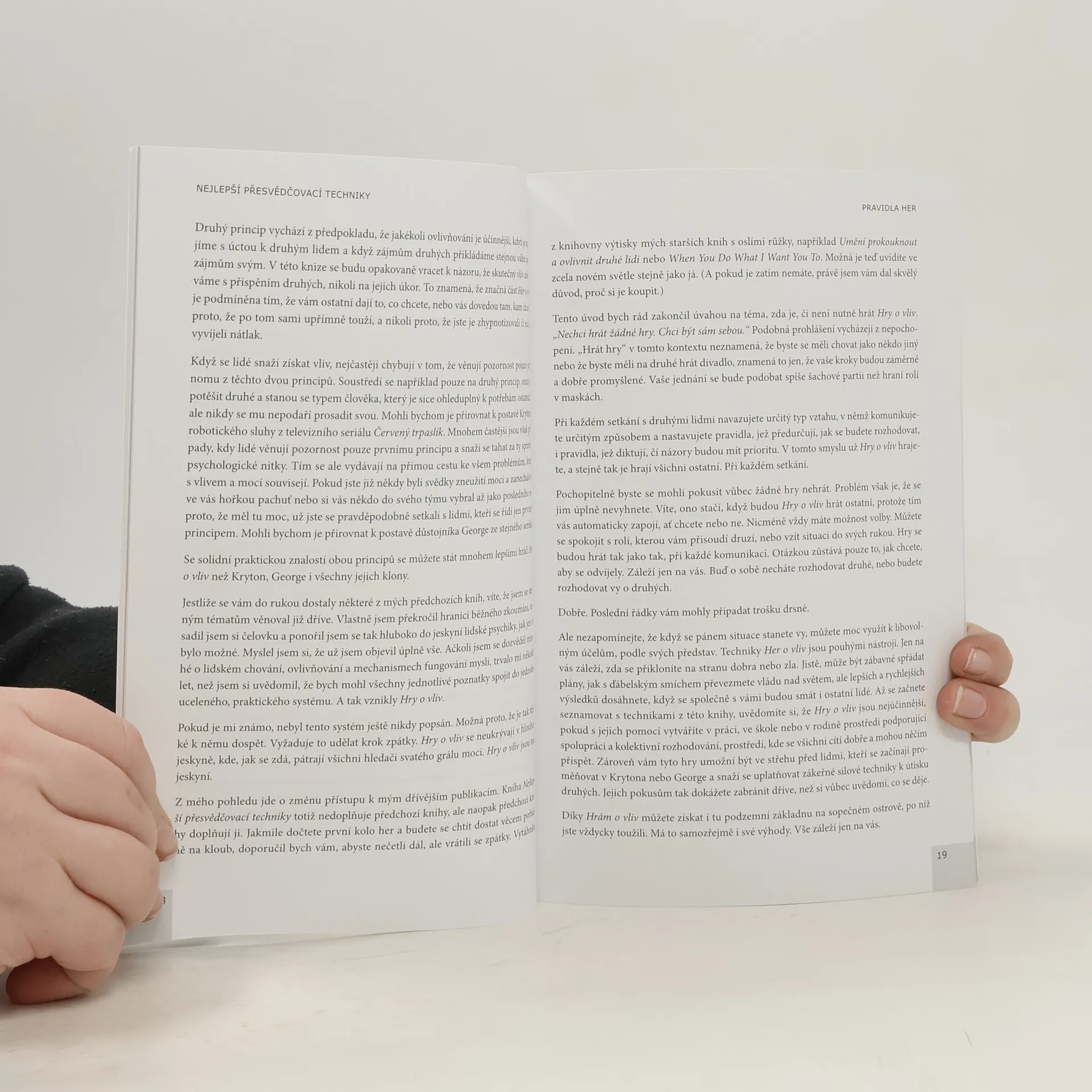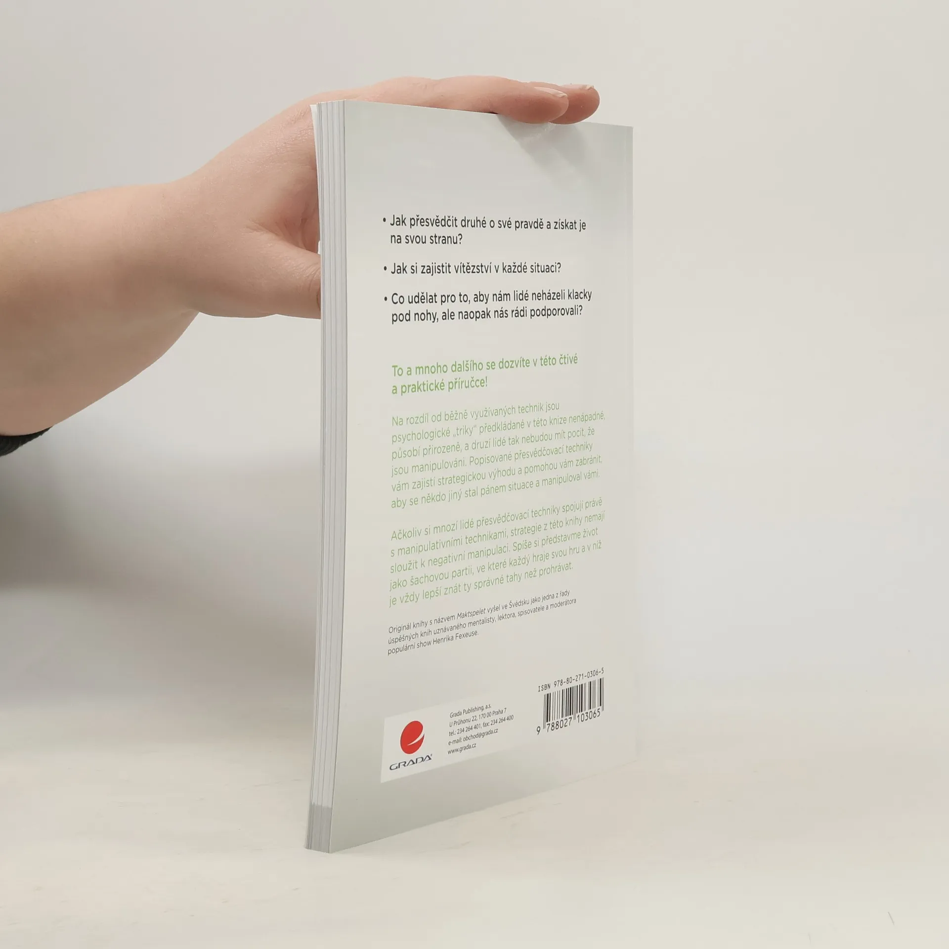 - Jak přesvědčit druhé o své pravdě a získat je na svou stranu? - Jak si zajistit vítězství v každé situaci? - Co udělat pro to, aby nám lidé neházeli klacky pod nohy, ale naopak nás rádi podporovali? To a mnoho dalšího se dozvíte v této čtivé a praktické příručce! Na rozdíl od běžně využívaných technik jsou psychologické „triky“ předkládané v této knize nenápadné, působí přirozeně, a druzí lidé tak nebudou mít pocit, že jsou manipulováni. Popisované přesvědčovací techniky vám zajistí strategickou výhodu a pomohou vám zabránit, aby se někdo jiný stal pánem situace a manipuloval vámi. Ačkoliv si mnozí lidé přesvědčovací techniky spojují právě s manipulativními technikami, strategie z této knihy nemají sloužit k negativní manipulaci. Spíše si představme život jako šachovou partii, ve které každý hraje svou hru a v níž je vždy lepší znát ty správné tahy než prohrávat.