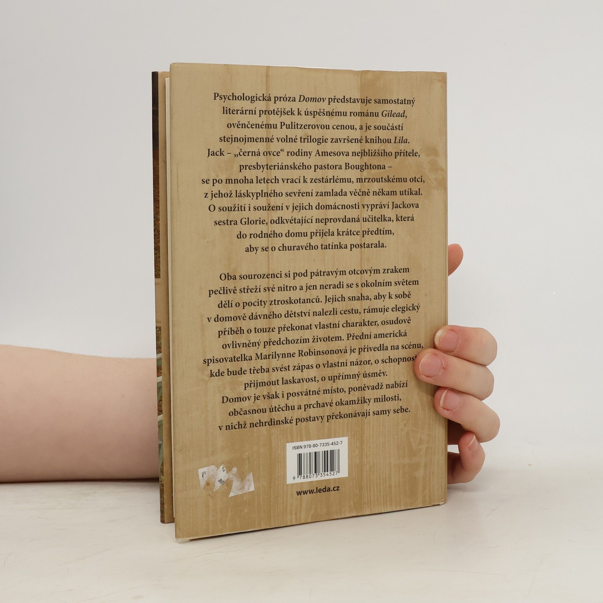 Psychologická próza Domov představuje samostatný literární protějšek k úspěšnému románu Gilead, ověnčenému Pulitzerovou cenou, a je součástí stejnojmenné volné trilogie završené knihou Lila. Jack – „černá ovce“ rodiny Amesova nejbližšího přítele, presbyteriánského pastora Boughtona – se po mnoha letech vrací k zestárlému, mrzoutskému otci, z jehož láskyplného sevření zamlada věčně někam utíkal. O soužití i soužení v jejich domácnosti vypráví Jackova sestra Glorie, odkvétající neprovdaná učitelka, která do rodného domu přijela krátce předtím, aby se o churavého tatínka postarala. Oba sourozenci si pod pátravým otcovým zrakem pečlivě střeží své nitro a jen neradi se s okolním světem dělí o pocity ztroskotanců. Jejich snaha, aby k sobě v domově dávného dětství nalezli cestu, rámuje elegický příběh o touze překonat vlastní charakter, osudově ovlivněný předchozím životem. Přední americká spisovatelka Marilynne Robinsonová je přivedla na scénu, kde bude třeba svést zápas o vlastní názor, o schopnost přijmout laskavost, o upřímný úsměv. Domov je však i posvátné místo, poněvadž nabízí občasnou útěchu a prchavé okamžiky milosti, v nichž nehrdinské postavy překonávají samy sebe.