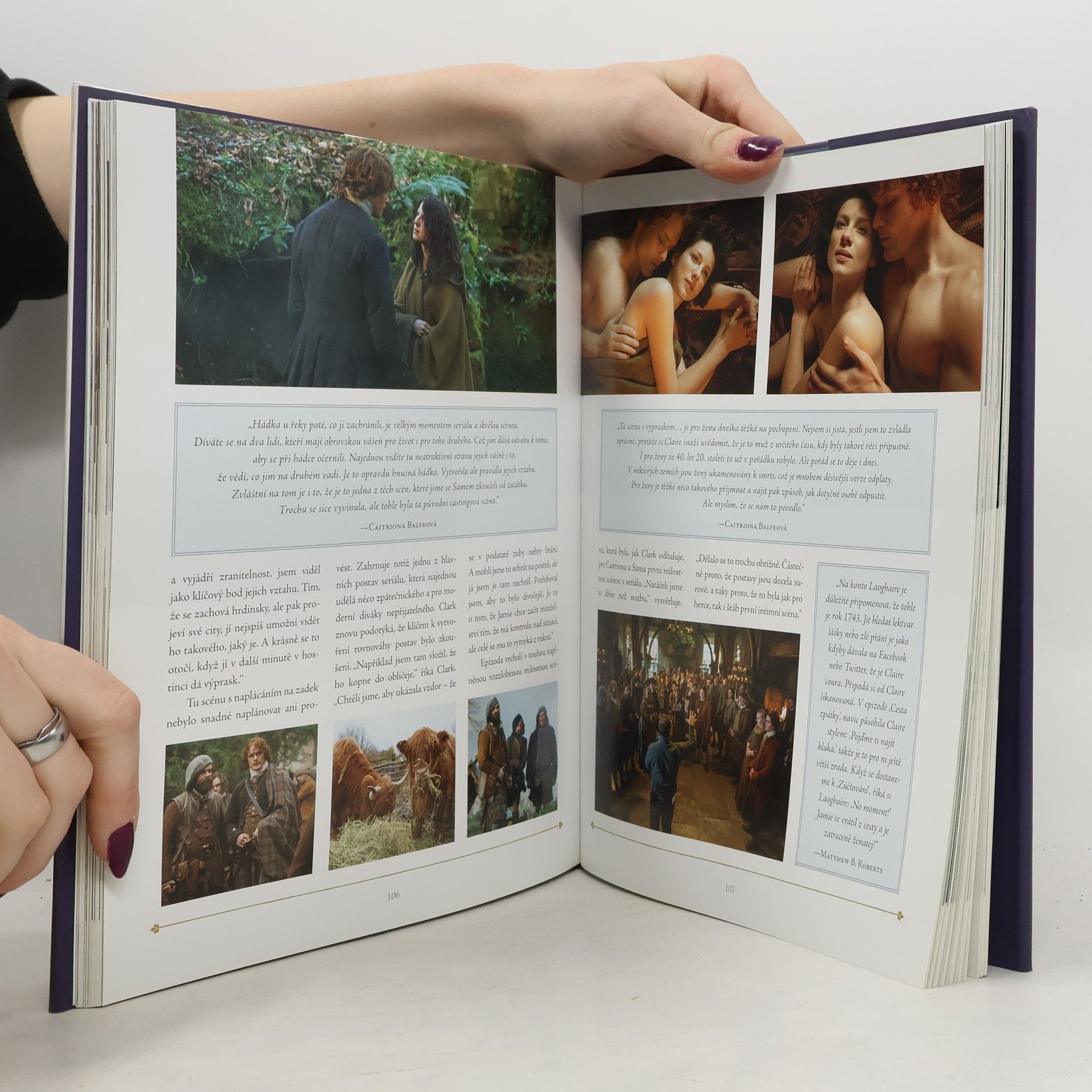 Kniha vás zavede jak do zákulisí, tak přímo do děje. Herci, scénáristé, producenti, hudebníci, kostýmní výtvarníci, technici a mnozí další se s vámi podělí a své zážitky a výzvy, kterým čelili, než se tato vzrušující sága objevila na obrazovce. V exkluzivních rozhovorech, včetně Caitriony Balfe (Claire), Sama Heughana (Jamie) a Tobiase Menziese (Frank Randall / Black Jack Randall), se dočtete o jejich o nelehkém úkolu věrně ztělesnit nejoblíbenější postavy románů. Výkonný producent a Ronald D. Moore se svěří s tím, jak pracoval tým scénáristů, jak objížděli vytipované lokality pro natáčení i kolik energie stála výroba kostýmů a staveb, aby vše bylo dokonalé. Kniha také zkoumá všechny epizody seriálu prostřednictvím exkluzivních rozhovorů s jejími autory a režiséry, kteří se s vámi podělí o fascinující fakta z natáčení díl po dílu.
