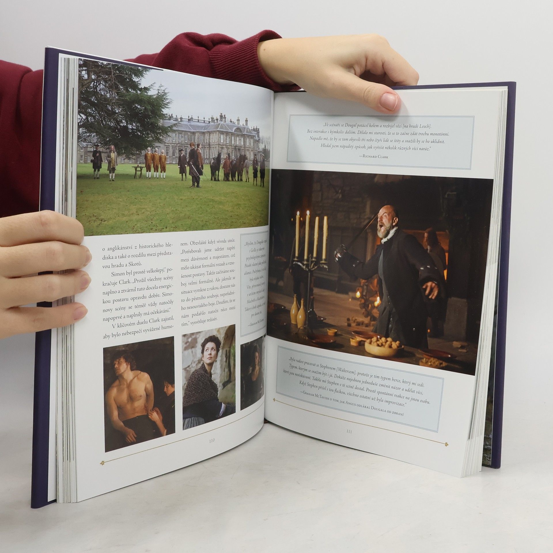 Kniha vás zavede jak do zákulisí, tak přímo do děje. Herci, scénáristé, producenti, hudebníci, kostýmní výtvarníci, technici a mnozí další se s vámi podělí a své zážitky a výzvy, kterým čelili, než se tato vzrušující sága objevila na obrazovce. V exkluzivních rozhovorech, včetně Caitriony Balfe (Claire), Sama Heughana (Jamie) a Tobiase Menziese (Frank Randall / Black Jack Randall), se dočtete o jejich o nelehkém úkolu věrně ztělesnit nejoblíbenější postavy románů. Výkonný producent a Ronald D. Moore se svěří s tím, jak pracoval tým scénáristů, jak objížděli vytipované lokality pro natáčení i kolik energie stála výroba kostýmů a staveb, aby vše bylo dokonalé. Kniha také zkoumá všechny epizody seriálu prostřednictvím exkluzivních rozhovorů s jejími autory a režiséry, kteří se s vámi podělí o fascinující fakta z natáčení díl po dílu.