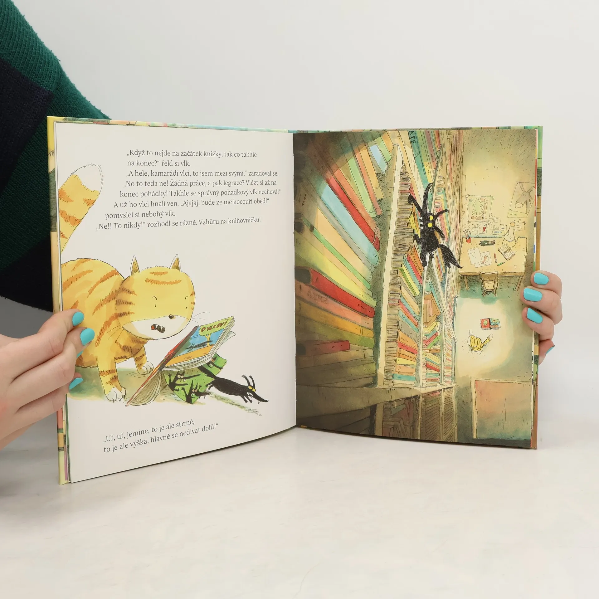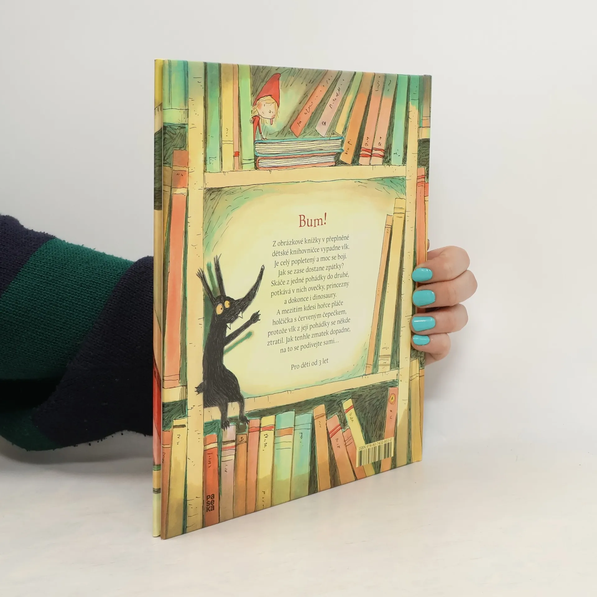 Bum! Z obrázkové knížky v přeplněné dětské knihovničce vypadne vlk. Je celý popletený a moc se bojí. Jak se zase dostane zpátky? Skáče z jedné pohádky do druhé, potkává v nich ovečky, princezny a dokonce i dinosaury… A mezitím kdesi hořce pláče holčička s červeným čepečkem, protože vlk z její pohádky se někde ztratil. Jak tenhle zmatek dopadne, to vám tady neprozradíme…