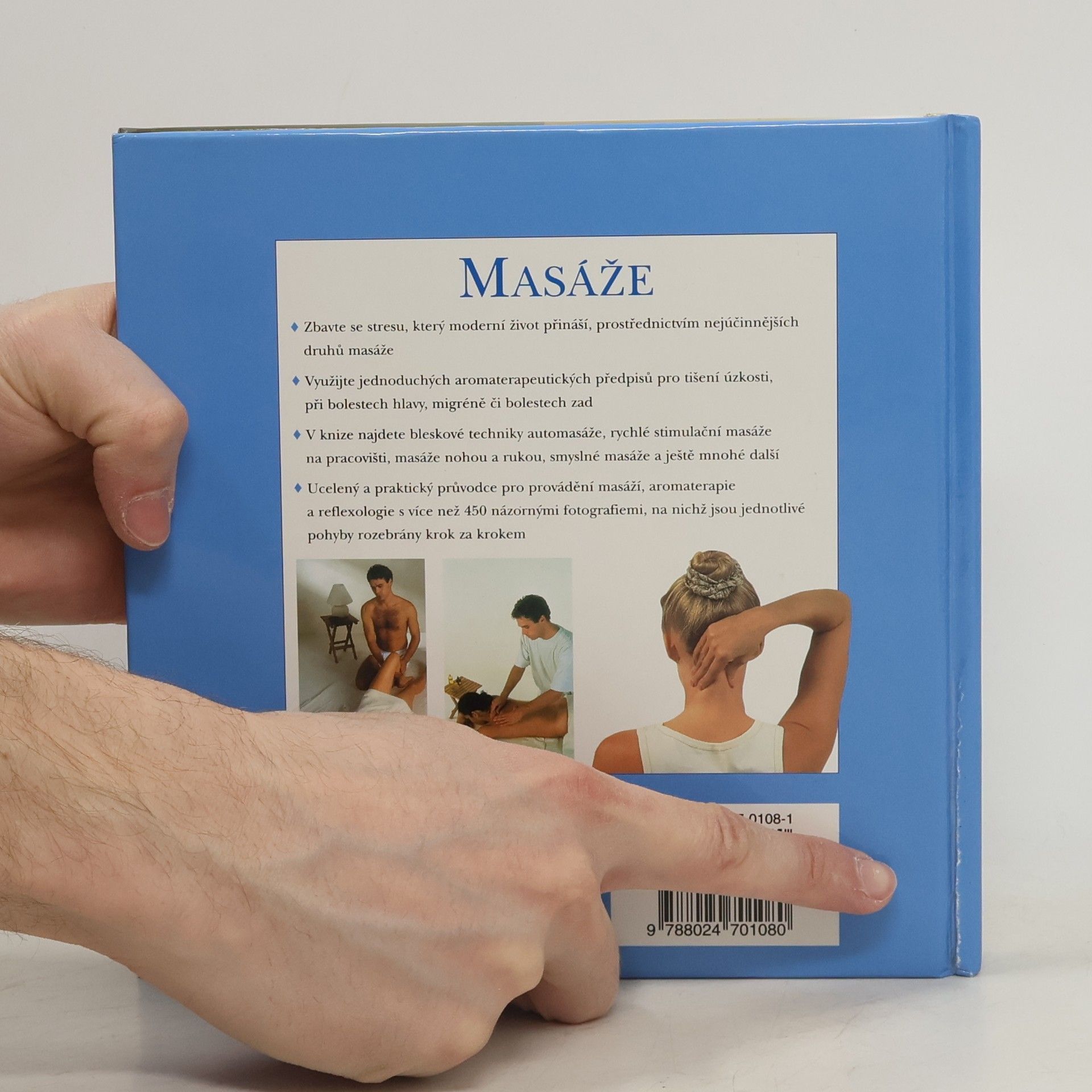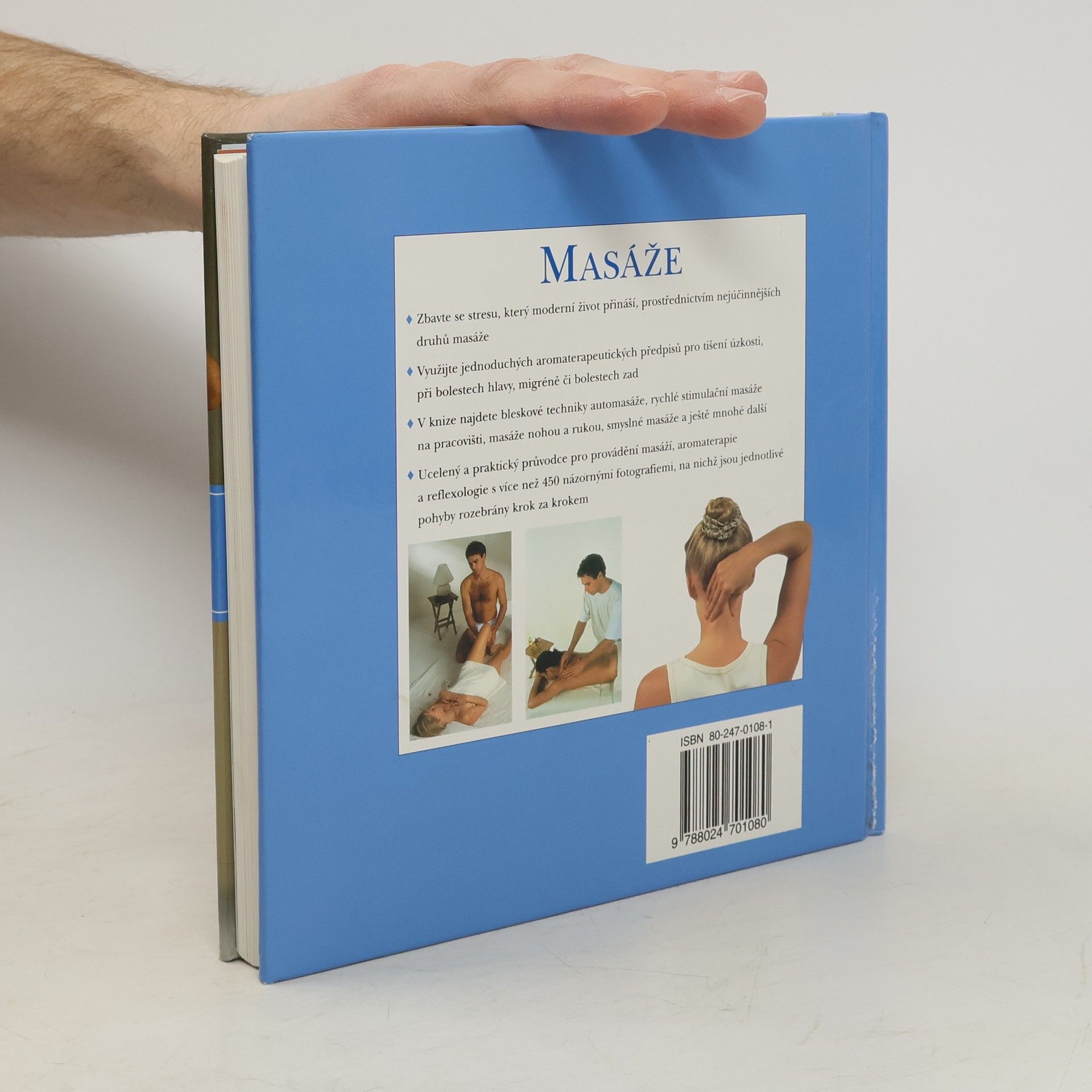 Zbavte se stresu, který moderní život přináší, prostřednictvím nejúčinnějších druhů masáže. Využijte jednoduchých aromaterapeutických předpisů pro tišení úzkosti, při bolestech hlavy, migréně či bolestech zad. V knize najdete bleskové techniky automasáže, rychlé stimulační masáže na pracovišti, masáže nohou a rukou, smyslné masáže a ještě mnohé další. Ucelený a praktický průvodce pro provádění masáží, aromaterapie a reflexologie s více než 450 názornými fotografiemi, na nichž jsou jednotlivé pohyby rozebrány krok za krokem.