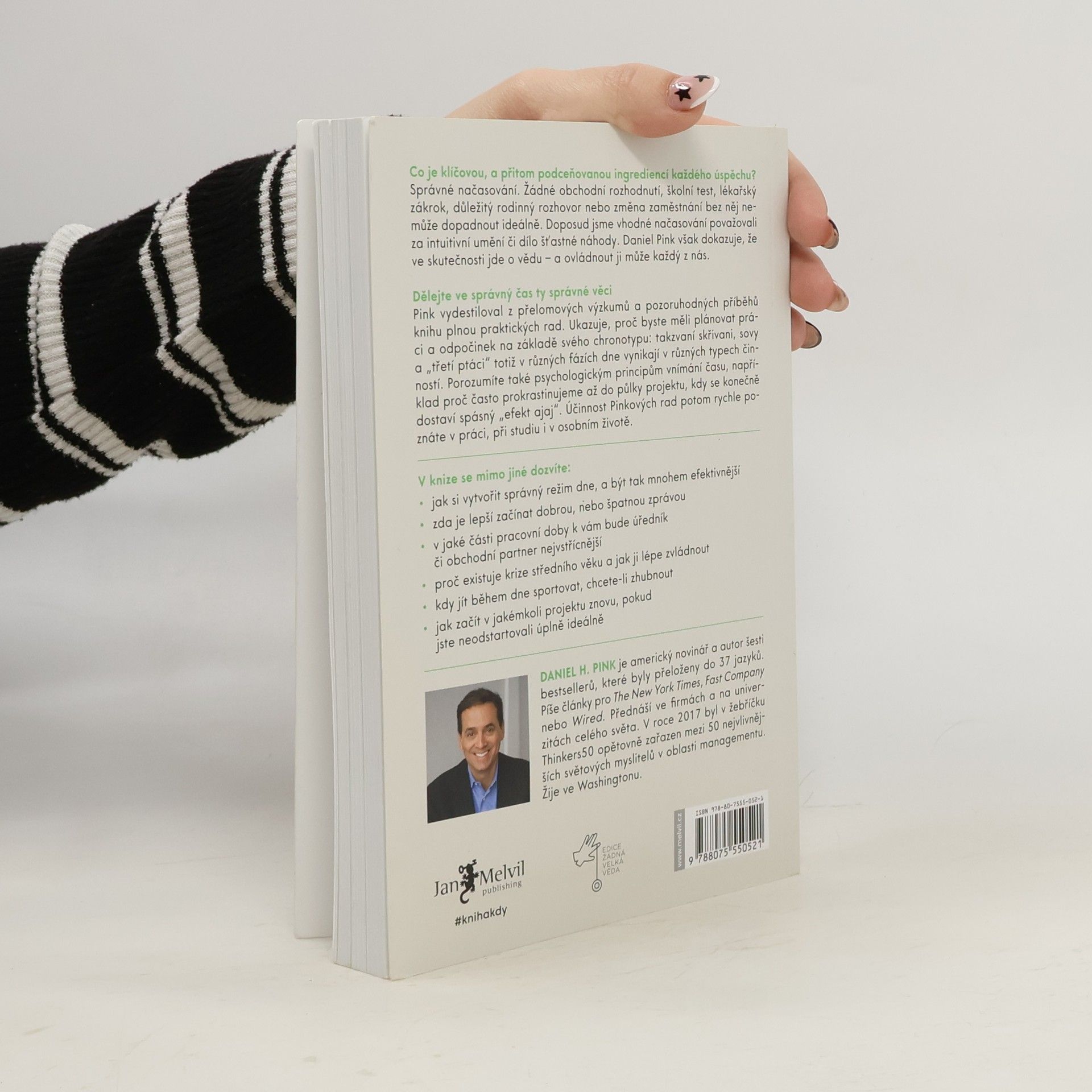 Také každé ráno plánujete, kdy co uděláte? A stejně jako všichni se zatím rozhodujete spíše náhodně? A víte, že s chytrým přístupem dostanete z každého dne mnohem víc? Daniel Pink přichází v nejlepší chvíli s manuálem krotilele času, to abyste se i vy stali mistry správných startů a uměli plně využít své energetické vrcholy i propady. Vždyť víte, čas není to hlavní, čas je to jediné. Správné načasování. Bez něj nemůže žádné obchodní rozhodnutí, školní test, lékařský zákrok, důležitý rodinný rozhovor ani změna zaměstnání dopadnout ideálně. Doposud jsme vhodné načasování považovali za intuitivní umění nebo dílo šťastné náhody. Ve skutečnosti jde však o vědu založenou na poznatcích z psychologie, sociologie a chronobiologie – a ovládnout ji může každý z nás. Dělejte ve správný čas ty správné věci Pink vydestiloval z přelomových výzkumů a pozoruhodných příběhů knihu plnou praktických rad. Ukazuje, proč byste měli plánovat práci a odpočinek na základě svého chronotypu: takzvaní skřivani, sovy a „třetí ptáci“ totiž v různých fázích dne vynikají v různých typech činností. Porozumíte také psychologickým principům vnímání času a událostí, nebo také proč často prokrastinujeme až do půlky projektu, kdy se konečně dostaví spásný „efekt ajaj“. Účinnost Pinkových rad potom rychle poznáte v práci, při studiu i v osobním životě.