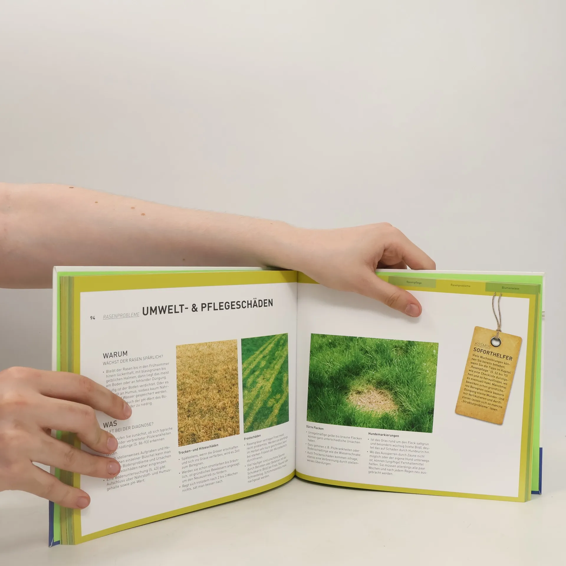 Alles, was man über den Rasen wissen muss: Leicht verständlich und übersichtlich bringt dieser Soforthelfer das Basiswissen auf den Punkt. Egal, ob man im Englischen Rasen Unkraut und Moos ohne Gift bekämpfen oder einen Duft- und Blumenrasen im naturnahen Garten anlegen möchte. Hier findet auch der Einsteiger eine schnelle Antwort und erprobte Tipps nach dem bewährten Soforthelfer-Prinzip in Schritt-für-Schritt-Fotos mit „Aha-Effekt“.