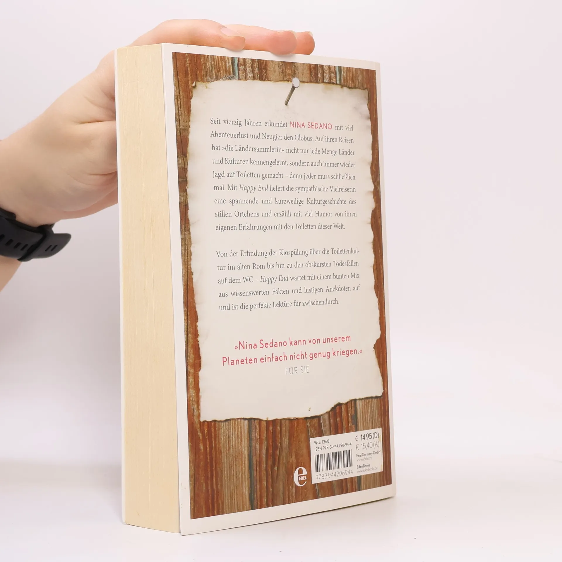 Seit vierzig Jahren erkundet NINA SEDANO mit viel Abenteuerlust und Neugier den Globus. Auf ihren Reisen hat »die Ländersammlerin« nicht nur jede Menge Länder und Kulturen kennengelernt, sondern auch immer wieder Jagd auf Toiletten gemacht – denn jeder muss schließlich mal. Mit Happy End liefert die sympathische Vielreiserin eine spannende und kurzweilige Kulturgeschichte des stillen Örtchens und erzählt mit viel Humor von ihren eigenen Erfahrungen mit den Toiletten dieser Welt. Von der Er ndung der Klospülung über die Toilettenkultur im alten Rom bis hin zu den obskursten Todesfällen auf dem WC – Happy End wartet mit einem bunten Mix aus wissenswerten Fakten und lustigen Anekdoten auf und ist die perfekte Lektüre für zwischendurch. »Nina Sedano kann von unserem Planeten einfach nicht genug kriegen.«