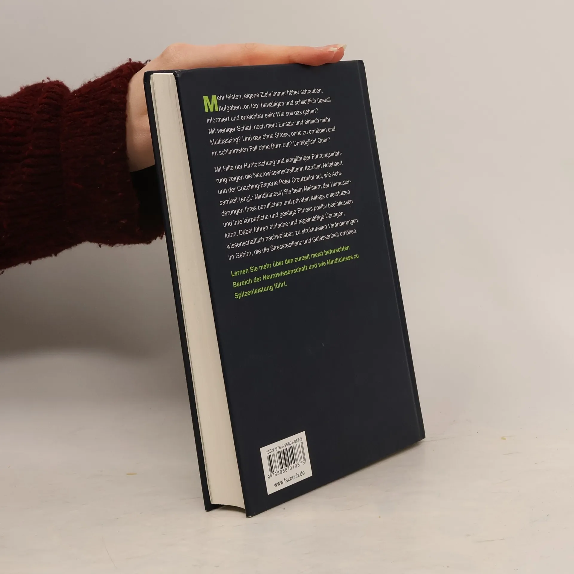 Schalten Sie Ihr Gehirn auf mehr ErfolgKennen Sie das? 6.00 Uhr aufstehen. An der roten Ampel E-Mails checken und hoffen, dass einen die grüne Welle nicht erwischt. Hat jemand auf den Projektvorschlag von gestern Nacht reagiert? Der Tag ist voll gebucht mit Meetings. Ein wichtiges Mittagessen mit dem Kollegen, der ein Projekt an sich reißen will. Der Hai! Am Abend Essengehen mit Geschäftspartnern. Danach nochmal E-Mails checken. Nach ein oder zwei Gläsern Wein schnell einschlafen und um 3:30 erschrocken aufwachen, weil die Präsentation für den nächsten Tag noch ansteht (…).STOPP! Sie sind schon vom Lesen ganz erschöpft? Begegnen Sie dennoch immer häufiger dem Denkmuster, Leistung könne ständig gesteigert werden? Wie kann das gutgehen?Mit Hilfe der Hirnforschung und langjähriger Führungserfahrung zeigen die Neurowissenschaftlerin Karolien Notebaert und der Coaching-Experte Peter Creutzfeldt wie durch "Achtsamkeit" (engl. "Mindfulness") sich etwa gesteigerte Leistungsfähigkeit, vermehrte Erreichbarkeit oder ständiges Multitasking nicht nur bewältigen lassen, sondern wie diese Methode die körperliche und geistige Fitness positiv beeinflusst. Dabei führen einfache Übungen, wissenschaftlich nachweisbar, zu strukturellen Veränderungen im Gehirn, die dessen Funktion verbessern.