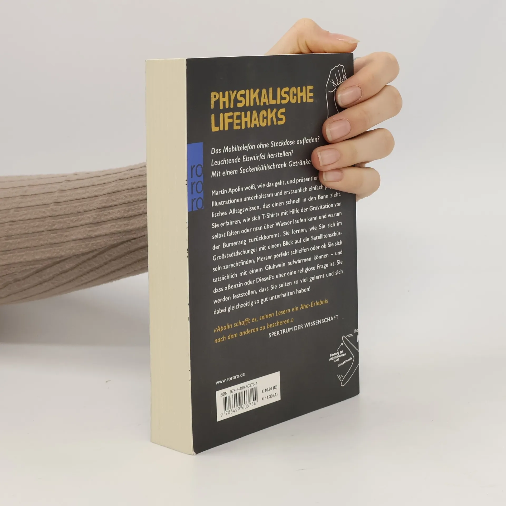 Das Mobiltelefon ohne Steckdose aufladen? Mit dem Fahrrad durch einen Looping fahren? Mit einem Sockenkühlschrank Getränke kühlen?Martin Apolin weiß, wie das geht, und präsentiert mit vielen Illustrationen unterhaltsam und erstaunlich einfach physikalisches Alltagswissen, das einen schnell in den Bann zieht. Sie erfahren, wie sich T-Shirts mit Hilfe der Gravitation von selbst falten oder man tatsächlich über Wasser laufen kann und warum der Bumerang zurückkommt. Sie lernen, wie Sie sich im Großstadtdschungel mit einem Blick auf die Satellitenschüsseln zurechtfinden, Messer perfekt schleifen oder ob Sie sich tatsächlich mit einem Glühwein aufwärmen können – und dass „Benzin oder Diesel“ eher eine religiöse Frage ist. Sie werden feststellen, dass Sie selten so viel gelernt und sich dabei gleichzeitig so gut unterhalten haben! Wer gern verrückte Experimente macht und beispielsweise Spaß daran hat, auf der nächsten Party mit Eiswürfeln anzugeben, die im Dunkeln leuchten, sollte zu diesem Buch greifen.In diesem Buch gelingt es Martin Apolin, Begeisterung für Physik zu wecken. Bei seinen vergnüglichen Erläuterungen verzichtet er weitgehend auf Formeln und lange Rechenwege. Interessierte können solche Details im Anhang nachschlagen.