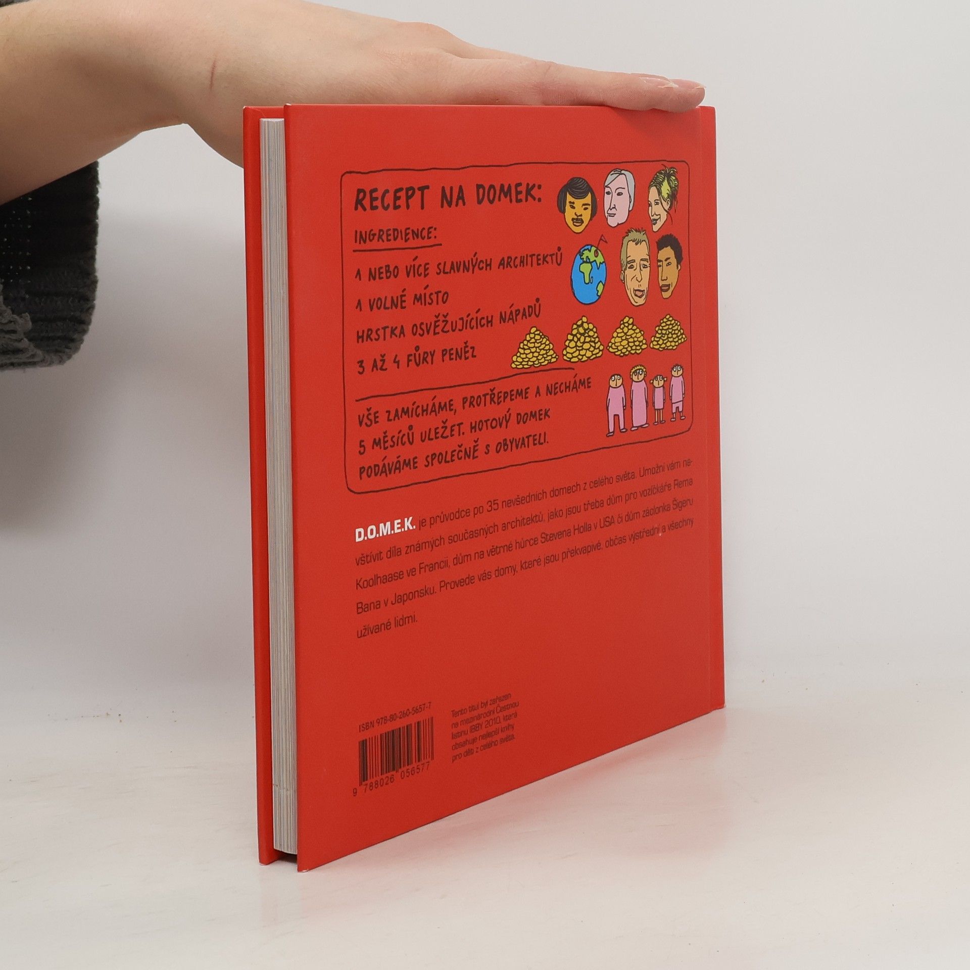 Knížka D.O.M.E.K. důvtipná obrázková mozaika efektních konstrukcí je průvodcem po 35 současných domech z celého světa. Domy v knížce zobrazené slouží různým účelům: v některých můžete bydlet, v některých jen přespat, v některých se pracuje a v některých pije čaj. Dozvíte se, kde ten který dům stojí, proč byl vymyšlený a postavený tak, jak byl, a kteří architekti ho navrhli. Všechno v knížce je kreslené. A kromě domů v ní uvidíte také spoustu zvířat, lidí, ufonů a příšerek a procestujete skoro celý svět. Knížka D.O.M.E.K. je určená dětem, jejich rodičům a prarodičům, kamarádům a kamarádkám.