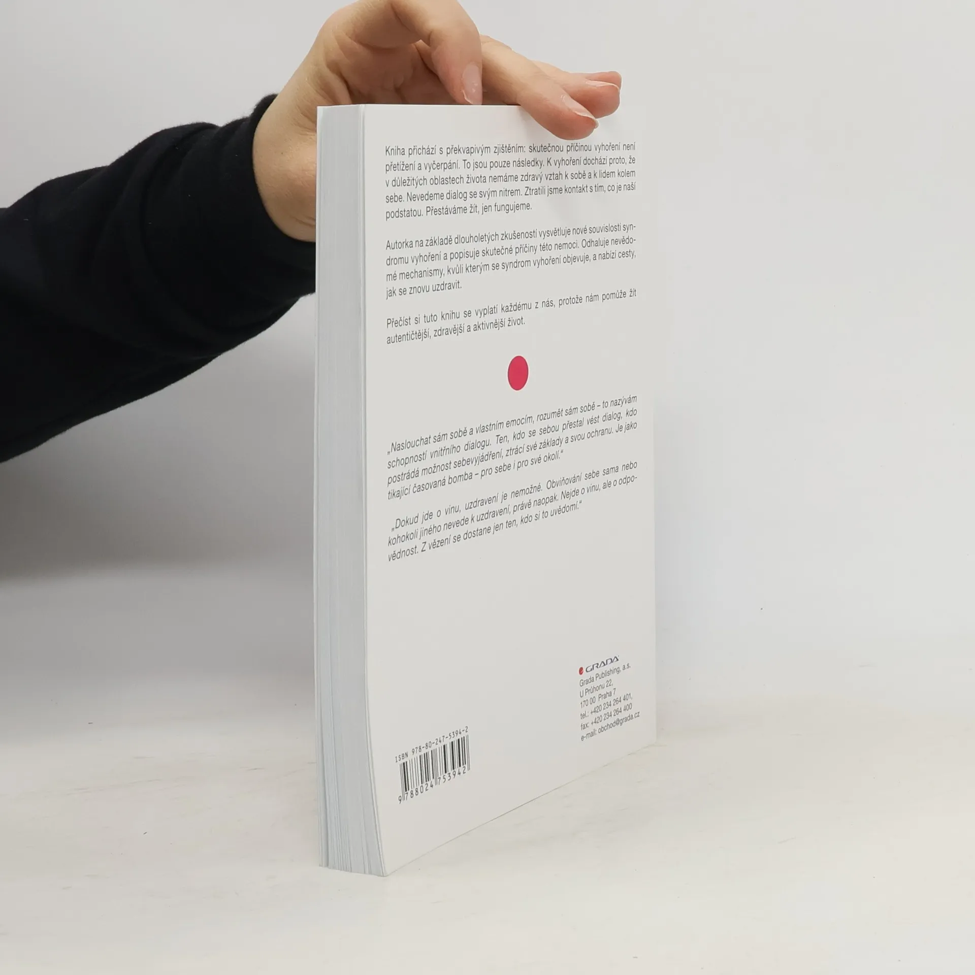 Kniha přichází s překvapivým zjištěním: skutečnou příčinou vyhoření není přetížení a vyčerpání. To jsou pouze následky. K vyhoření dochází proto, že v důležitých oblastech života nemáme zdravý vztah k sobě a k lidem kolem sebe. Nevedeme dialog se svým nitrem. Ztratili jsme kontakt s tím, co je naší podstatou. Přestáváme žít, jen fungujeme. Autorka na základě dlouholetých zkušeností vysvětluje nové souvislosti syndromu vyhoření a popisuje skutečné příčiny této nemoci. Odhaluje nevědomé mechanismy, kvůli kterým se syndrom vyhoření objevuje, a nabízí cesty, jak se znovu uzdravit. Přečíst si tuto knihu se vyplatí každému z nás, protože nám pomůže žít autentičtější, zdravější a aktivnější život.
