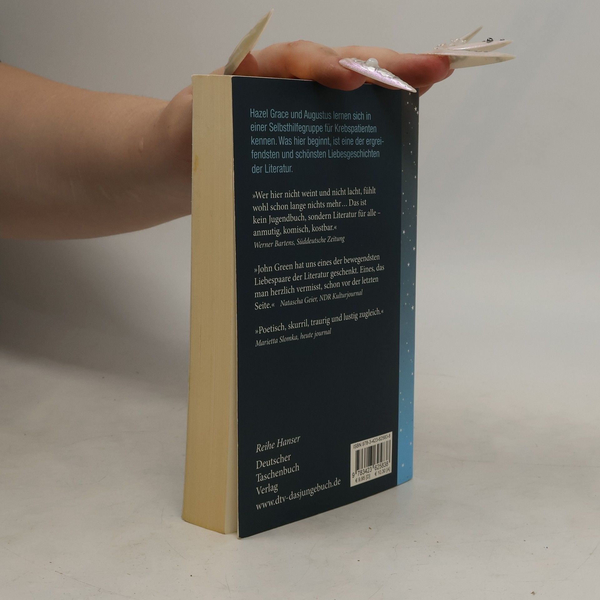 „Krebsbücher sind doof“, sagt die 16-jährige Hazel, die selbst Krebs hat. Sie will auf gar keinen Fall bemitleidet werden und kann mit Selbsthilfegruppen nichts anfangen. Bis sie in einer Gruppe auf den intelligenten, gut aussehenden und umwerfend schlagfertigen Gus trifft. Der geht offensiv mit seiner Krankheit um. Hazel und Gus diskutieren Bücher, hören Musik, sehen Filme und verlieben sich ineinander - trotz ihrer Handicaps und Unerfahrenheit. Gus macht Hazels großen Traum wahr: Gemeinsam fliegen sie nach Amsterdam, um dort Peter Van Houten zu treffen, den Autor von Hazels absolutem Lieblingsbuch. Ein tiefgründiges, emotionales und zugleich freches Jugendbuch über Krankheit, Liebe und Tod. Ausgezeichnet mit dem Deutschen Jugendliteraturpreis 2013 (Preis der Jugendjury).