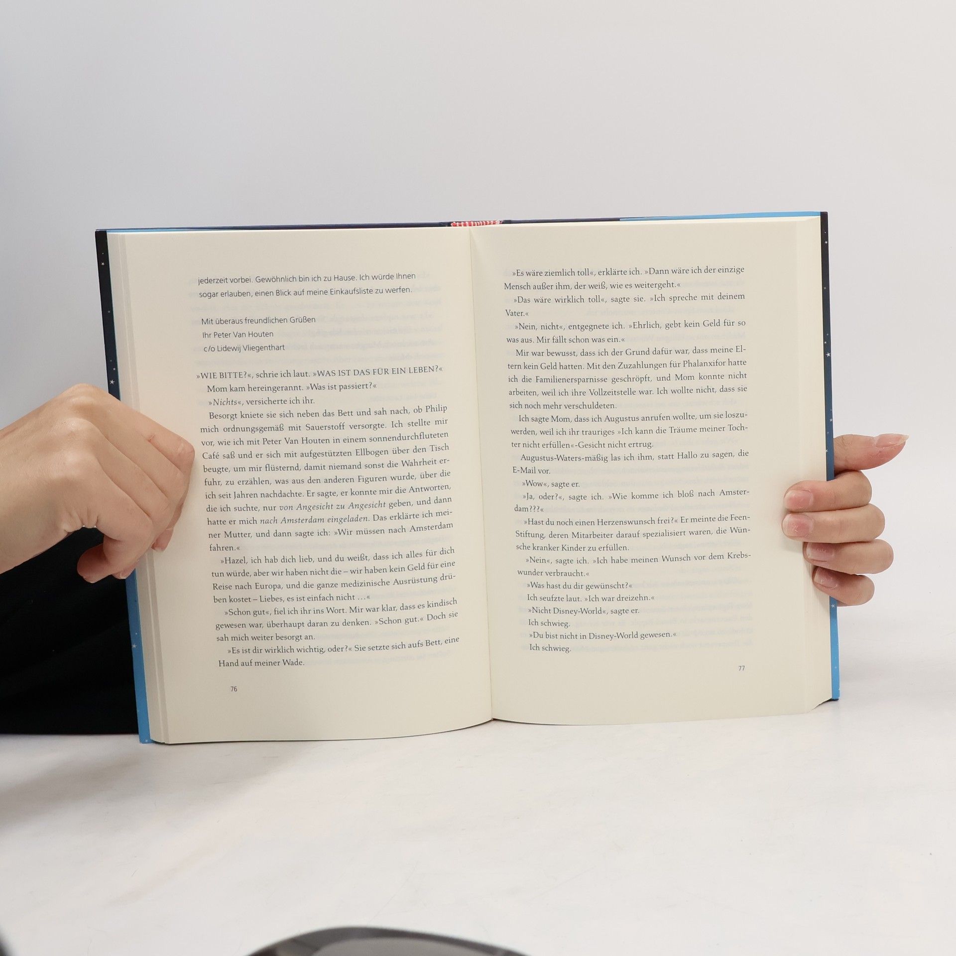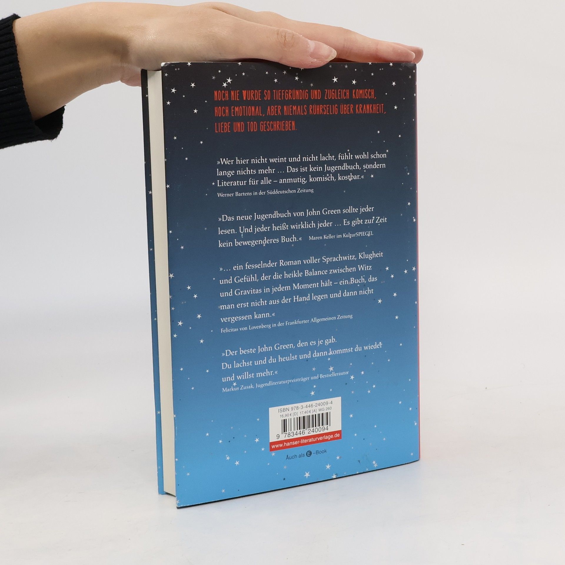„Krebsbücher sind doof“, sagt die 16-jährige Hazel, die selbst Krebs hat. Sie will auf gar keinen Fall bemitleidet werden und kann mit Selbsthilfegruppen nichts anfangen. Bis sie in einer Gruppe auf den intelligenten, gut aussehenden und umwerfend schlagfertigen Gus trifft. Der geht offensiv mit seiner Krankheit um. Hazel und Gus diskutieren Bücher, hören Musik, sehen Filme und verlieben sich ineinander - trotz ihrer Handicaps und Unerfahrenheit. Gus macht Hazels großen Traum wahr: Gemeinsam fliegen sie nach Amsterdam, um dort Peter Van Houten zu treffen, den Autor von Hazels absolutem Lieblingsbuch. Ein tiefgründiges, emotionales und zugleich freches Jugendbuch über Krankheit, Liebe und Tod.