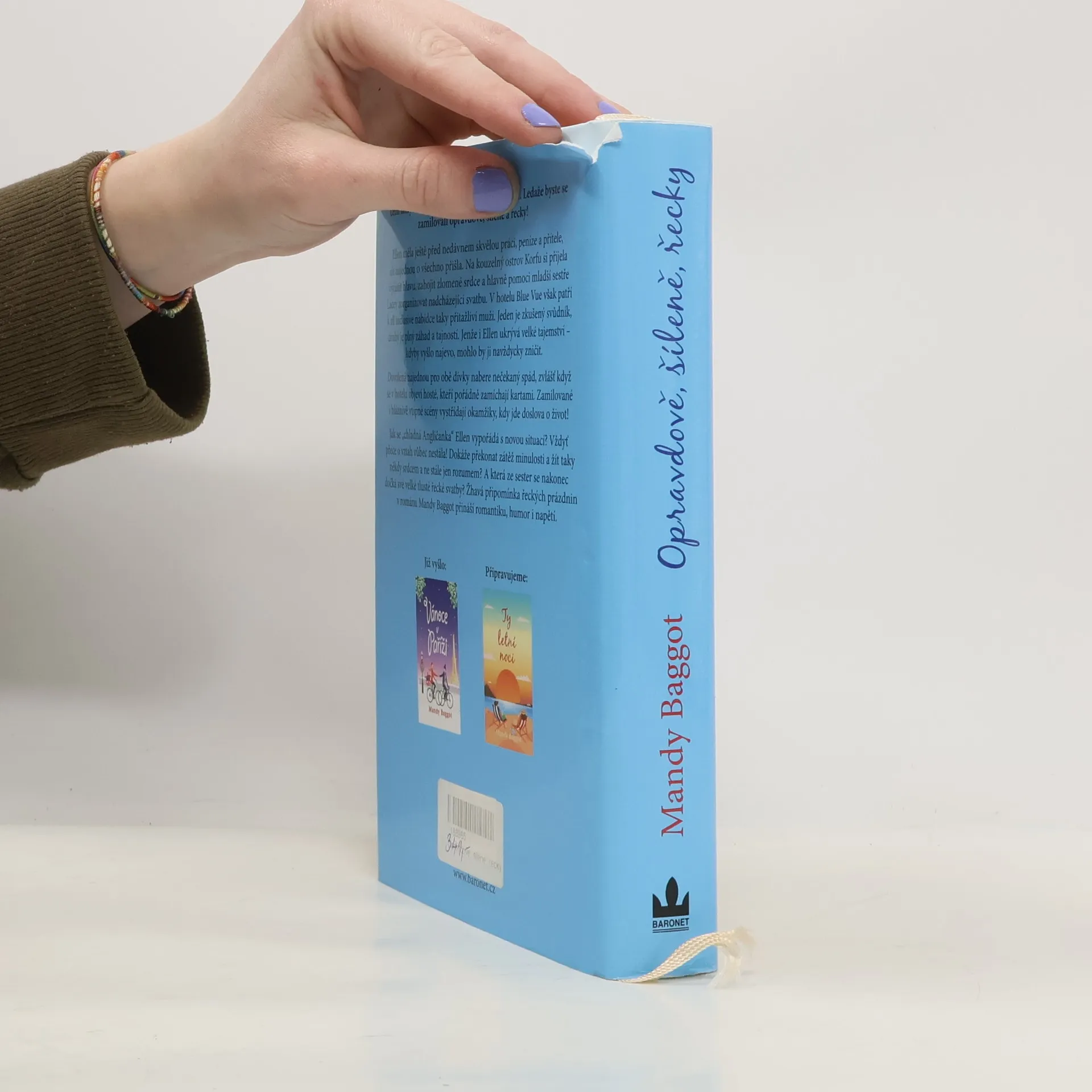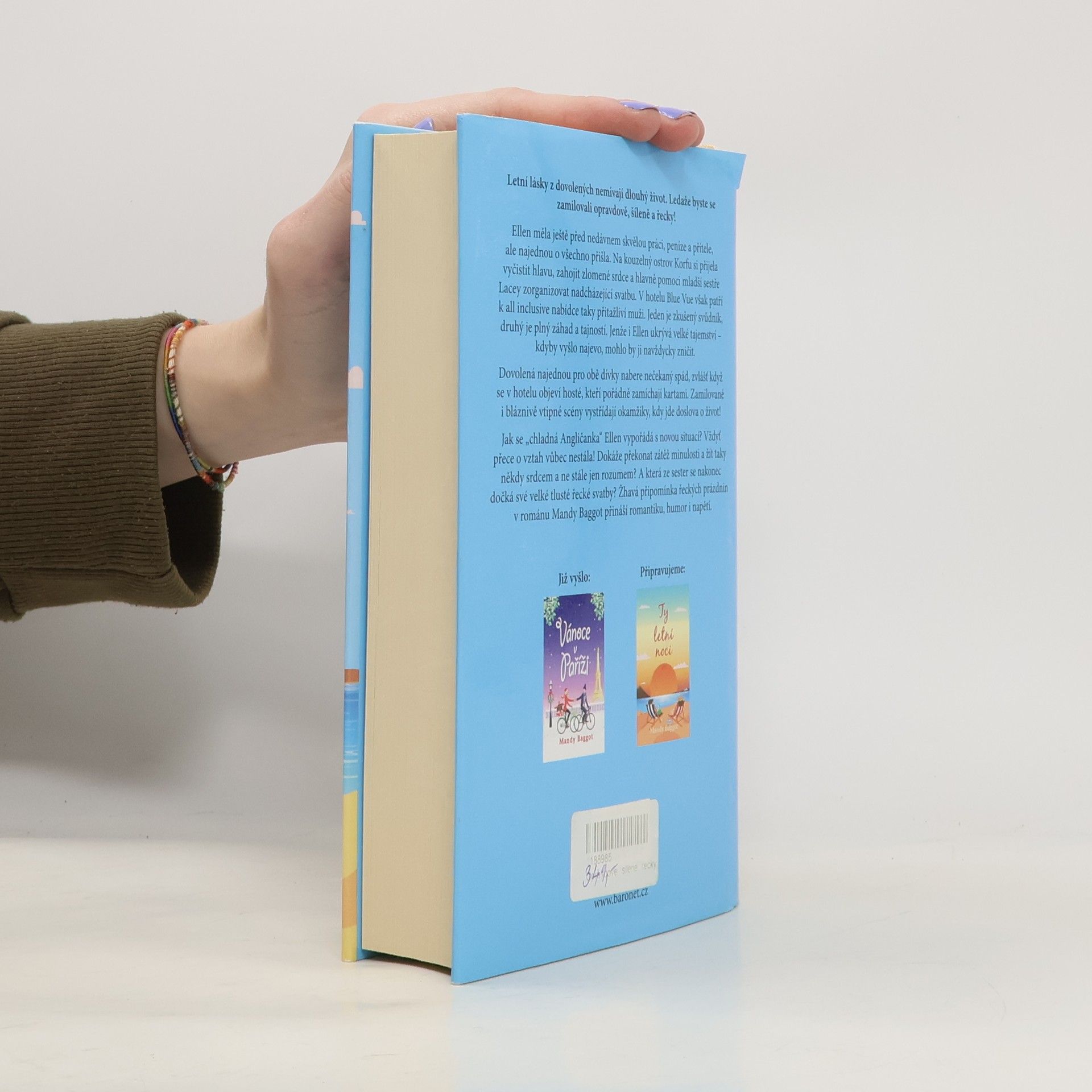 Slunce, moře a sexy cizinec – co víc si lze na dovolené přát? Žhavá připomínka řeckých prázdnin v románu Mandy Baggot přináší romantiku, humor i napětí v příběhu dvou sester. Starší a rozumná Ellen ještě před nedávnem měla skvělou práci, peníze a přítele, ale najednou o všechno přišla. Na kouzelný ostrov Korfu si přijela vyčistit hlavu, zahojit zlomené srdce a hlavně pomoci mladší sestře Lacey zorganizovat nadcházející svatbu. Jenže v hotelu Blue Vue patří k all-inclusive nabídce taky přitažliví muži. Jeden je zkušený svůdník, druhý je plný záhad a tajemství. Dovolená najednou pro obě dívky nabere nečekaný spád. Ellen ale o vztah nestojí, nebo ano? A která ze sester se nakonec dočká své velké tlusté řecké svatby?