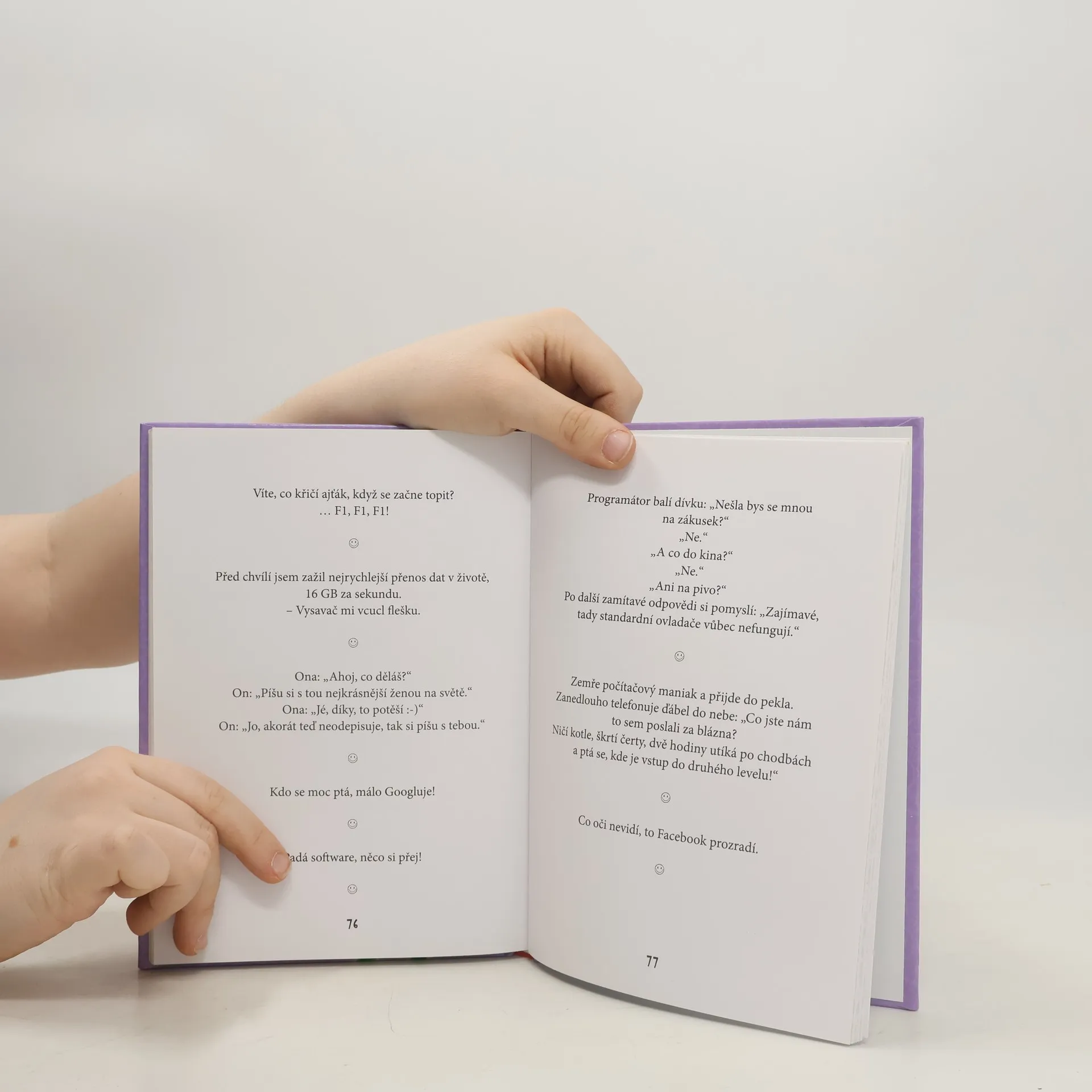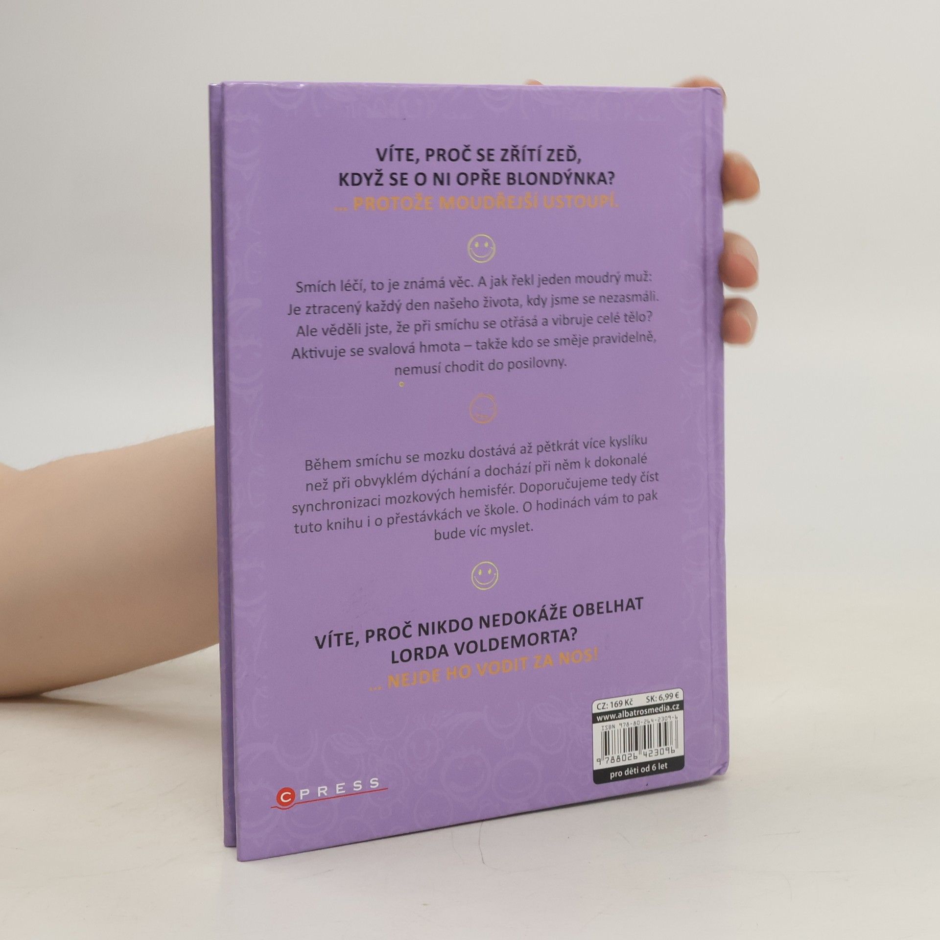 VÍTE, PROČ SE ZŘÍTÍ ZEĎ, KDYŽ SE O NI OPŘE BLONDÝNKA? … PROTOŽE MOUDŘEJŠÍ USTOUPÍ. Smích léčí, to je známá věc. A jak řekl jeden moudrý muž: Je ztracený každý den našeho života, kdy jsme se nezasmáli. Ale věděli jste, že při smíchu se otřásá a vibruje celé tělo? Aktivuje se svalová hmota – takže kdo se směje pravidelně, nemusí chodit do posilovny. Během smíchu se mozku dostává až pětkrát více kyslíku než při obvyklém dýchání a dochází při něm k dokonalé synchronizaci mozkových hemisfér. Doporučujeme tedy číst tuto knihu i o přestávkách ve škole. O hodinách vám to pak bude víc myslet.