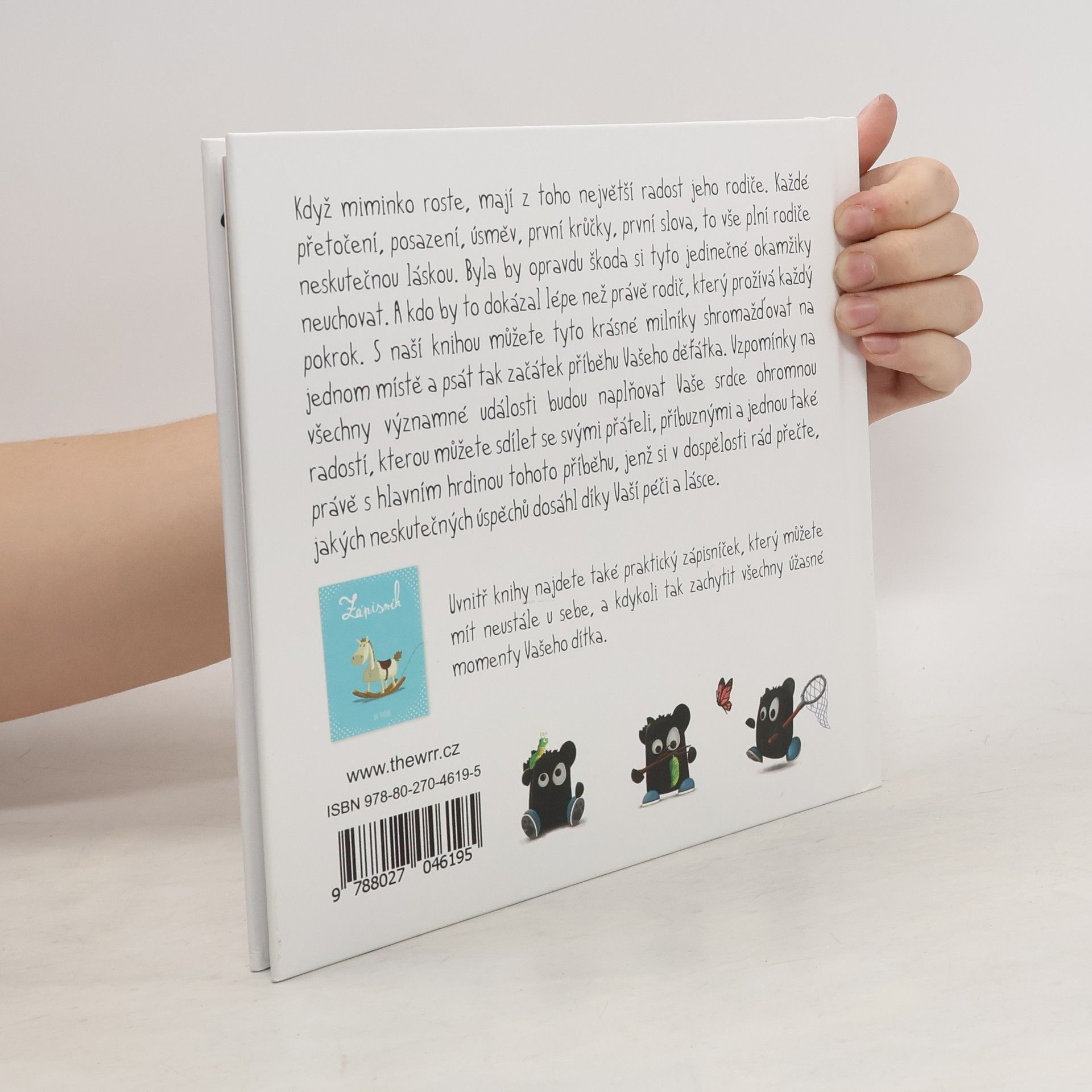Když miminko roste, mají z toho největší radost jeho rodiče. Každé přetočení, posazení, úsměv, první krůčky, první slova, to vše plní rodiče neskutečnou láskou. Byla by opravdu škoda si tyto jedinečné okamžiky neuchovat. A kdo by to dokázal lépe než právě rodič, který prožívá každý pokrok. S naší knihou můžete tyto krásné milníky shromažďovat na jednom místě a psát tak začátek příběhu Vašeho děťátka. Vzpomínky na všechny významné události budou naplňovat Vaše srdce ohromnou radostí, kterou můžete sdílet se svými přáteli, příbuznými a jednou také právě s hlavním hrdinou tohoto příběhu, jenž si v dospělosti rád přečte, jakých neskutečných úspěchů dosáhl díky Vaší péči a lásce. Uvnitř knihy najdete také praktický zápisníček, který můžete mít neustále u sebe, a kdykoli tak zachytit všechny úžasné momenty Vašeho dítka.