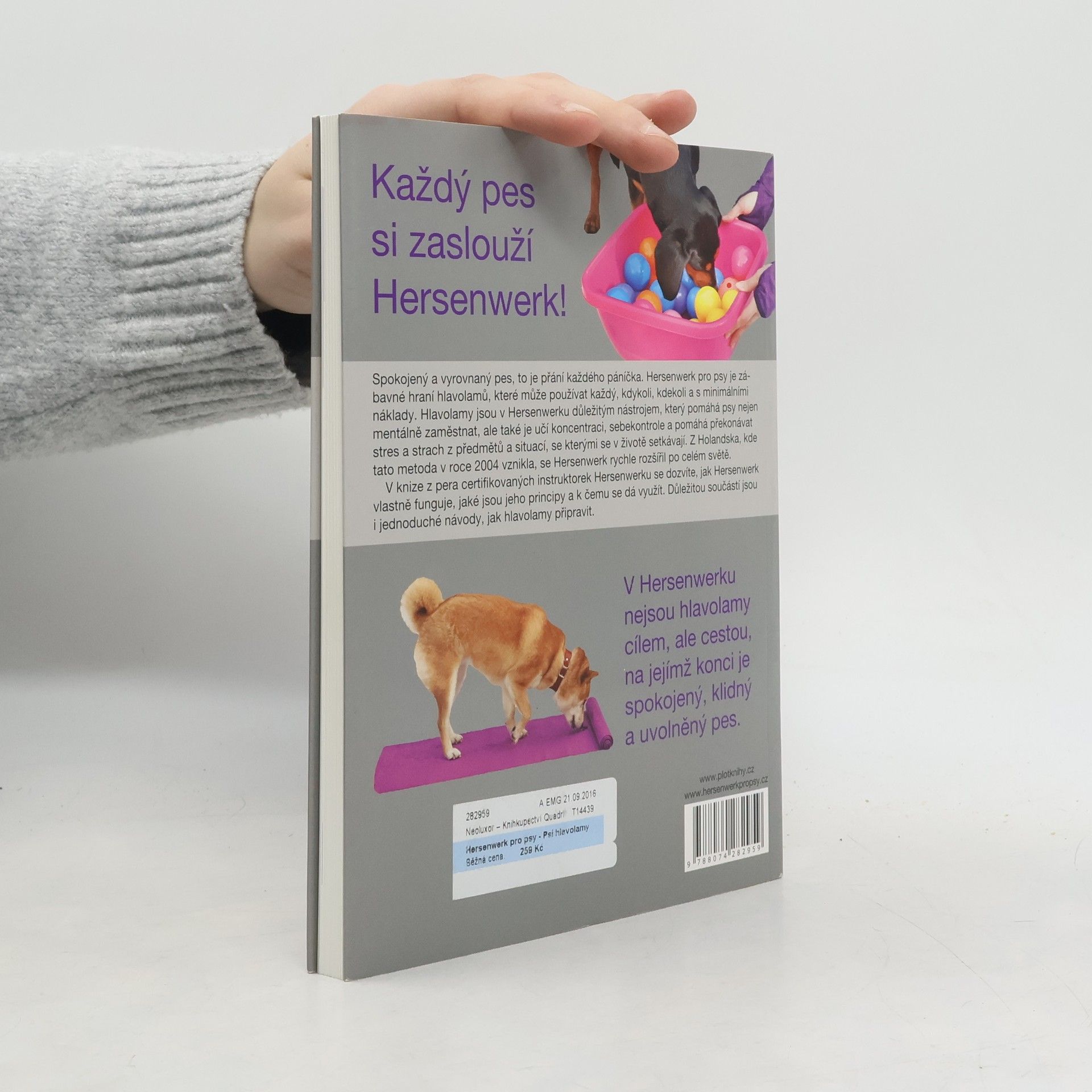 Spokojený a vyrovnaný pes, to je přání každého páníčka. Hersenwerk pro psy je zábavné hraní hlavolamů, které může používat každý, kdykoli, kdekoli a s minimálními náklady. Hlavolamy jsou v Hersenwerku důležitým nástrojem, který pomáhá psy nejen mentálně zaměstnat, ale také je učí koncentraci, sebekontrole a zvládání vlastních strachů či nedůvěry. Z Holandska, kde tato metoda v roce 2004 vznikla, se Hersenwerk rychle rozšířil po celém světě. V knize z pera certifikovaných instruktorek Hersenwerku se dozvíte, jak Hersenwerk vlastně funguje, jaké jsou jeho principy a k čemu se dá využít. Důležitou součástí jsou i jednoduché návody, jak hlavolamy připravit.