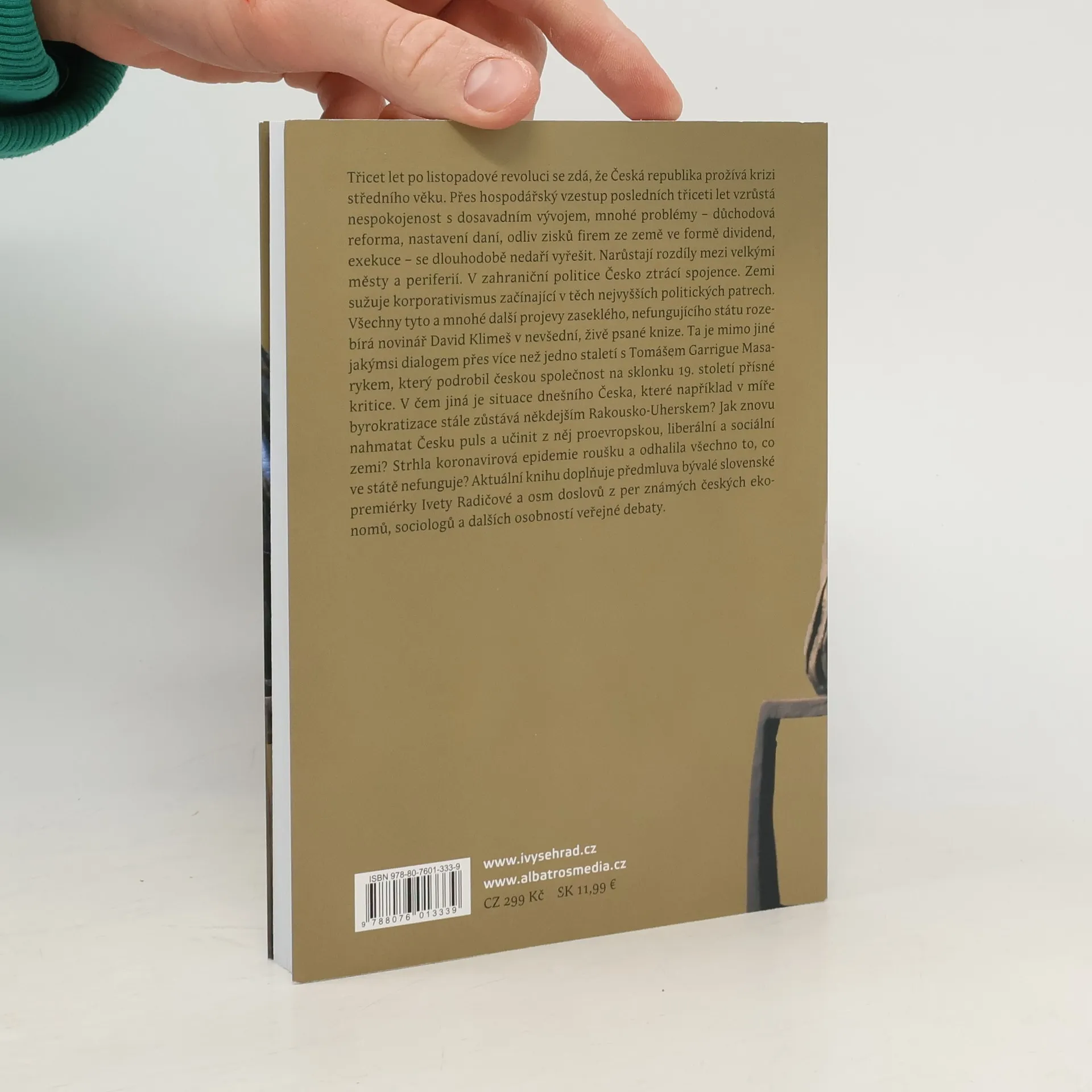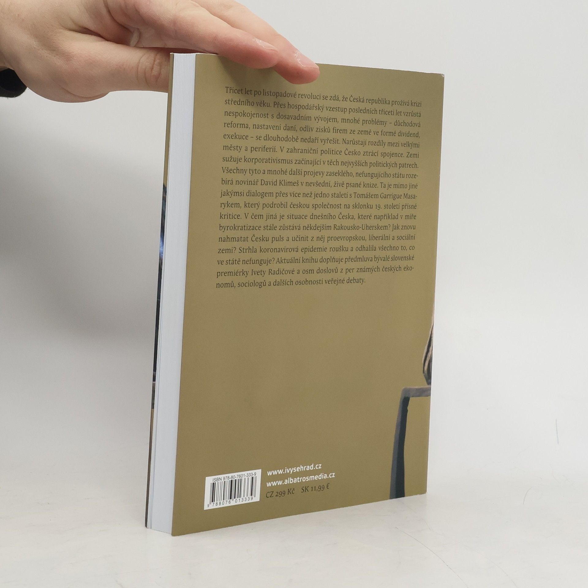 Novinář David Klimeš přináší ve velmi aktuální knize přehled některých z těch nejakutnějších problémů, jimž dnes čelí Česká republika. Situaci přirovnává k předčasné krizi středního věku, která se projevuje nespokojeností, nejistotou a neřešením příčin problémů. Výsledkem je „zaseklý stát“ bez silných sdílených hodnot, který nedokáže řešit některé nejnaléhavější úkoly. K nim patří například exekuce a dluhová past, do které padá stále větší procento obyvatel Česka, nebo důchodová reforma, kterou se stále nepodařilo prosadit. Tyto a další palčivé problémy autor rozebírá na základě aktuálních dat, ale nechybí ani srovnání s masarykovským postojem k „naší nynější krizi“. Text doplňují diskusní příspěvky dalších renomovaných autorů jako jsou Danuše Nerudová, Daniel Münich, Daniel Prokop či Tomáš Němeček.
