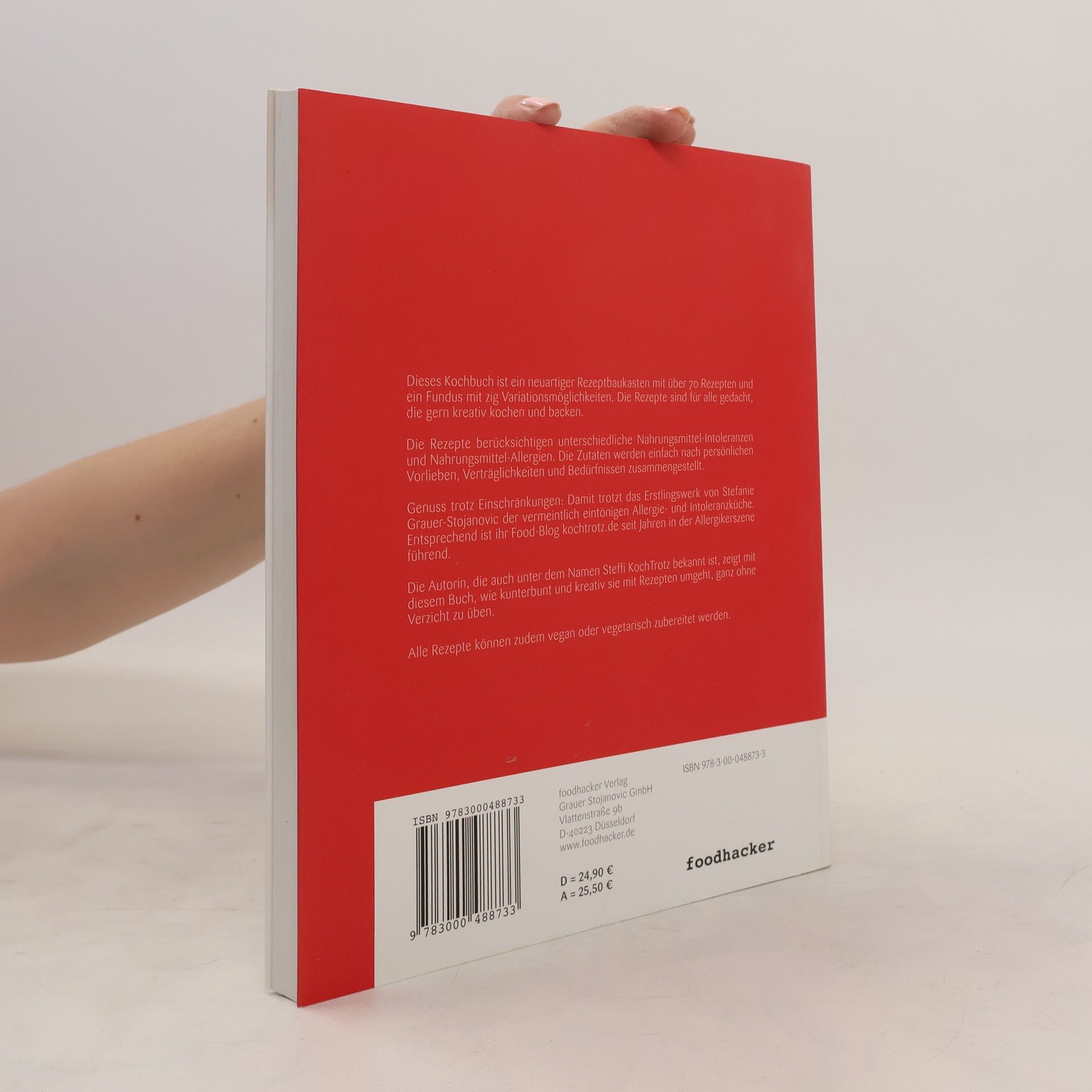 Das erste Kochbuch weltweit für Mehrfach-Intoleranzen und Nahrungsmittel-Allergien. Dieses Kochbuch ist ein neuartiger Rezeptbaukasten mit über 70 Rezepten und ein Fundus mit zig Variationsmöglichkeiten. Die Rezepte sind für alle gedacht, die gern kreativ kochen und backen. Die Rezepte berücksichtigen unterschiedliche Nahrungsmittel-Intoleranzen und Nahrungsmittel-Allergien. Die Zutaten werden einfach nach persönlichen Vorlieben, Verträglichkeiten und Bedürfnissen zusammengestellt. Genuss trotz Einschränkungen: Damit trotzt das Erstlingswerk von Stefanie Grauer-Stojanovic der vermeintlich eintönigen Allergie- und Intoleranzküche. Entsprechend ist ihr Food-Blog kochtrotz. de seit Jahren in der Allergikerszene führend. Die Autorin, die auch unter dem Namen Steffi KochTrotz bekannt ist, zeigt mit diesem Buch, wie kunterbunt und kreativ sie mit Rezepten umgeht, ganz ohne Verzicht zu üben. Im Kochbuch „KochTrotz - Kreativ genießen trotz Einschränkungen, Intoleranzen und Allergien“ finden finden sich Rezepte für Singles, Paare und Familien. Die Rezeptvielfalt erstreckt sich von sojafreien Milchalternativen, Suppen, Salate, Hauptgerichte, Backenwaren, Desserts und Vorratsrezepte. Alle Rezepte können zudem vegan oder vegetarisch zubereitet werden.