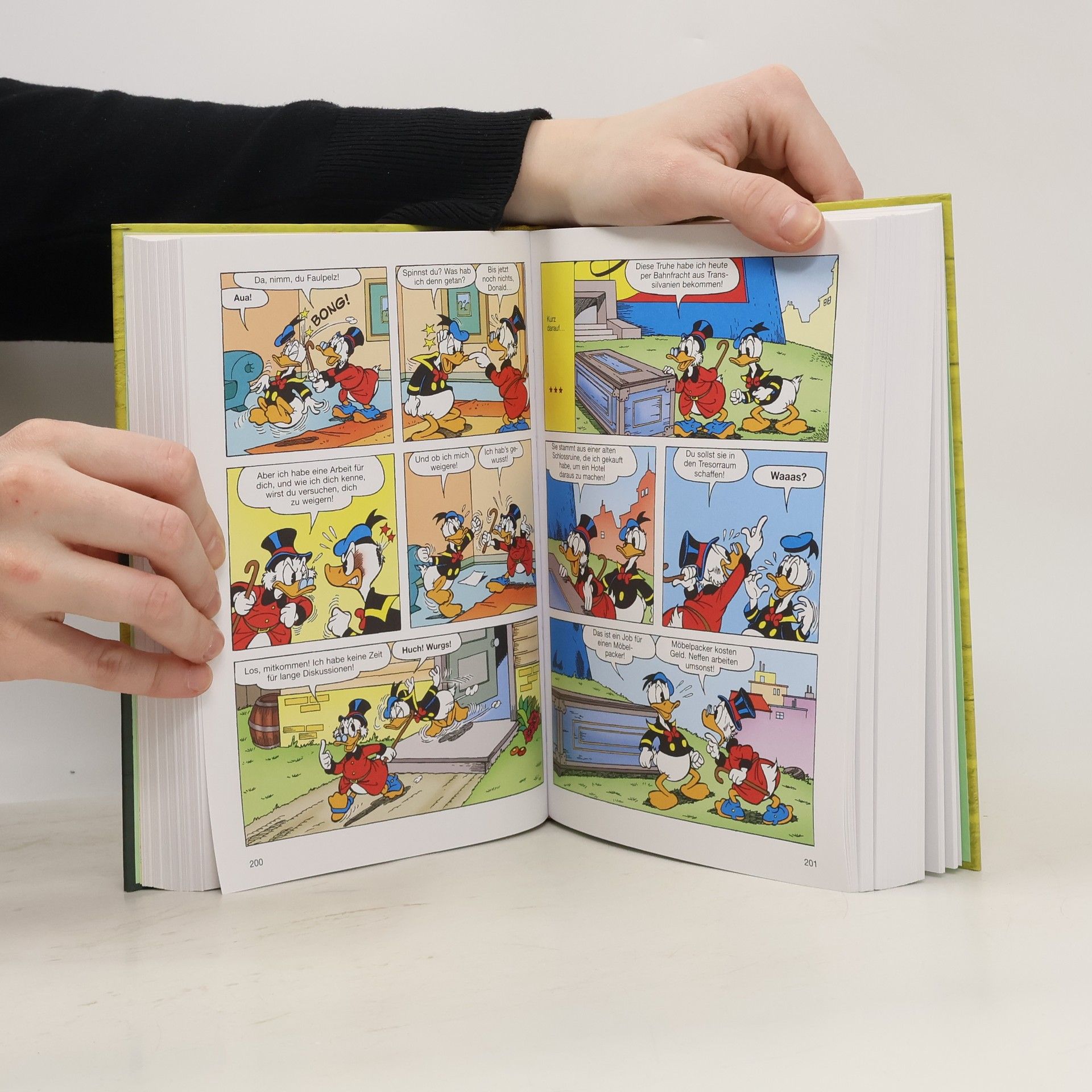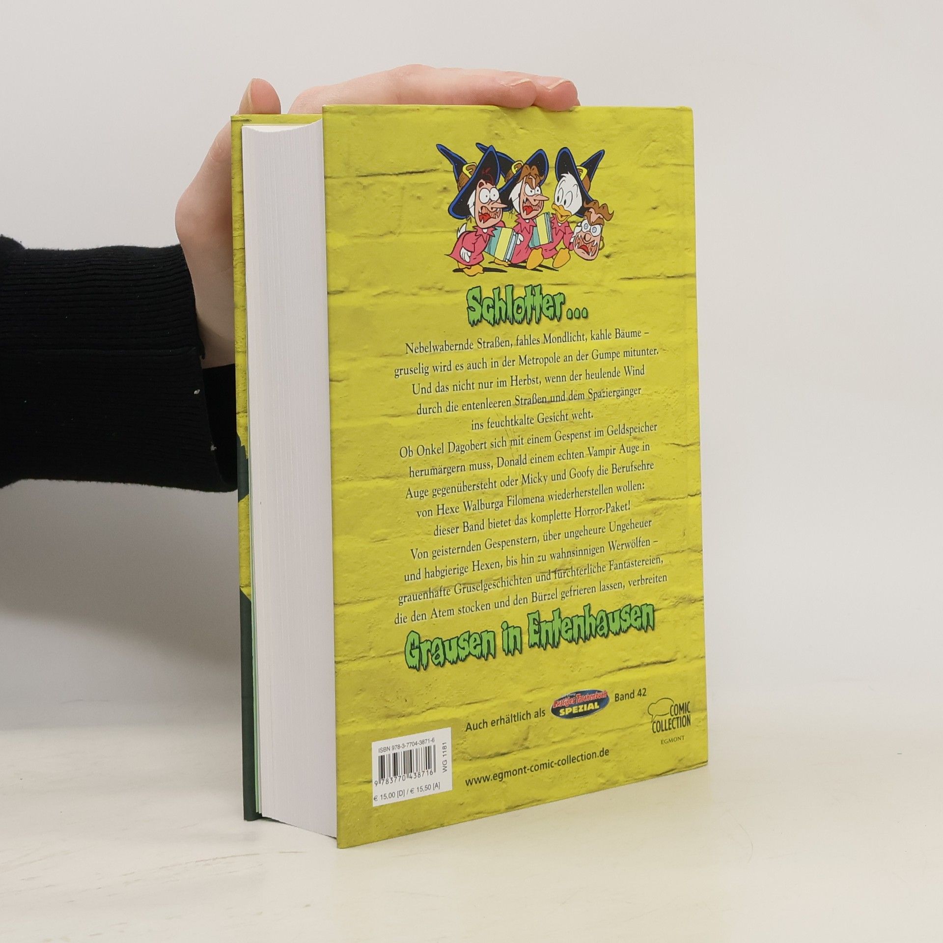 Nebelwabernde Straßen, fahles Mondlicht, kahle Bäume – gruselig wird es auch in der Metropole an der Gumpe mitunter. Und das nicht nur im Herbst, wenn der heulende Wind durch die entenleeren Straßen und dem Spaziergänger ins feuchtkalte Gesicht weht. Ob Onkel Dagobert sich mit einem Gespenst im Geldspeicher herumärgern muss, Donald einem echten Vampir Auge in Auge gegenübersteht oder Micky und Goofy die Berufsehre von Hexe Walburga Filomena wiederherstellen wollen: dieser Band bietet das komplette Horror-Paket! Von geisternden Gespenstern, über ungeheure Ungeheuer und habgierige Hexen, bis hin zu wahnsinnigen Werwölfen – grauenhafte Gruselgeschichten und fürchterliche Fantastereien, die den Atem stocken und den Bürzel gefrieren lassen!