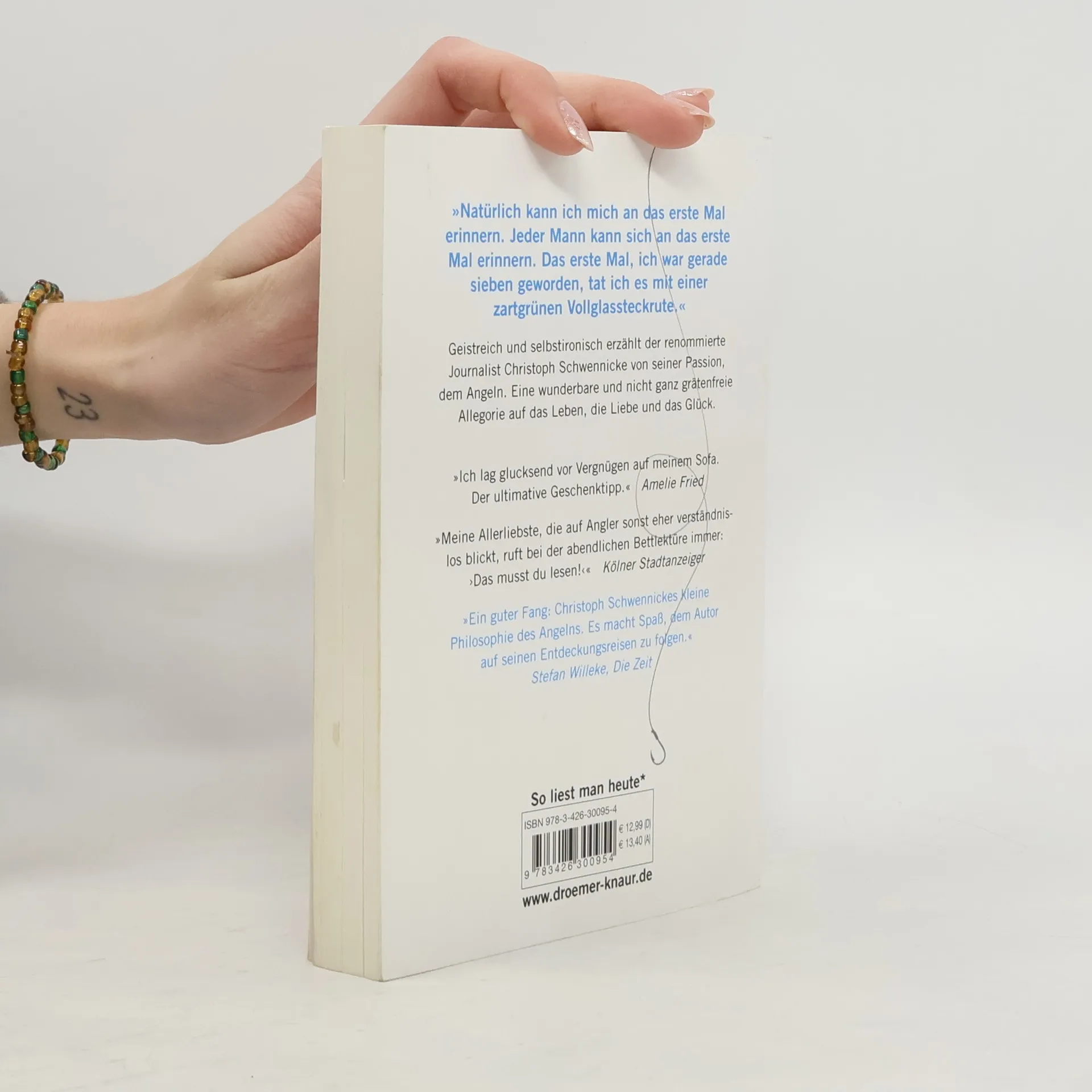 »Ich lag glucksend vor Vergnügen auf meinem Sofa.« – verriet Amelie Fried begeistert nach der Lektüre von Christoph Schwennickes Buch „Das Glück am Haken“. Geistreich und selbstironisch erzählt Schwennicke, warum Angeln wie das Leben ist: Wir wollen immer »den ganz Großen« und gehen meistens leer aus. Aber immer wenn wir doch mal was erwischen, erleben wir Momente tiefsten Glücks.