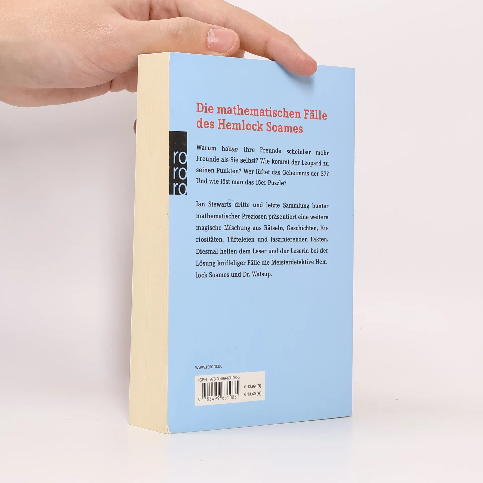 Warum haben Ihre Freunde scheinbar mehr Freunde als Sie selbst? Wie kommt der Leopard zu seinen Punkten? Wer lüftet das Geheimnis der 37? Warum sind Hexakosioihexekontahexaphobiker schlicht im Irrtum? Und wie löst man das 15er-Puzzle? Hier kommt Ian Stewarts dritte und letzte Sammlung bunter mathematischer Preziosen: Fakten, Anekdoten, Spiele, Knobeleien, Kuriosa, Grundlagenwissen und überraschende Neuigkeiten. Schmankerl für Krimiliebhaber: Conan-Doyle-Fan Stewart streut in seine rund 150 Kabinettstückchen immer wieder mathematische Detektivgeschichten ein, deren Helden ein gewisser Hemlock Soames und sein Sidekick Dr. Whatsup sind, wohnhaft in der Bakerstreet 222B. In den dramatischen Schlusskapiteln kommt es in der Schweiz zu einer letzten, tödlichen Konfrontation mit Soames’ Erzfeind, dem teuflischen Professor Mogiarty… Die beiden ersten Bände, «Professor Stewarts Mathematisches Sammelsurium» sowie «Professor Stewarts Mathematische Schätze» haben Ian Stewart auch in Deutschland zum Lieblingsautor vieler Mathematik-Fans werden lassen. Dieser abschließende Band der Sammelsurium-Trilogien bietet wieder kurzweiliges mathematisches Infotainment, das kaum ein Autor so gut beherrscht wie Ian Stewart.