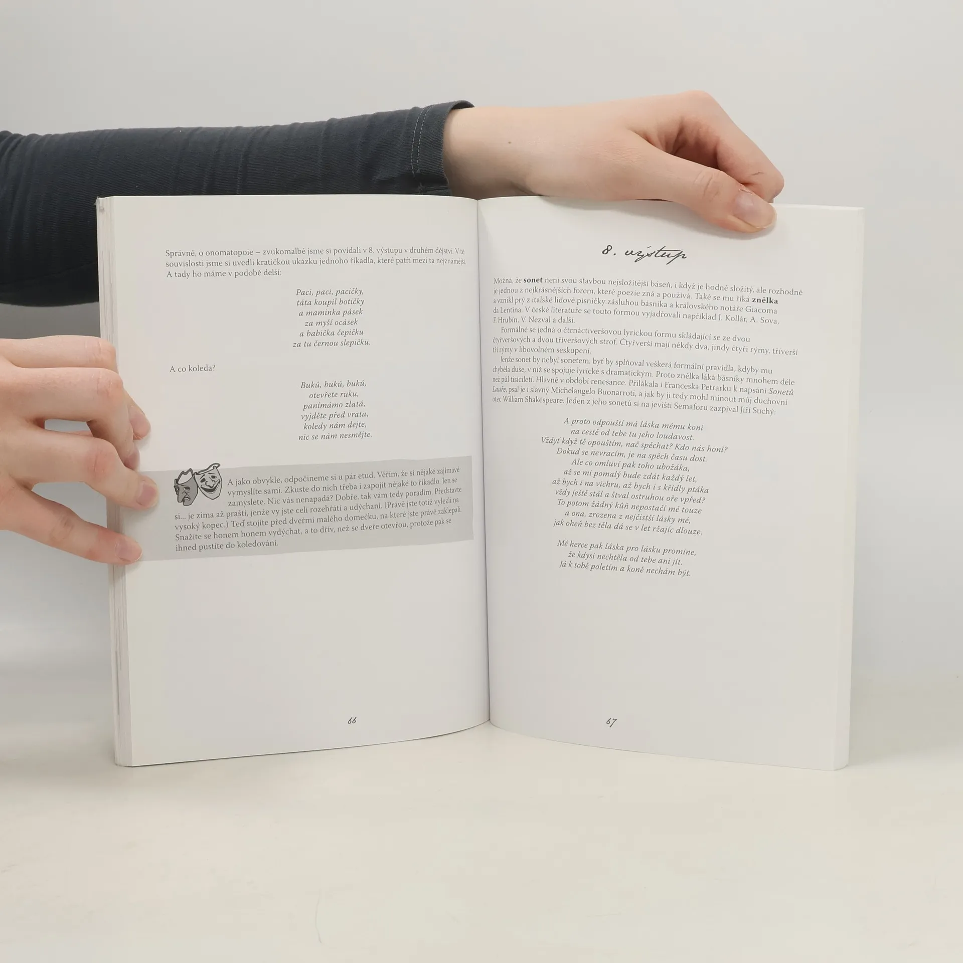 V pěti dějstvích a čtyřech mezihrách představují průvodci - princ Hamlet a komiksoví mušketýři Poštrachandl a Klábrštajn - dětem teorii poezie, historii divadla, drama. Děti se mohou též naučit praktickým dovednostem: správnému dýchání, držení těla, uvolněné chůzi. Text je prokládán různými náměty na drobné etudy a úkoly Příručka pro starší děti komunikativní formou představuje svět divadla a také učí mnoha praktickým dovednostem