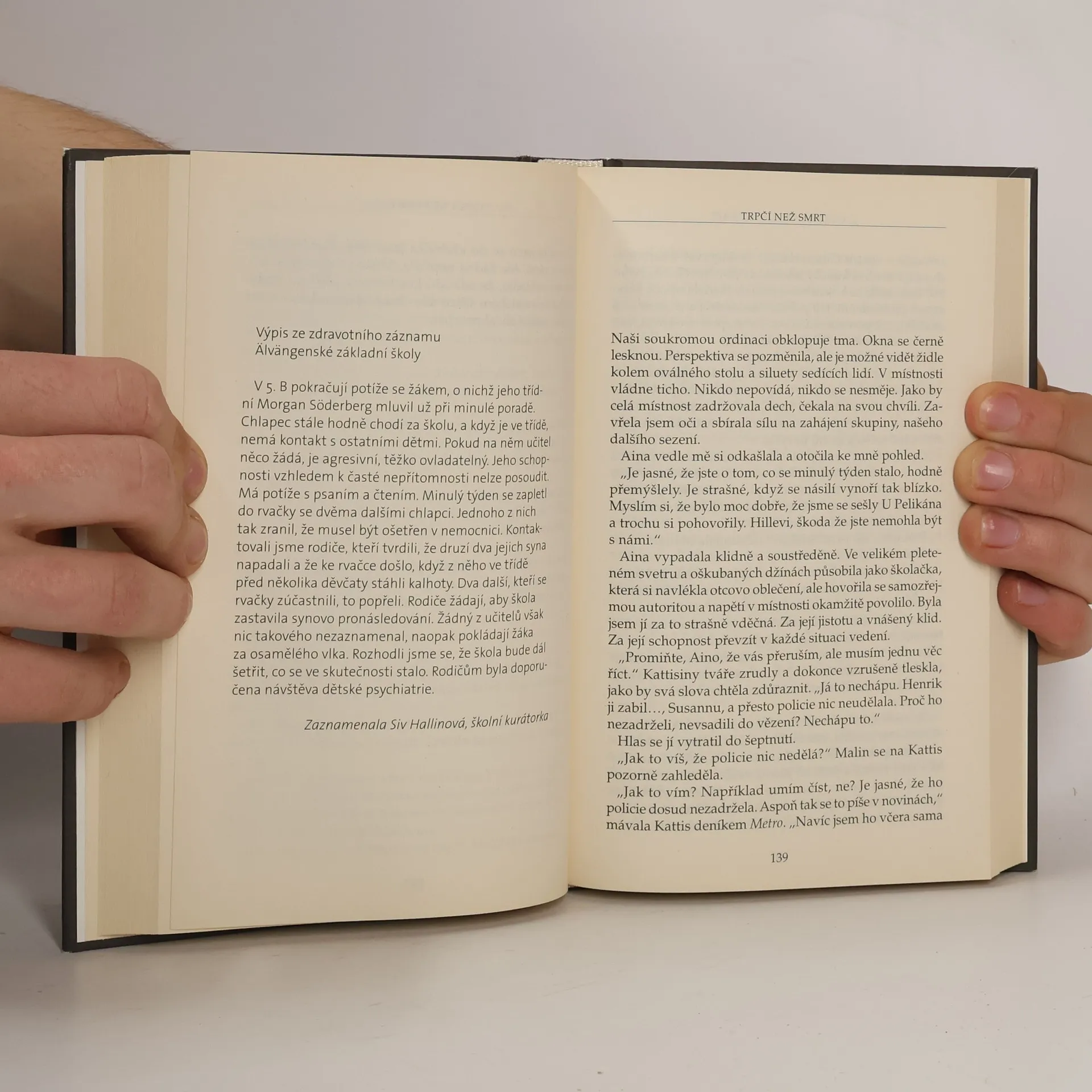 Severský krimiromán Druhý psychologicko-detektivní román s psycholožkou Siri Bergmanovou. V podzimním stockholmském večeru se pětiletá Tilde stane svědkem vraždy své matky, kterou neznámý muž ukopal k smrti. Jde o neobyčejně brutální vraždu. Holčička seděla ve svém domečku pod ubrusem stolu, kde si vždycky malovala. Pachatel je nezahlédl, ona sama pod ubrusem viděla jen jeho nohy. Nevěděla, co dělat, a ve svém úkrytu zůstala až do noci, kdy ji objevil náhodný roznašeč reklamních letáků.